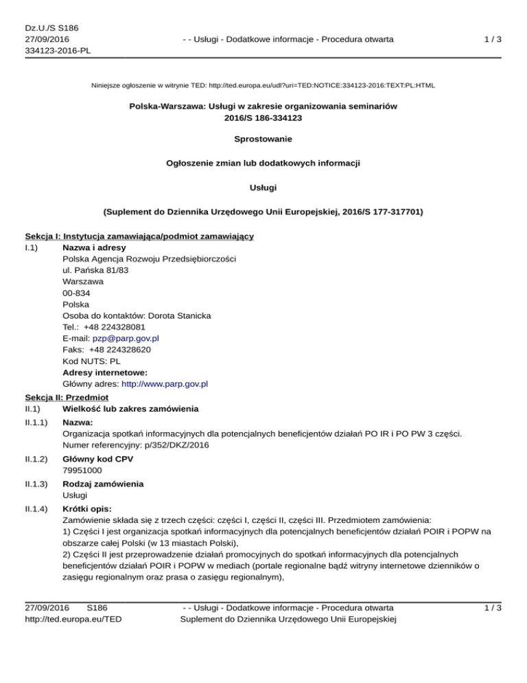 Dz.U./S S186 27/09/2016 334123-2016-PL - - Usługi - Dodatkowe informacje - Procedura otwarta 1/3 Niniejsze ogłoszenie w witrynie TED: http://ted.europa.eu/udl?uri=TED:NOTICE:334123-2016:TEXT:PL:HTML Polska-Warszawa: Usługi w zakresie organizowania seminariów 2016/S 186-334123 Sprostowanie Ogłoszenie zmian lub dodatkowych informacji Usługi (Suplement do Dziennika Urzędowego Unii Europejskiej, 2016/S 177-317701) Sekcja I: Instytucja zamawiająca/podmiot zamawiający I.1) Nazwa i adresy Polska Agencja Rozwoju Przedsiębiorczości ul. Pańska 81/83 Warszawa 00-834 Polska Osoba do kontaktów: Dorota Stanicka Tel.: +48 224328081 E-mail: [email protected] Faks: +48 224328620 Kod NUTS: PL Adresy internetowe: Główny adres: http://www.parp.gov.pl Sekcja II: Przedmiot II.1) Wielkość lub zakres zamówienia II.1.1) Nazwa: Organizacja spotkań informacyjnych dla potencjalnych beneficjentów działań PO IR i PO PW 3 części. Numer referencyjny: p/352/DKZ/2016 II.1.2) Główny kod CPV 79951000 II.1.3) Rodzaj zamówienia Usługi II.1.4) Krótki opis: Zamówienie składa się z trzech części: części I, części II, części III. Przedmiotem zamówienia: 1) Części I jest organizacja spotkań informacyjnych dla potencjalnych beneficjentów działań POIR i POPW na obszarze całej Polski (w 13 miastach Polski), 2) Części II jest przeprowadzenie działań promocyjnych do spotkań informacyjnych dla potencjalnych beneficjentów działań POIR i POPW w mediach (portale regionalne bądź witryny internetowe dzienników o zasięgu regionalnym oraz prasa o zasięgu regionalnym), 27/09/2016 S186 http://ted.europa.eu/TED - - Usługi - Dodatkowe informacje - Procedura otwarta Suplement do Dziennika Urzędowego Unii Europejskiej 1/3 Dz.U./S S186 27/09/2016 334123-2016-PL - - Usługi - Dodatkowe informacje - Procedura otwarta 2/3 3) Części III jest produkcja materiałów promocyjnych POIR i POPW na potrzeby spotkań informacyjnych dla potencjalnych beneficjentów działań POIR i POPW odbywających się w 13 miastach Polski oraz dostarczenie materiałów promocyjnych na poszczególne spotkania informacyjne. Zamawiający wyprodukuje łącznie 650 zestawów materiałów promocyjnych, w tym 400 zestawów POIR i 250 zestawów POPW. Poprzez zestaw Zamawiający rozumie: torba papierowa, notes w komplecie z długopisem. Sekcja VI: Informacje uzupełniające VI.5) Data wysłania niniejszego ogłoszenia: 23/09/2016 VI.6) Numer pierwotnego ogłoszenia Numer ogłoszenia w Dz.Urz. UE – OJ/S: 2016/S 177-317701 Sekcja VII: Zmiany VII.1) Informacje do zmiany lub dodania VII.1.2) Tekst, który należy poprawić w pierwotnym ogłoszeniu Numer sekcji: II.2.14 Część nr: 1 Miejsce, w którym znajduje się tekst do modyfikacji: Informacje dodatkowe Zamiast: Termin realizacji zamówienia podany w punkcie II 2.7) jest terminem orientacyjnym. Zamówienie będzie realizowane po wyborze oferty i zawarciu umowy. Powinno być: 1. Termin początku realizacji zamówienia podany w punkcie II 2.7) jest terminem orientacyjnym. Zamówienie będzie realizowane po wyborze oferty i zawarciu umowy. 2. Zamawiający przed upływem terminu składania ofert, zgodnie z § 10 ust. 1 SIWZ wymaga wniesienia wadium w wysokości wskazanej w SIWZ. Numer sekcji: II.2.14 Część nr: 2 Miejsce, w którym znajduje się tekst do modyfikacji: Informacje dodatkowe Zamiast: Termin realizacji zamówienia podany w punkcie II 2.7) jest terminem orientacyjnym. Zamówienie będzie realizowane po wyborze oferty i zawarciu umowy. Powinno być: 1. Termin początku realizacji zamówienia podany w punkcie II 2.7) jest terminem orientacyjnym. Zamówienie będzie realizowane po wyborze oferty i zawarciu umowy. 2. Zamawiający przed upływem terminu składania ofert, zgodnie z § 10 ust. 1 SIWZ wymaga wniesienia wadium w wysokości wskazanej w SIWZ. Numer sekcji: II.2.14 Część nr: 3 Miejsce, w którym znajduje się tekst do modyfikacji: Informacje dodatkowe Zamiast: Termin realizacji zamówienia podany w punkcie II 2.7) jest terminem orientacyjnym. Zamówienie będzie realizowane po wyborze oferty i zawarciu umowy. Powinno być: 1. Termin początku realizacji zamówienia podany w punkcie II 2.7) jest terminem orientacyjnym. Zamówienie będzie realizowane po wyborze oferty i zawarciu umowy. 27/09/2016 S186 http://ted.europa.eu/TED - - Usługi - Dodatkowe informacje - Procedura otwarta Suplement do Dziennika Urzędowego Unii Europejskiej 2/3 Dz.U./S S186 27/09/2016 334123-2016-PL - - Usługi - Dodatkowe informacje - Procedura otwarta 3/3 2. Zamawiający przed upływem terminu składania ofert, zgodnie z § 10 ust. 1 SIWZ wymaga wniesienia wadium w wysokości wskazanej w SIWZ. Numer sekcji: VI.3 Część nr: 1, 2, 3 Miejsce, w którym znajduje się tekst do modyfikacji: Informacje dodatkowe Zamiast: 2. O udzielenie zamówienia mogą ubiegać się wykonawcy, którzy nie podlegają wykluczeniu z postępowania z powodu jednej z okoliczności wskazanych w art. 24 ust. 5 uPzp, które wystąpiły w odpowiednim okresie określonym w art. 24 ust. 7 uPzp. Powinno być: 2. O udzielenie zamówienia mogą ubiegać się wykonawcy, którzy nie podlegają wykluczeniu z postępowania z powodu jednej z okoliczności wskazanych w art. 24 ust. 5 pkt 1-3 uPzp, które wystąpiły w odpowiednim okresie określonym w art. 24 ust. 7 uPzp. VII.2) Inne dodatkowe informacje: 27/09/2016 S186 http://ted.europa.eu/TED - - Usługi - Dodatkowe informacje - Procedura otwarta Suplement do Dziennika Urzędowego Unii Europejskiej 3/3