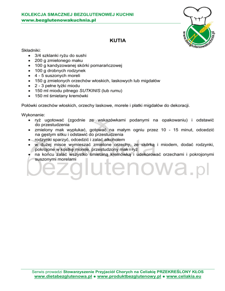 KOLEKCJA SMACZNEJ BEZGLUTENOWEJ KUCHNI www.bezglutenowakuchnia.pl KUTIA Składniki: 3/4 szklanki ryżu do sushi 200 g zmielonego maku 100 g kandyzowanej skórki pomarańczowej 100 g drobnych rodzynek 4 - 5 suszonych moreli 150 g zmielonych orzechów włoskich, laskowych lub migdałów 2 - 3 pełne łyżki miodu 150 ml miodu pitnego SUTKINIS (lub rumu) 150 ml śmietany kremówki Połówki orzechów włoskich, orzechy laskowe, morele i płatki migdałów do dekoracji. Wykonanie: ryż ugotować (zgodnie ze wskazówkami podanymi na opakowaniu) i odstawić do przestudzenia zmielony mak wypłukać, gotować na małym ogniu przez 10 - 15 minut, odcedzić na gęstym sitku i odstawić do przestudzenia rodzynki sparzyć, odcedzić i zalać alkoholem w dużej misce wymieszać zmielone orzechy, ze skórką i miodem, dodać rodzynki, pokrojone w kostkę morele, przestudzony mak i ryż na końcu zalać wszystko śmietaną kremówką i udekorować orzechami i pokrojonymi suszonymi morelami Serwis prowadzi Stowarzyszenie Przyjaciół Chorych na Celiakię PRZEKREŚLONY KŁOS www.dietabezglutenowa.pl ● www.produktbezglutenowy.pl ● www.celiakia.eu
