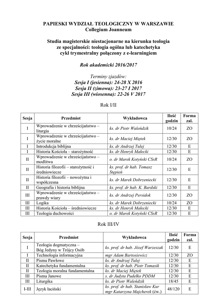 PAPIESKI WYDZIAŁ TEOLOGICZNY W WARSZAWIE Collegium Joanneum Studia magisterskie niestacjonarne na kierunku teologia ze specjalności: teologia ogólna lub katechetyka cykl trymestralny połączony z e-learningiem Rok akademicki 2016/2017 Terminy zjazdów: Sesja I (jesienna): 24-28 X 2016 Sesja II (zimowa): 23-27 I 2017 Sesja III (wiosenna): 22-26 V 2017 Rok I/II Sesja I I I I II II II II III III III III Ilość godzin Forma zal. ks. dr Piotr Waleńdzik 10/24 ZO ks. dr Maciej Miętek 12/30 ZO ks. dr Andrzej Tulej ks. dr Henryk Małecki 12/30 12/30 E E o. dr Marek Kotyński CSsR 10/24 ZO ks. prof. dr hab. Tomasz Stępień 12/30 E ks. dr Marek Dobrzeniecki 12/30 E ks. prof. dr hab. K. Bardski 12/30 E ks. dr Andrzej Persidok 12/30 ZO ks. dr Marek Dobrzeniecki ks. dr Henryk Małecki o. dr Marek Kotyński CSsR 10/24 12/30 12/30 ZO E E Przedmiot Wykładowca Wprowadzenie w chrześcijaństwo – liturgia Wprowadzenie w chrześcijaństwo – życie moralne Introdukcja biblijna Historia Kościoła – starożytność Wprowadzenie w chrześcijaństwo – modlitwa Historia filozofii – starożytność i średniowiecze Historia filozofii – nowożytna i współczesna Geografia i historia biblijna Wprowadzenie w chrześcijaństwo – prawdy wiary Logika Historia Kościoła – średniowiecze Teologia duchowości Rok III/IV Sesja I I II II II III III I-III Przedmiot Teologia dogmatyczna – Bóg Jedyny w Trójcy Osób Technologia informacyjna Pisma Pawłowe Katechetyka fundamentalna Teologia moralna fundamentalna Pisma Janowe Liturgika Język łaciński Wykładowca Ilość Forma godzin zal. ks. prof. dr hab. Józef Warzeszak 12/30 E mgr Adam Bartosiewicz ks. dr Andrzej Tulej ks. prof. dr hab. Piotr Tomasik ks. dr Maciej Miętek s. dr Judyta Pudełko PDDM ks. dr Piotr Waleńdzik ks. prof. dr hab. Stanisław Kur mgr Katarzyna Majcherek (ćw.) 12/30 12/30 12/30 12/30 12/30 18/45 ZO E E E E E 48/120 E Rok V/VI Sesja I I I I I II II II II II III III III III III Przedmiot Teologia dogmatyczna – sakramentologia Katolicka Nauka Społeczna K: Dydaktyka ogólna K: Psychologia rozwojowa T: Sakramenty w życiu chrześcijańskim Teologia dogmatyczna – eklezjologia i mariologia Ekumenizm K: Katechetyka dzieci K: Pedagogika ogólna T: Eschatologie nadziei Teologia moralna szczegółowa życia społecznego Religiologia K: Katechetyka specjalna K: Pedagogika specjalna T: Rok liturgiczny – historia i teologia I-III Seminarium magisterskie I-III Lektorat języka angielskiego – e-learning i konsultacje Ilość godzin Forma zal. ks. dr Maciej Raczyński-Rożek 12/30 E ks. dr Piotr Burgoński dr hab. Grzegorz Grochowski ks. mgr lic. Marcin Kłosowski ks. dr hab. Mieczysław Olszewski 12/30 6/15 12/30 E ZO E 12/30 E o. dr hab. Michał Paluch OP 12/30 E ks. dr Arkadiusz Szczepanik dr hab. Grzegorz Grochowski dr Marzanna Dubińska ks. dr Maciej Raczyński-Rożek 12/30 6/15 12/30 12/30 E ZO E E ks. dr Maciej Miętek 12/30 E ks. dr Arkadiusz Szczepanik dr hab. Grzegorz Grochowski dr Marzanna Dubińska Ks. prof. dr hab. Józef Naumowicz ks. dr hab. Mieczysław Olszewski (teologia) dr hab. Grzegorz Grochowski (katechetyka) 12/30 6/15 12/30 E ZO E 12/30 E 12/30 Z 120 ZO Wykładowca mgr Monika Nowosielska K – specjalność katechetyczna T – specjalność „Teologia ogólna” E – egzamin ZO – zaliczenie na ocenę Z – zaliczenie Zapis 12/30 oznacza, że 12 godzin (z 30 godzin przewidzianych w planie zajęć) realizowanych jest w ramach wykładu w siedzibie uczelni, a pozostałych 18 godzin obejmuje materiał przekazany za pośrednictwem Internetu.