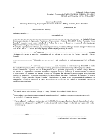 Załącznik do Regulaminu Sprzedaży Premiowej „WYPOCZYNEK Z TETISEM 2016/2017. DUBAJ, AUSTRALIA, NOWA ZALANDIA” Deklaracja Uczestnika Sprzedaży Premiowej „Wypoczynek z Tetisem 2016/2017. Dubaj, Australia, Nowa Zelandia” Ja …..………………………………….............................................…, oświadczam, że (imię i nazwisko, funkcja) podmiot gospodarczy …………………………………….……………………………. (nazwa i adres) ………………………………………………………………………………………………. , w imieniu którego działam przystępuje do Sprzedaży Premiowej „Wypoczynek z Tetisem 2016/2017. Dubaj, Australia, Nowa Zelandia” organizowanej przez Michalczyk i Prokop Sp. z o.o. w Łodzi na warunkach obowiązującego Regulaminu, którego postanowienia są mi znane. W związku z powyższym deklaruję, że podmiot gospodarczy, w imieniu którego działam zakupi w okresie od 1.01.2016 r. do 31.12. 2017 r. produkty z grupy TETIS objęte promocją za kwotę: .……………………………. zł A (słownie: …………………………………….…………………………zł) netto i jednocześnie proszę o sprzedaż, uprawniających do udziału w wycieczce do Dubaju, Australii i Nowej Zelandii: ……………………….…. oraz B (słownie:…………………) szt. voucherów w cenie promocyjnej 1,23 zł brutto, ……………………….... C (słownie:……………………) szt. vouchera w cenie rynkowej 28.000,00 zł brutto dla osoby towarzyszącej, które podmiot gospodarczy, przeze mnie reprezentowany zobowiązuje się zakupić. Jeżeli w okresie od 1 stycznia 2016 r. do 31 grudnia 2017 r. podmiot gospodarczy, w imieniu którego działam, nie dokona u Organizatora zakupów produktów objętych niniejszą promocją w zadeklarowanej wysokości to oświadczam, że podmiot ten dokona dopłaty za zakupione na warunkach promocyjnych u Organizatora vouchery w wysokości i na zasadach określonych w Regulaminie Sprzedaży Premiowej „Wypoczynek z Tetisem 2016/2017. Dubaj, Australia, Nowa Zelandia”. Oświadczam, że znane są mi postanowienia Regulaminu, że rezygnacja z udziału w promocji w tym z uczestnictwa w wycieczce nie zwalnia z obowiązku zapłaty za zadeklarowane vouchery. A Uczestnik może zadeklarować zakupy za kwoty: 380.000 zł netto lub 760.000 zł netto. B Uczestnikowi przysługuje prawo zakupu 1 lub maksymalnie 2 voucherów na promocyjnych warunkach, w cenie 1,23 zł brutto za voucher. C Prawo zakupu 1 vouchera, w cenie rynkowej 28.000,00 zł brutto, przysługuje wyłącznie Uczestnikowi, który zadeklarował zakupy za kwotę 380.000 zł netto. Uczestnik może wykupić voucher dla nie więcej niż 1 osoby towarzyszącej. ……………….., dnia …………………….. …………………………………………… czytelny podpis imieniem i nazwiskiem zalacznik Dubaj-Australia-NZelandia 2016-2017 1/1