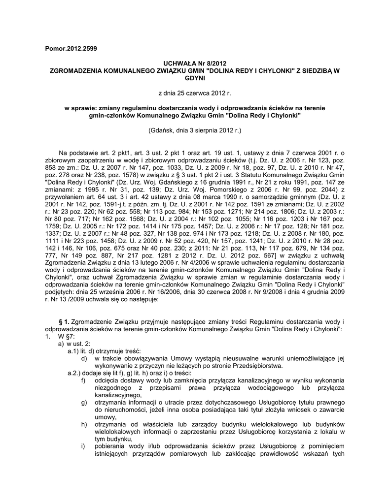 Pomor.2012.2599 UCHWAŁA Nr 8/2012 ZGROMADZENIA KOMUNALNEGO ZWIĄZKU GMIN "DOLINA REDY I CHYLONKI" Z SIEDZIBĄ W GDYNI z dnia 25 czerwca 2012 r. w sprawie: zmiany regulaminu dostarczania wody i odprowadzania ścieków na terenie gmin-członków Komunalnego Związku Gmin "Dolina Redy i Chylonki" (Gdańsk, dnia 3 sierpnia 2012 r.) Na podstawie art. 2 pkt1, art. 3 ust. 2 pkt 1 oraz art. 19 ust. 1, ustawy z dnia 7 czerwca 2001 r. o zbiorowym zaopatrzeniu w wodę i zbiorowym odprowadzaniu ścieków (t.j. Dz. U. z 2006 r. Nr 123, poz. 858 ze zm.: Dz. U. z 2007 r. Nr 147, poz. 1033, Dz. U. z 2009 r. Nr 18, poz. 97, Dz. U. z 2010 r. Nr 47, poz. 278 oraz Nr 238, poz. 1578) w związku z § 3 ust. 1 pkt 2 i ust. 3 Statutu Komunalnego Związku Gmin "Dolina Redy i Chylonki" (Dz. Urz. Woj. Gdańskiego z 16 grudnia 1991 r., Nr 21 z roku 1991, poz. 147 ze zmianami: z 1995 r. Nr 31, poz. 139; Dz. Urz. Woj. Pomorskiego z 2006 r. Nr 99, poz. 2044) z przywołaniem art. 64 ust. 3 i art. 42 ustawy z dnia 08 marca 1990 r. o samorządzie gminnym (Dz. U. z 2001 r. Nr 142, poz. 1591-j.t. z późn. zm. tj. Dz. U. z 2001 r. Nr 142 poz. 1591 ze zmianami; Dz. U. z 2002 r.: Nr 23 poz. 220; Nr 62 poz. 558; Nr 113 poz. 984; Nr 153 poz. 1271; Nr 214 poz. 1806; Dz. U. z 2003 r.: Nr 80 poz. 717; Nr 162 poz. 1568; Dz. U. z 2004 r.: Nr 102 poz. 1055; Nr 116 poz. 1203 i Nr 167 poz. 1759; Dz. U. 2005 r.: Nr 172 poz. 1414 i Nr 175 poz. 1457; Dz. U. z 2006 r.: Nr 17 poz. 128; Nr 181 poz. 1337; Dz. U. z 2007 r.: Nr 48 poz. 327, Nr 138 poz. 974 i Nr 173 poz. 1218; Dz. U. z 2008 r. Nr 180, poz. 1111 i Nr 223 poz. 1458; Dz. U. z 2009 r. Nr 52 poz. 420, Nr 157, poz. 1241; Dz. U. z 2010 r. Nr 28 poz. 142 i 146, Nr 106, poz. 675 oraz Nr 40 poz. 230; z 2011: Nr 21 poz. 113, Nr 117 poz. 679, Nr 134 poz. 777, Nr 149 poz. 887, Nr 217 poz. 1281 z 2012 r. Dz. U. 2012 poz. 567] w związku z uchwałą Zgromadzenia Związku z dnia 13 lutego 2006 r. Nr 4/2006 w sprawie uchwalenia regulaminu dostarczania wody i odprowadzania ścieków na terenie gmin-członków Komunalnego Związku Gmin "Dolina Redy i Chylonki", oraz uchwał Zgromadzenia Związku w sprawie zmian w regulaminie dostarczania wody i odprowadzania ścieków na terenie gmin-członków Komunalnego Związku Gmin "Dolina Redy i Chylonki" podjętych: dnia 25 września 2006 r. Nr 16/2006, dnia 30 czerwca 2008 r. Nr 9/2008 i dnia 4 grudnia 2009 r. Nr 13 /2009 uchwala się co następuje: § 1. Zgromadzenie Związku przyjmuje następujące zmiany treści Regulaminu dostarczania wody i odprowadzania ścieków na terenie gmin-członków Komunalnego Związku Gmin "Dolina Redy i Chylonki": 1. W §7: a) w ust. 2: a.1) lit. d) otrzymuje treść: d) w trakcie obowiązywania Umowy wystąpią nieusuwalne warunki uniemożliwiające jej wykonywanie z przyczyn nie leżących po stronie Przedsiębiorstwa. a.2.) dodaje się lit f), g) lit. h) oraz i) o treści: f) odcięcia dostawy wody lub zamknięcia przyłącza kanalizacyjnego w wyniku wykonania niezgodnego z przepisami prawa przyłącza wodociągowego lub przyłącza kanalizacyjnego, g) otrzymania informacji o utracie przez dotychczasowego Usługobiorcę tytułu prawnego do nieruchomości, jeżeli inna osoba posiadająca taki tytuł złożyła wniosek o zawarcie umowy, h) otrzymania od właściciela lub zarządcy budynku wielolokalowego lub budynków wielolokalowych informacji o zaprzestaniu przez Usługobiorcę korzystania z lokalu w tym budynku, i) pobierania wody i/lub odprowadzania ścieków przez Usługobiorcę z pominięciem istniejących przyrządów pomiarowych lub zakłócając prawidłowość wskazań tych 2. 3. 4. 5. 6. 7. 8. przyrządów. b) skreśla się ust. 3. W §15: a) ust. 1 otrzymuje treść: 1. W przypadku: a) nie dokonania odczytu z powodu braku dostępu do wodomierza głównego i/lub urządzenia pomiarowego, b) nie przekazania przez Usługobiorcę danych o wskazaniach) wodomierza głównego i/lub urządzenia pomiarowego, c) niesprawności wodomierza głównego i/lub urządzenia pomiarowego Przedsiębiorstwo ma prawo ustalić należność za pobraną wodę i/lub odprowadzone ścieki na podstawie średniego zużycia wody przez Usługobiorcę w okresie trzech miesięcy przed stwierdzeniem wystąpienia wyżej wymienionego zdarzenia, a jeżeli Przedsiębiorstwo nie ma możliwości określenia poboru wody w ten sposób, określenie tego poboru nastąpi na podstawie średniego zużycia wody w analogicznym okresie roku ubiegłego lub iloczynu średniomiesięcznego zużycia wody w roku ubiegłym i liczby miesięcy występowania tych zdarzeń. W przypadku jednak, gdy na skutek okoliczności, za które odpowiedzialność ponosi Usługobiorca, ustalenie należności w sposób opisany powyżej nie jest możliwe, Przedsiębiorstwo ustali należność w oparciu o przeciętne normy zużycia wody wynikające z powszechnie obowiązujących przepisów prawa. b) skreśla się ust. 3, c) ust. 8 otrzymuje brzmienie: 8. W przypadku bezumownego poboru wody z urządzeń wodociągowych lub wprowadzania ścieków do urządzeń kanalizacyjnych, Przedsiębiorstwu przysługują roszczenia odszkodowawcze z tego tytułu. d) skreśla się ust. 9. e) skreśla się ust. 10. W §16 skreśla się ust. 3. W §21 ust. 1 otrzymuje treść: 1. Przedstawiciele Przedsiębiorstwa, po okazaniu legitymacji służbowej i pisemnego upoważnienia, mają prawo wstępu na teren nieruchomości lub do pomieszczeń Usługobiorcy w celu 1) zainstalowania lub demontażu wodomierza głównego; 2) przeprowadzenia kontroli urządzenia pomiarowego, wodomierza głównego lub wodomierzy zainstalowanych przy punktach czerpalnych i dokonania odczytu ich wskazań oraz dokonania badań i pomiarów; 3) przeprowadzenia przeglądów i napraw urządzeń posiadanych przez to przedsiębiorstwo; 4) sprawdzenia ilości i jakości ścieków wprowadzanych do sieci; 5) odcięcia przyłącza wodociągowego lub przyłącza kanalizacyjnego lub założenia plomb na zamkniętych zaworach odcinających dostarczan