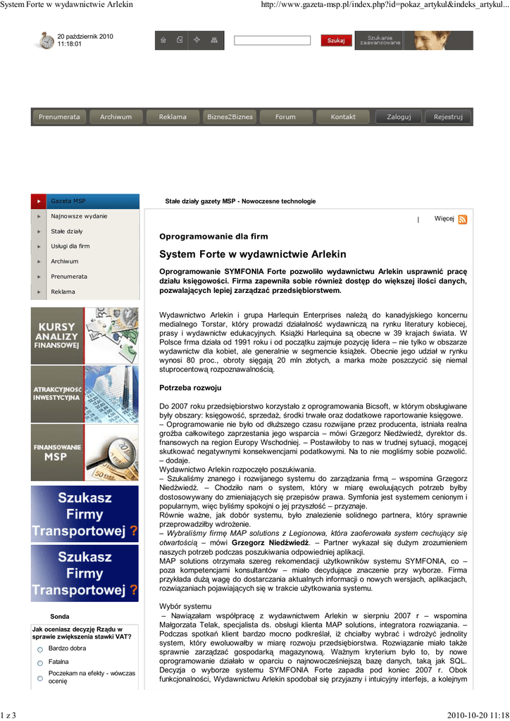 System Forte w wydawnictwie Arlekin 1z3 http://www.gazeta-msp.pl/index.php?id=pokaz_artykul&indeks_artykul... 20 październik 2010 11:18:01 Gazeta MSP Stałe działy gazety MSP - Nowoczesne technologie Najnowsze wydanie Stałe działy Usługi dla firm Archiwum Prenumerata Reklama | Więcej Oprogramowanie dla firm System Forte w wydawnictwie Arlekin Oprogramowanie SYMFONIA Forte pozwoliło wydawnictwu Arlekin usprawnić pracę działu księgowości. Firma zapewniła sobie również dostęp do większej ilości danych, pozwalających lepiej zarządzać przedsiębiorstwem. Wydawnictwo Arlekin i grupa Harlequin Enterprises należą do kanadyjskiego koncernu medialnego Torstar, który prowadzi działalność wydawniczą na rynku literatury kobiecej, prasy i wydawnictw edukacyjnych. Książki Harlequina są obecne w 39 krajach świata. W Polsce frma działa od 1991 roku i od początku zajmuje pozycję lidera – nie tylko w obszarze wydawnictw dla kobiet, ale generalnie w segmencie książek. Obecnie jego udział w rynku wynosi 80 proc., obroty sięgają 20 mln złotych, a marka może poszczycić się niemal stuprocentową rozpoznawalnością. Potrzeba rozwoju Do 2007 roku przedsiębiorstwo korzystało z oprogramowania Bicsoft, w którym obsługiwane były obszary: księgowość, sprzedaż, środki trwałe oraz dodatkowe raportowanie księgowe. – Oprogramowanie nie było od dłuższego czasu rozwijane przez producenta, istniała realna groźba całkowitego zaprzestania jego wsparcia – mówi Grzegorz Niedźwiedź, dyrektor ds. fnansowych na region Europy Wschodniej. – Postawiłoby to nas w trudnej sytuacji, mogącej skutkować negatywnymi konsekwencjami podatkowymi. Na to nie mogliśmy sobie pozwolić. – dodaje. Wydawnictwo Arlekin rozpoczęło poszukiwania. – Szukaliśmy znanego i rozwijanego systemu do zarządzania frmą – wspomina Grzegorz Niedźwiedź. – Chodziło nam o system, który w miarę ewoluujących potrzeb byłby dostosowywany do zmieniających się przepisów prawa. Symfonia jest systemem cenionym i popularnym, więc byliśmy spokojni o jej przyszłość – przyznaje. Równie ważne, jak dobór systemu, było znalezienie solidnego partnera, który sprawnie przeprowadziłby wdrożenie. – Wybraliśmy firmę MAP solutions z Legionowa, która zaoferowała system cechujący się otwartością – mówi Grzegorz Niedźwiedź. – Partner wykazał się dużym zrozumieniem naszych potrzeb podczas poszukiwania odpowiedniej aplikacji. MAP solutions otrzymała szereg rekomendacji użytkowników systemu SYMFONIA, co – poza kompetencjami konsultantów – miało decydujące znaczenie przy wyborze. Firma przykłada dużą wagę do dostarczania aktualnych informacji o nowych wersjach, aplikacjach, rozwiązaniach pojawiających się w trakcie użytkowania systemu. Sonda Jak oceniasz decyzję Rządu w sprawie zwiększenia stawki VAT? Bardzo dobra Fatalna Poczekam na efekty - wówczas ocenię Wybór systemu – Nawiązałam współpracę z wydawnictwem Arlekin w sierpniu 2007 r – wspomina Małgorzata Telak, specjalista ds. obsługi klienta MAP solutions, integratora rozwiązania. – Podczas spotkań klient bardzo mocno podkreślał, iż chciałby wybrać i wdrożyć jednolity system, który ewoluowałby w miarę rozwoju przedsiębiorstwa. Rozwiązanie miało także sprawnie zarządzać gospodarką magazynową. Ważnym kryterium było to, by nowe oprogramowanie działało w oparciu o najnowocześniejszą bazę danych, taką jak SQL. Decyzja o wyborze systemu SYMFONIA Forte zapadła pod koniec 2007 r. Obok funkcjonalności, Wydawnictwu Arlekin spodobał się przyjazny i intuicyjny interfejs, a kolejnym 2010-10-20 11:18 System Forte w wydawnictwie Arlekin 2z3 Nie mam zdania Nie było innego wyjścia Głosuj produkt, usługa Wybierz region http://www.gazeta-msp.pl/index.php?id=pokaz_artykul&indeks_artykul... atutem była cena aplikacji w relacji do możliwości jej łatwego rozwoju, uwzględniającego specyfikę branży medialnej. – Wybraliśmy SYMFONIĘ Forte, bo to zintegrowany system, który w miarę rozwoju naszej firmy pozwoli wprowadzać dodatkowe moduły, które obejmą kolejne obszary naszej działalności – tłumaczy Grzegorz Niedźwiedź. Trafność wyboru potwierdzały także liczne referencje, m.in. z branży wydawniczej. Analizując dostępne na rynku systemy doceniono łatwość integracji SYMFONII Forte z innym oprogramowaniem funkcjonującym w wydawnictwie, m.in. sklepem internetowym. Wdrożenie W Wydawnictwie Arlekin wdrożono moduły: Finanse i Księgowość Forte, Rozliczenie Międzyokresowe Kosztów Forte, Handel Forte, Środki Trwałe Forte oraz Nasz Bank. Dodatkowo zaimplementowano rozwiązanie do modułu FK Forte: automatyczne przeksięgowanie zapisów z kont 601 na 501 według przyjętego wzoru. Zdecydowano się także na wprowadzenie nowych zasad dokumentacji zasobów magazynowych wydawnictwa i objęcie tego obszaru całkowitym nadzorem systemu. Z oprogramowania korzysta obecnie dział finansowo - księgowy, dział sprzedaży wraz z magazynami firmy oraz dział windykacji i bankowości elektronicznej. Do użytkowników należy dodać także pracowników zajmujących się wyposażeniem, środkami trwałymi oraz wartościami niematerialnymi i prawnymi – dodaje Grzegorz Niedźwiedź. Implementację rozwiązania przeprowadziła MAP solutions, która obecnie nadzoruje prawidłowe funkcjonowanie systemu. – Klient oczekiwał, że proces wdrożenia rozwiązania usprawniającego funkcjonowanie firmy nie zakłóci normalnego trybu pracy przedsiębiorstwa i w żaden sposób nie wpłynie na obsługę klientów – myślę, że udało się nam to zapewnić – mówi Małgorzata Telak. Wdrożenie przebiegało w trzech etapach. – Na początku dokonano instalacji SYMFONII wraz z towarzyszącą jej bazą MS SQL na siedmiu stanowiskach. Główną bazę danych umieszczono na serwerze, a SYMFONIĘ – na komputerach działających w sieci lokalnej – wspomina Konra