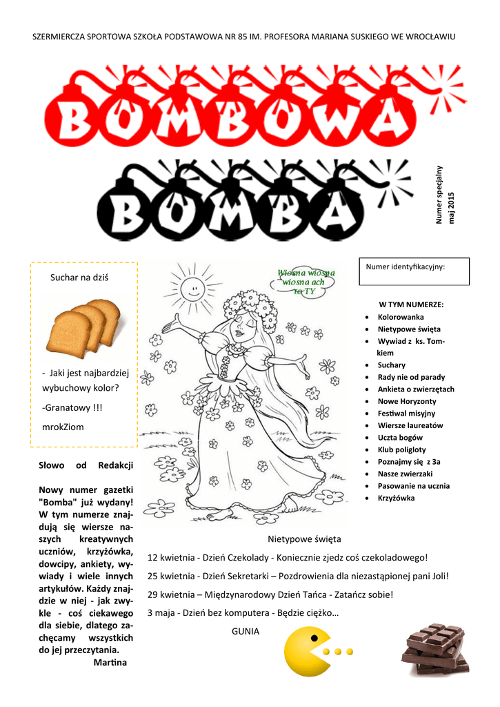 Numer specjalny maj 2015 SZERMIERCZA SPORTOWA SZKOŁA PODSTAWOWA NR 85 IM. PROFESORA MARIANA SUSKIEGO WE WROCŁAWIU Numer identyfikacyjny: Suchar na dziś - Jaki jest najbardziej wybuchowy kolor? -Granatowy !!! mrokZiom Słowo od Redakcji Nowy numer gazetki "Bomba" już wydany! W tym numerze znajdują się wiersze naszych kreatywnych uczniów, krzyżówka, dowcipy, ankiety, wywiady i wiele innych artykułów. Każdy znajdzie w niej - jak zwykle - coś ciekawego dla siebie, dlatego zachęcamy wszystkich do jej przeczytania. Martina W TYM NUMERZE: Kolorowanka Nietypowe święta Wywiad z ks. Tomkiem Suchary Rady nie od parady Ankieta o zwierzętach Nowe Horyzonty Festiwal misyjny Wiersze laureatów Uczta bogów Klub poligloty Poznajmy się z 3a Nasze zwierzaki Pasowanie na ucznia Krzyżówka Nietypowe święta 12 kwietnia - Dzień Czekolady - Koniecznie zjedz coś czekoladowego! 25 kwietnia - Dzień Sekretarki – Pozdrowienia dla niezastąpionej pani Joli! 29 kwietnia – Międzynarodowy Dzień Tańca - Zatańcz sobie! 3 maja - Dzień bez komputera - Będzie ciężko… GUNIA Nasi nauczyciele Wywiad z ks. Tomkiem Gospodarykiem, który pracuje w naszej szkole od początku roku szkolnego i uczy klasy 4 - 6 religii. - W jakiej parafii Ksiądz obecnie pracuje? - W parafii Najświętszego Imienia Jezus we Wrocławiu. - Dlaczego Ksiądz został Księdzem? - hm.. Powołanie to dar od Pana Boga, który odkryłem w swoim życiu i poszedłem za Jezusem. - Od ilu lat Ksiądz jest kapłanem? - Od 9 lat. - A od kiedy Ksiądz pracuje w swojej parafii? Od ostatnich wakacji. - Czy Księdzu dobrze pracuje się w naszej szkole? - Różnie bywa, ale jest ok. - Ile lat Ksiądz studiował, by być Księdzem? - W seminarium przygotowujemy się 6 lat. Czy Ksiądz był kiedyś ministrantem, lektorem? Od najmłodszych lat uczestniczyłem w życiu mojej parafii, pełniąc posługę ministranta, lektora... - Jaki był Księdza ulubiony sport w dzieciństwie? - Piłka nożna, i jest do tej pory. - Kiedy zrodziło się Księdza powołanie? - Kształtowało się gdzieś od najmłodszych lat, ale gdy byłem w szkole średniej i zastanawiałem się nad wyborem drogi życia, to wtedy zdecydowałem, że pójdę do seminarium. - Od kiedy Ksiądz gra na gitarze? - Nauczyłem się, gdy byłem na studiach. - Jakie Ksiądz ma hobby? - Lubię podróże, wędrówki po górach i wędrowanie szlakami Świętego Jakuba. - Czy lubi Ksiądz spowiadać? - Lubię pomagać ludziom, służąc Bożym miłosierdziem. - Czy Ksiądz miał w dzieciństwie jakieś zwierzątko? - Lubię zwierzęta, mam psa, a kiedyś miałem rybki :). - Czy Ksiądz lubi śpiewać? - Bardzo lubię śpiewać z dziećmi. - Dziękujemy Księdzu za udzielenie odpowiedzi na nasze pytania. - Proszę bardzo. Zola i Szermierz Rady nie od parady Jak zachować się w drodze ze szkoły do domu? 1.Przechodź przez pasy na zielonym świetle. 2.Zachowuj się kulturalnie. 3.Nie używaj wulgarnych słów. 4.Jadąc tramwajem lub autobusem, pamiętaj, żeby mieć zawsze przy sobie bilet. 5.Nie wsiadaj do obcych aut. 6.Nie wyrzucaj śmieci na chodnik. Suchar na dziś - Dlaczego beton nie chce iść do pracy? -Bo go wylali. mrokZiom 7.Nie chodź po ścieżkach rowerowych. 8.Rozglądaj się, gdy przechodzisz przez ulicę lub torowisko itp. 9.Wracaj prosto do domu, jeśli wcześniej nie uprzedziłeś rodziców, że się spóźnisz. 10.Jeśli czujesz się śledzony, to nie idź w uliczkę, gdzie nie ma ludzi. Szermierz Jakie jest Twoje ulubione zwierzę? żółw; 2 delfin; 1 ropucha; 2 papuga ;2 lis; 1 puma; 1 pingwin; 1 suseł; 1 1 wąż; 1 świnia; pantera; 1 waran z komodo; 1 lampart; 1 panda; 2 szynszyla; 3 wilk; 1 daniel; 2 pająk; 3 tygrys; 4 lama; 5 pies; 75 koń; 6 chomik; 7 świnka morska; 8 szczur; 8 rybki; 9 królik; 11 kot; 42 pies kot królik rybki szczur świnka morska chomik koń lama tygrys pająk szynszyla daniel panda papuga ropucha żółw delfin lampart lis pantera pingwin puma suseł świnia waran z komodo wąż wilk Batmanowata i Żaczek Wyjście do kina Nowe Horyzonty 13 kwietnia klasy 4-6 były w kinie „ Era Nowe Horyzonty” na filmie pt. „Felix”. Film opowiadał o chłopcu, który chciał spełniać swoje marzenia. Chciał zostać saksofonistą, tak jak jego ojciec, niestety mamie nie podobał się ten pomysł. Felix miał dużo trudności, żeby odnaleźć się i żeby przekonać swoją mamę. Udało mu się to dzięki jego przyjaciołom i starszym przyjaciołom jego ojca... Film nauczył nas, że nie wolno oceniać nikogo po wyglądzie i stanie posiadania oraz że nie można nikomu ubliżać. Film był bardzo ciekawy, czasem śmieszny i oparty na faktach. Podsumowując, stwierdzić trzeba, że film był świetny. Bardzo mi się on podobał. Polecam Chincu 23 kwietnia 2015 kościół św. Maurycego rozbrzmiewał piosenką religijną w wykonaniu dzieci. Działo się tak za przyczyną odbywającego się od kilku lat festiwalu organizowanego przez naszą Szkołę i Parafię św. Maurycego, który nosił nazwę: V Międzyszkolny Festiwal Piosenki Religijno-Misyjnej „Dzieci wszystkich Kontynentów Chwalcie Imię Pana, w rytmie... Alleluja". Festiwal Misyjny cławskich szkół podstawowych nr 44, 71 i 113. Wyróżnienie specjalne otrzymał nasz szkolny chór. Wyróżnione zostały także szkoły z Kątów Wrocławskich, Gniechowic oraz z Wrocławia: SP nr 21. 90 i 28. Nad przebiegiem całego Festiwalu czuwała pani katechetka - Magdalena Skuza, Dyrekcja i pozostali nauczyciele. Wszystkim laureatom gratulujemy i zapraszamy do nas za rok! Redakcja Zaprezentowały się 24 szkoły i 5 przedszkoli. Gośćmi specjalnymi festiwalu byli misjonarze : ojciec Eugeniusz Spyrka, klaretyn pracujący na Wybrzeżu Kości Słoniowej, oraz siostra Tadeusza Frąckiewicz, dominikanka pracująca od 16 lat w Kamerunie. Wśród czekających na uczestników atrakcji znalazł się krótki pokaz szermierki w wykonaniu uczniów SP nr 85 oraz występ zespołu Mały Asyż. WIERSZE ZDOB