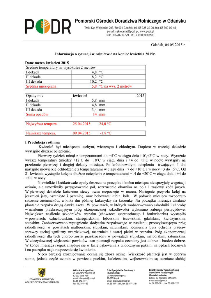 Pomorski Ośrodek Doradztwa Rolniczego w Gdańsku Trakt Św. Wojciecha 293, 80-001 Gdańsk, tel. 58 326-39-00, fax. 58 309-09-45, e-mail: [email protected], www.podr.pl NIP 583-28-80-729, REGON 003003186 Gdańsk, 04.05.2015 r. Informacja o sytuacji w rolnictwie na koniec kwietnia 2015r. Dane meteo kwiecień 2015 Średnie temperatury na wysokości 2 metrów I dekada 4,8 II dekada 8,2 III dekada 10,2 Średnia miesięczna 5,8 °C °C °C °C na wys. 2 metrów Opady m-c I dekada II dekada III dekada Suma opadów kwiecień Najwyższa tempera. 25.04.2015 24,0 °C Najniższe tempera. 09.04.2015 -1,8 °C 2015 5,8 4,8 3,4 14 mm mm mm mm I Produkcja roślinna Kwiecień był miesiącem suchym, wietrznym i chłodnym. Dopiero w trzeciej dekadzie wystąpiło dłuższe ocieplenie. Pierwszy tydzień minął z temperaturami do +5˚C w ciągu dnia i 0˚,+2˚C w nocy. Wyraźnie wyższe temperatury (między +12˚C do +18˚C w ciągu dnia i +4 do +5˚C w nocy) wystąpiły na przełomie pierwszej i drugiej dekady miesiąca. Po krótkotrwałym ociepleniu trwającym 4 dni nastąpiło niewielkie ochłodzenie z temperaturami w ciągu dnia +7 do +10˚C i w nocy +3 do +5˚C. Od 21 kwietnia wystąpiło kolejne dłuższe ocieplenie z temperaturami +14 do +20˚C w ciągu dnia i +4 do +5˚C w nocy. Niewielkie i krótkotrwałe opady deszczu na początku i końcu miesiąca nie sprzyjały wegetacji ozimin, ale umożliwiły przygotowanie pól, rozrzucenie obornika na pola i zasiewy zbóż jarych. W pierwszej dekadzie kończono siewy owsa rozpoczęte w marcu. Następnie przyszła kolej na jęczmień jary, pszenżyto i pszenicę, oraz bobowate: łubin, bób. W połowie miesiąca rozpoczęto sadzenie ziemniaków, a kilka dni później kukurydzy na kiszonkę. Na początku miesiąca zasilano plantacje rzepaku drugą dawką azotu. W powiatach, w których zaobserwowano szkodniki i choroby w nasileniu przekraczającym próg ekonomicznej szkodliwości wykonano zabiegi pestycydowe. Największe nasilenie szkodników rzepaku (chowacza czterozębnego i brukwiaczka) wystąpiło w powiatach: człuchowskim, starogardzkim, lęborskim, tczewskim, gdańskim, kwidzyńskim, słupskim. Zaobserwowano wystąpienie słodyszka rzepakowego w nasileniu przewyższającym próg szkodliwości w powiatach malborskim, słupskim, sztumskim. Konieczna była ochrona przeciw sprawcy suchej zgnilizny twardzikowej, mączniaka i szarej pleśni w rzepaku. Próg ekonomicznej szkodliwości dla tych chorób został przekroczony w powiatach słupskim, malborskim, sztumskim. W zdecydowanej większości powiatów stan plantacji rzepaku oceniany jest dobrze i bardzo dobrze. W końcu miesiąca rzepak znajduje się w fazie pąkowania z widocznymi pąkami na pędach bocznych i na początku maja rozpocznie się kwitnienie. Nieco bardziej zróżnicowanie ocenia się zboża ozime. Większość plantacji jest w dobrym stanie, jednak część ozimin w powiecie puckim, kościerskim, wejherowskim są oceniane słabiej Oddział w Starym Polu ul. Marynarki Wojennej 21 82-220 Stare Pole e-mail: [email protected] tel. 55 270-11-11, fax. 55 270-11-62 Dział Specjalistów Branżowych i Administracji ul. Poniatowskiego 4A, 76-200 Słupsk email: [email protected] tel. 59 847-12-88, fax. 59 847-12-81 Dział Systemów Produkcji Rolnej, Standardów Jakościowych i Doświadczalnictwa Lubań, 83-422 Nowy Barkoczyn e-mail:[email protected] tel. 58 688-20-11, fax. 58 688-22-52 (żółknące końce liści i jasno zielony kolor roślin). W raportach BP ODR z tych powiatów podaje się jako przyczynę objawów zimne i silne północne wiatry, które osłabiły zboża szczególnie na plantacjach, które nie otrzymały jeszcze drugiej dawki azotu. Rozpoczęto zabiegi ochronne przeciw grzybom sprawcom mączniaka prawdziwego i septoriozy liści na pszenicy i pszenżycie. Na jęczmieniu widoczne są objawy plamistości siatkowatej jęczmienia. Objawy w/w chorób wystąpiły powszechnie w kwietniu na terenie województwa pomorskiego, jednak przekroczenie progu ekonomicznej szkodliwości mączniaka stwierdzono w powiatach lęborskim i gdańskim. Ochrona przeciw chwastom była utrudniona z kilku powodów. Po pierwsze wiele chwastów tzw. zimujących nie tylko dobrze przetrwały zimę ale też bardzo wcześnie rozpoczęły rozwój. Jednocześnie temperatury bliskie zera w nocy, zagrożenie przymrozkami i silne wiatry uniemożliwiały wczesne wykonanie zabiegu herbicydowego. Pierwsze dogodne warunki wystąpiły od 22 kwietnia i trwały kilka dni. Wykonanie planu zasiewów gatunków jarych roślin rolniczych w kwietniu w woj. pomorskim w 2015 r. Grupa roślin lub gatunek % wykonania planu zasiewów Zboża jare 99 Kukurydza na ziarno 6 Kukurydza na kiszonkę 12 Ziemniaki 31 Buraki cukrowe 80 Podsumowując, jeśli w marcu nie stwierdzono w oziminach żadnych strat po zimie, oraz zazielenienie się plantacji, to kwiecień był miesiącem, w którym nastąpiło gwałtowne przyspieszenie wzrostu szczególnie w drugiej połowie miesiąca. Sucha pogoda umożliwiła wczesne przeprowadzenie siewu gatunków jarych, które w większości już wzeszły. Pod koniec kwietnia zboża ozime zaczęły strzelać w źdźbło i są dobrze rozkrzewione. Po długiej jesieni, łagodnej zimie widoczny jest duży potencjał infekcyjny chorób grzybowych na plantacjach zbóż ozimych. Ocena punktowa upraw ozimych w skali 1-5 pkt. pszenica jęczmień pszenżyto Lp. powiat żyto ozima ozimy ozime 1 Człuchów 4,0 4,0 4,0 4,0 2 Bytów 3,8 3,7 3,7 3,8 3 Lębork 4,0 4,0 4,0 4,0 4 Słupsk 3,5 3,5 3,5 3,5 5 Gdańsk 4,0 3,5-4,0 3,5 4,0 6 Tczew 4,0 4,0 4,0 4,0 7 Chojnice 3,0 3,0 3,0 3,0 8 Kartuzy 4,0 4,0 4,0 4,0 9 Kościerzyna 3,0 3,0 3,0 3,0 10 Wejherowo 4,5 4,5 4,2 4,2 11 Puck 4,1 4,0 3,6 4,4 12 Kwidzyn 3,8 4,2 3,2 4,1 13 Malbork 4,0 4,0 4,0 4,0 14 Nowy Dwór 4,0 4,0 4,0 4,0 15 Starogard Gdański 3,5 3,0 3,0 3,5 16 Sztum 4,0 3,0 4,0 3,0 Oddział w Starym Polu ul. Marynarki Wojennej 21 82-220 Stare Pole e-mail: [email protected] tel. 55 270-1