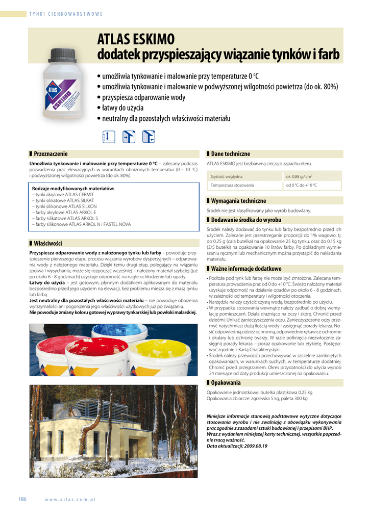 t ynki cienkowarst wowe ATLAS ESKIMO dodatek przyspieszający wiązanie tynków i farb • umożliwia tynkowanie i malowanie przy temperaturze 0 C • umożliwia tynkowanie i malowanie w podwyższonej wilgotności powietrza (do ok. 80%) • przyspiesza odparowanie wody • łatwy do użycia • neutralny dla pozostałych właściwości materiału o ■ Przeznaczenie ■ Dane techniczne Umożliwia tynkowanie i malowanie przy temperaturze 0 C – zalecany podczas prowadzenia prac elewacyjnych w warunkach obniżonych temperatur (0 - 10 oC) i podwyższonej wilgotności powietrza (do ok. 80%). o Rodzaje modyfikowanych materiałów: – tynki akrylowe ATLAS CERMIT – tynki silikatowe ATLAS SILKAT – tynki silikonowe ATLAS SILKON – farby akrylowe ATLAS ARKOL E – farby silikatowe ATLAS ARKOL S – farby silikonowe ATLAS ARKOL N i FASTEL NOVA ■ Właściwości Przyspiesza odparowanie wody z nałożonego tynku lub farby – powoduje przyspieszenie pierwszego etapu procesu wiązania wyrobów dyspersyjnych – odparowania wody z nałożonego materiału. Dzięki temu drugi etap, polegający na wiązaniu spoiwa i wysychaniu, może się rozpocząć wcześniej – nałożony materiał szybciej (już po około 6 - 8 godzinach) uzyskuje odporność na nagłe ochłodzenie lub opady. Łatwy do użycia – jest gotowym, płynnym dodatkiem aplikowanym do materiału bezpośrednio przed jego użyciem na elewacji, bez problemu miesza się z masą tynku lub farbą. Jest neutralny dla pozostałych właściwości materiału – nie powoduje obniżenia wytrzymałości ani pogorszenia jego właściwości użytkowych już po związaniu. Nie powoduje zmiany koloru gotowej wyprawy tynkarskiej lub powłoki malarskiej. ATLAS ESKIMO jest bezbarwną cieczą o zapachu eteru. Gęstość względna ok. 0,88 g / cm3 Temperatura stosowania od 0 °C do +10 °C ■ Wymagania techniczne Środek nie jest klasyfikowany jako wyrób budowlany. ■ Dodawanie środka do wyrobu Środek należy dodawać do tynku lub farby bezpośrednio przed ich użyciem. Zalecane jest przestrzeganie proporcji: do 1% wagowo, tj. do 0,25 g (cała butelka) na opakowanie 25 kg tynku. oraz do 0,15 kg (3/5 butelki) na opakowanie 10 litrów farby. Po dokładnym wymieszaniu ręcznym lub mechanicznym można przystąpić do nakładania materiału. ■ Ważne informacje dodatkowe • Podłoże pod tynk lub farbę nie może być zmrożone. Zalecana temperatura prowadzenia prac od 0 do +10 °C. Świeżo nałożony materiał uzyskuje odporność na działanie opadów po około 6 - 8 godzinach, w zależności od temperatury i wilgotności otoczenia. • Narzędzia należy czyścić czystą wodą, bezpośrednio po użyciu. • W przypadku stosowania wewnątrz należy zadbać o dobrą wentylację pomieszczeń. Działa drażniąco na oczy i skórę. Chronić przed dziećmi. Unikać zanieczyszczenia oczu. Zanieczyszczone oczy przemyć natychmiast dużą ilością wody i zasięgnąć porady lekarza. Nosić odpowiednią odzież ochronną, odpowiednie rękawice ochronne i okulary lub ochronę twarzy. W razie połknięcia niezwłocznie zasięgnij porady lekarza – pokaż opakowanie lub etykietę. Postępować zgodnie z Kartą Charakterystyki. • Środek należy przewozić i przechowywać w szczelnie zamkniętych opakowaniach, w warunkach suchych, w temperaturze dodatniej. Chronić przed przegrzaniem. Okres przydatności do użycia wynosi 24 miesiące od daty produkcji umieszczonej na opakowaniu. ■ Opakowania Opakowanie jednostkowe: butelka plastikowa 0,25 kg Opakowania zbiorcze: zgrzewka 5 kg, paleta 300 kg Niniejsze informacje stanowią podstawowe wytyczne dotyczące stosowania wyrobu i nie zwalniają z obowiązku wykonywania prac zgodnie z zasadami sztuki budowlanej i przepisami BHP. Wraz z wydaniem niniejszej karty technicznej, wszystkie poprzednie tracą ważność. Data aktualizacji: 2009.08.19 186 www.atlas.com.pl