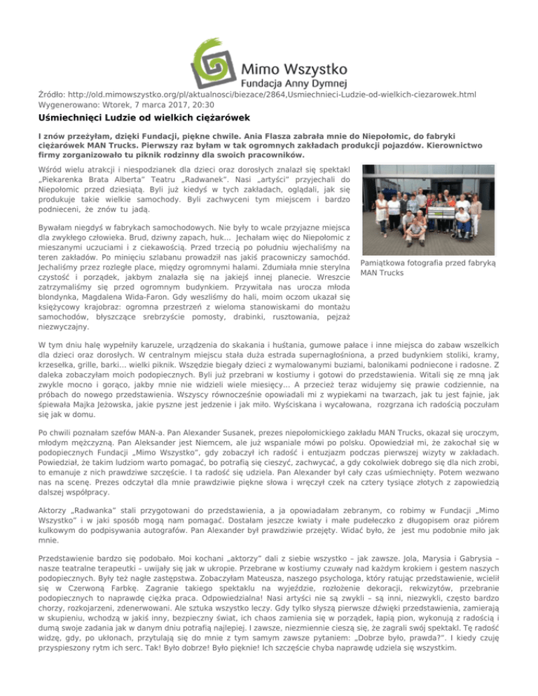 Źródło: http://old.mimowszystko.org/pl/aktualnosci/biezace/2864,Usmiechnieci-Ludzie-od-wielkich-ciezarowek.html Wygenerowano: Wtorek, 7 marca 2017, 20:30 Uśmiechnięci Ludzie od wielkich ciężarówek I znów przeżyłam, dzięki Fundacji, piękne chwile. Ania Flasza zabrała mnie do Niepołomic, do fabryki ciężarówek MAN Trucks. Pierwszy raz byłam w tak ogromnych zakładach produkcji pojazdów. Kierownictwo firmy zorganizowało tu piknik rodzinny dla swoich pracowników. Wśród wielu atrakcji i niespodzianek dla dzieci oraz dorosłych znalazł się spektakl „Piekarenka Brata Alberta” Teatru „Radwanek”. Nasi „artyści” przyjechali do Niepołomic przed dziesiątą. Byli już kiedyś w tych zakładach, oglądali, jak się produkuje takie wielkie samochody. Byli zachwyceni tym miejscem i bardzo podnieceni, że znów tu jadą. Bywałam niegdyś w fabrykach samochodowych. Nie były to wcale przyjazne miejsca dla zwykłego człowieka. Brud, dziwny zapach, huk… Jechałam więc do Niepołomic z mieszanymi uczuciami i z ciekawością. Przed trzecią po południu wjechaliśmy na teren zakładów. Po minięciu szlabanu prowadził nas jakiś pracowniczy samochód. Jechaliśmy przez rozległe place, między ogromnymi halami. Zdumiała mnie sterylna czystość i porządek, jakbym znalazła się na jakiejś innej planecie. Wreszcie zatrzymaliśmy się przed ogromnym budynkiem. Przywitała nas urocza młoda blondynka, Magdalena Wida-Faron. Gdy weszliśmy do hali, moim oczom ukazał się księżycowy krajobraz: ogromna przestrzeń z wieloma stanowiskami do montażu samochodów, błyszczące srebrzyście pomosty, drabinki, rusztowania, pejzaż niezwyczajny. Pamiątkowa fotografia przed fabryką MAN Trucks W tym dniu halę wypełniły karuzele, urządzenia do skakania i huśtania, gumowe pałace i inne miejsca do zabaw wszelkich dla dzieci oraz dorosłych. W centralnym miejscu stała duża estrada supernagłośniona, a przed budynkiem stoliki, kramy, krzesełka, grille, barki… wielki piknik. Wszędzie biegały dzieci z wymalowanymi buziami, balonikami podniecone i radosne. Z daleka zobaczyłam moich podopiecznych. Byli już przebrani w kostiumy i gotowi do przedstawienia. Witali się ze mną jak zwykle mocno i gorąco, jakby mnie nie widzieli wiele miesięcy… A przecież teraz widujemy się prawie codziennie, na próbach do nowego przedstawienia. Wszyscy równocześnie opowiadali mi z wypiekami na twarzach, jak tu jest fajnie, jak śpiewała Majka Jeżowska, jakie pyszne jest jedzenie i jak miło. Wyściskana i wycałowana, rozgrzana ich radością poczułam się jak w domu. Po chwili poznałam szefów MAN-a. Pan Alexander Susanek, prezes niepołomickiego zakładu MAN Trucks, okazał się uroczym, młodym mężczyzną. Pan Aleksander jest Niemcem, ale już wspaniale mówi po polsku. Opowiedział mi, że zakochał się w podopiecznych Fundacji „Mimo Wszystko”, gdy zobaczył ich radość i entuzjazm podczas pierwszej wizyty w zakładach. Powiedział, że takim ludziom warto pomagać, bo potrafią się cieszyć, zachwycać, a gdy cokolwiek dobrego się dla nich zrobi, to emanuje z nich prawdziwe szczęście. I ta radość się udziela. Pan Alexander był cały czas uśmiechnięty. Potem wezwano nas na scenę. Prezes odczytał dla mnie prawdziwie piękne słowa i wręczył czek na cztery tysiące złotych z zapowiedzią dalszej współpracy. Aktorzy „Radwanka” stali przygotowani do przedstawienia, a ja opowiadałam zebranym, co robimy w Fundacji „Mimo Wszystko” i w jaki sposób mogą nam pomagać. Dostałam jeszcze kwiaty i małe pudełeczko z długopisem oraz piórem kulkowym do podpisywania autografów. Pan Alexander był prawdziwie przejęty. Widać było, że jest mu podobnie miło jak mnie. Przedstawienie bardzo się podobało. Moi kochani „aktorzy” dali z siebie wszystko – jak zawsze. Jola, Marysia i Gabrysia – nasze teatralne terapeutki – uwijały się jak w ukropie. Przebrane w kostiumy czuwały nad każdym krokiem i gestem naszych podopiecznych. Były też nagłe zastępstwa. Zobaczyłam Mateusza, naszego psychologa, który ratując przedstawienie, wcielił się w Czerwoną Farbkę. Zagranie takiego spektaklu na wyjeździe, rozłożenie dekoracji, rekwizytów, przebranie podopiecznych to naprawdę ciężka praca. Odpowiedzialna! Nasi artyści nie są zwykli – są inni, niezwykli, często bardzo chorzy, rozkojarzeni, zdenerwowani. Ale sztuka wszystko leczy. Gdy tylko słyszą pierwsze dźwięki przedstawienia, zamierają w skupieniu, wchodzą w jakiś inny, bezpieczny świat, ich chaos zamienia się w porządek, łapią pion, wykonują z radością i dumą swoje zadania jak w danym dniu potrafią najlepiej. I zawsze, niezmiennie cieszą się, że zagrali swój spektakl. Tę radość widzę, gdy, po ukłonach, przytulają się do mnie z tym samym zawsze pytaniem: „Dobrze było, prawda?”. I kiedy czuję przyspieszony rytm ich serc. Tak! Było dobrze! Było pięknie! Ich szczęście chyba naprawdę udziela się wszystkim. Długo siedziałam przy stoliku i podpisywałam autografy, rozdawałam zdjęcia. Nasłuchałam się wiele życzliwych, dobrych słów. Ludzie noszą je w sobie, choć czasem tego na co dzień nie widać. W takich magicznych chwilach potrafią się nimi dzielić, rozdawać innym – a to dla mnie wielki skarb! Pod koniec wizyty, gdy nasi artyści już się przebrali, zrobiliśmy sobie wspólne zdjęcie z panem prezesem Alexandrem, z pracownikami MAN-a. Obok mnie cały czas czuwał Tadzik Mękarski, dyrektor „Doliny Słońca” i Ania Flasza, pracownica dziełu fundraisingu w mojej Fundacji, która w tym dniu była też naszym kierowcą. Niestety, musiałam szybko wracać do Krakowa, by zdążyć na 85. urodziny Wojciecha Plewińskiego, wielkiego fotografa, którego spotkałam na początku swojej zawodowej drogi. Zdążyłam. To był wspaniały dzień. Nigdy nie podejrzewałam, że zaprzyjaźnię się kiedyś z zakładami od wieeeeel