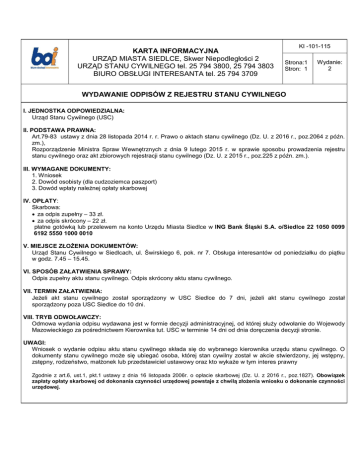 KARTA INFORMACYJNA URZĄD MIASTA SIEDLCE, Skwer Niepodległości 2 URZĄD STANU CYWILNEGO tel. 25 794 3800, 25 794 3803 BIURO OBSŁUGI INTERESANTA tel. 25 794 3709 KI -101-115 Strona:1 Stron: 1 Wydanie: 2 WYDAWANIE ODPISÓW Z REJESTRU STANU CYWILNEGO I. JEDNOSTKA ODPOWIEDZIALNA: Urząd Stanu Cywilnego (USC) II. PODSTAWA PRAWNA: Art.79-83 ustawy z dnia 28 listopada 2014 r. r. Prawo o aktach stanu cywilnego (Dz. U. z 2016 r., poz.2064 z późn. zm.), Rozporządzenie Ministra Spraw Wewnętrznych z dnia 9 lutego 2015 r. w sprawie sposobu prowadzenia rejestru stanu cywilnego oraz akt zbiorowych rejestracji stanu cywilnego (Dz. U. z 2015 r., poz.225 z późn. zm.). III. WYMAGANE DOKUMENTY: 1. Wniosek 2. Dowód osobisty (dla cudzoziemca paszport) 3. Dowód wpłaty należnej opłaty skarbowej IV. OPŁATY: Skarbowa: • za odpis zupełny – 33 zł. • za odpis skrócony – 22 zł. płatne gotówką lub przelewem na konto Urzędu Miasta Siedlce w ING Bank Śląski S.A. o/Siedlce 22 1050 0099 6192 5550 1000 0010 V. MIEJSCE ZŁOŻENIA DOKUMENTÓW: Urząd Stanu Cywilnego w Siedlcach, ul. Świrskiego 6, pok. nr 7. Obsługa interesantów od poniedziałku do piątku w godz. 7.45 – 15.45. VI. SPOSÓB ZAŁATWIENIA SPRAWY: Odpis zupełny aktu stanu cywilnego. Odpis skrócony aktu stanu cywilnego. VII. TERMIN ZAŁATWIENIA: Jeżeli akt stanu cywilnego został sporządzony w USC Siedlce do 7 dni, jeżeli akt stanu cywilnego został sporządzony poza USC Siedlce do 10 dni. VIII. TRYB ODWOŁAWCZY: Odmowa wydania odpisu wydawana jest w formie decyzji administracyjnej, od której służy odwołanie do Wojewody Mazowieckiego za pośrednictwem Kierownika tut. USC w terminie 14 dni od dnia doręczenia decyzji stronie. UWAGI: Wniosek o wydanie odpisu aktu stanu cywilnego składa się do wybranego kierownika urzędu stanu cywilnego. O dokumenty stanu cywilnego może się ubiegać osoba, której stan cywilny został w akcie stwierdzony, jej wstępny, zstępny, rodzeństwo, małżonek lub przedstawiciel ustawowy oraz kto wykaże w tym interes prawny Zgodnie z art.6, ust.1, pkt.1 ustawy z dnia 16 listopada 2006r. o opłacie skarbowej (Dz. U. z 2016 r., poz.1827). Obowiązek zapłaty opłaty skarbowej od dokonania czynności urzędowej powstaje z chwilą złożenia wniosku o dokonanie czynności urzędowej.
