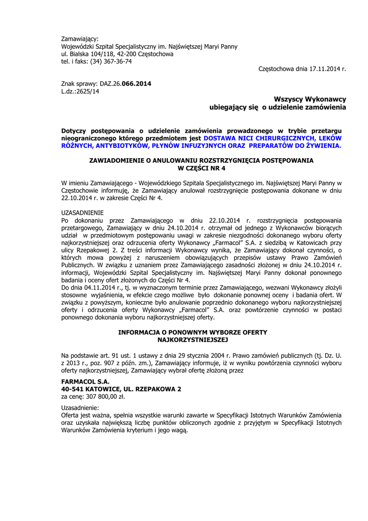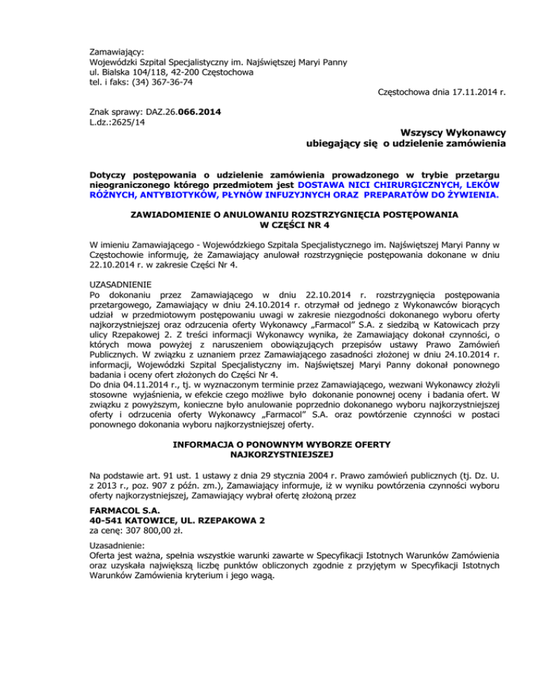 Zamawiający: Wojewódzki Szpital Specjalistyczny im. Najświętszej Maryi Panny ul. Bialska 104/118, 42-200 Częstochowa tel. i faks: (34) 367-36-74 Częstochowa dnia 17.11.2014 r. Znak sprawy: DAZ.26.066.2014 L.dz.:2625/14 Wszyscy Wykonawcy ubiegający się o udzielenie zamówienia Dotyczy postępowania o udzielenie zamówienia prowadzonego w trybie przetargu nieograniczonego którego przedmiotem jest DOSTAWA NICI CHIRURGICZNYCH, LEKÓW RÓŻNYCH, ANTYBIOTYKÓW, PŁYNÓW INFUZYJNYCH ORAZ PREPARATÓW DO ŻYWIENIA. ZAWIADOMIENIE O ANULOWANIU ROZSTRZYGNIĘCIA POSTĘPOWANIA W CZĘŚCI NR 4 W imieniu Zamawiającego - Wojewódzkiego Szpitala Specjalistycznego im. Najświętszej Maryi Panny w Częstochowie informuję, że Zamawiający anulował rozstrzygnięcie postępowania dokonane w dniu 22.10.2014 r. w zakresie Części Nr 4. UZASADNIENIE Po dokonaniu przez Zamawiającego w dniu 22.10.2014 r. rozstrzygnięcia postępowania przetargowego, Zamawiający w dniu 24.10.2014 r. otrzymał od jednego z Wykonawców biorących udział w przedmiotowym postępowaniu uwagi w zakresie niezgodności dokonanego wyboru oferty najkorzystniejszej oraz odrzucenia oferty Wykonawcy „Farmacol” S.A. z siedzibą w Katowicach przy ulicy Rzepakowej 2. Z treści informacji Wykonawcy wynika, że Zamawiający dokonał czynności, o których mowa powyżej z naruszeniem obowiązujących przepisów ustawy Prawo Zamówień Publicznych. W związku z uznaniem przez Zamawiającego zasadności złożonej w dniu 24.10.2014 r. informacji, Wojewódzki Szpital Specjalistyczny im. Najświętszej Maryi Panny dokonał ponownego badania i oceny ofert złożonych do Części Nr 4. Do dnia 04.11.2014 r., tj. w wyznaczonym terminie przez Zamawiającego, wezwani Wykonawcy złożyli stosowne wyjaśnienia, w efekcie czego możliwe było dokonanie ponownej oceny i badania ofert. W związku z powyższym, konieczne było anulowanie poprzednio dokonanego wyboru najkorzystniejszej oferty i odrzucenia oferty Wykonawcy „Farmacol” S.A. oraz powtórzenie czynności w postaci ponownego dokonania wyboru najkorzystniejszej oferty. INFORMACJA O PONOWNYM WYBORZE OFERTY NAJKORZYSTNIEJSZEJ Na podstawie art. 91 ust. 1 ustawy z dnia 29 stycznia 2004 r. Prawo zamówień publicznych (tj. Dz. U. z 2013 r., poz. 907 z późn. zm.), Zamawiający informuje, iż w wyniku powtórzenia czynności wyboru oferty najkorzystniejszej, Zamawiający wybrał ofertę złożoną przez FARMACOL S.A. 40-541 KATOWICE, UL. RZEPAKOWA 2 za cenę: 307 800,00 zł. Uzasadnienie: Oferta jest ważna, spełnia wszystkie warunki zawarte w Specyfikacji Istotnych Warunków Zamówienia oraz uzyskała największą liczbę punktów obliczonych zgodnie z przyjętym w Specyfikacji Istotnych Warunków Zamówienia kryterium i jego wagą. Nazwy (firmy), siedziby i adresy Wykonawców, którzy złożyli oferty w zakresie Części Nr 4 wraz z punktacją przyznaną ofertom w kryterium oceny ofert i łączną punktacją Numer oferty Wykonawca 10. KONSORCJUM FIRM: PGF URTICA SP. Z O.O. 54-613 WROCŁAW, UL. KRZEMIENIECKA 120 ORAZ PGF S.A., 91-342 ŁÓDŹ, UL. ZBĄSZYŃSKA 3 NEUCA S.A 87-100 TORUŃ, UL. SZOSA BYDGOSKA 58 12. FARMACOL S.A. 40-541 KATOWICE, UL. RZEPAKOWA 2 9. Punkty w kryterium cena - 100% Łączna ilość punktów 60,59 pkt 60,59 pkt 60,49 pkt 60,49 pkt 100,00 pkt 100,00 pkt Umowa z wybranym Wykonawcą zostanie zawarta zgodnie z art. 94 ust. 1 pkt 1 ustawy Prawo zamówień publicznych, z zastrzeżeniem art. 94 ust. 2 pkt 1a ustawy Pzp. Zamawiający dziękuje Wykonawcom za udział w postępowaniu przetargowym i zaprasza do udziału w kolejnych postępowaniach. Z poważaniem DYREKTOR Wojewódzkiego Szpitala Specjalistycznego im. Najświętszej Maryi Panny w Częstochowie lek. med. Barbara Magnuszewska - Pankiewicz