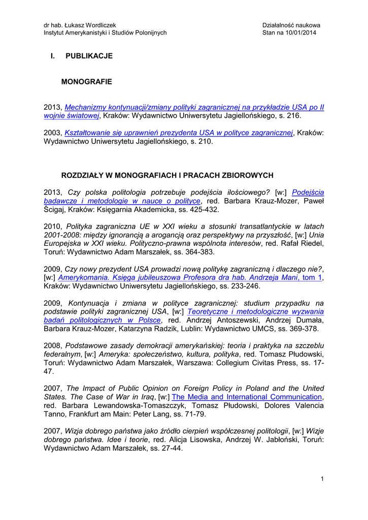 dr hab. Łukasz Wordliczek Instytut Amerykanistyki i Studiów Polonijnych I. Działalność naukowa Stan na 10/01/2014 PUBLIKACJE MONOGRAFIE 2013, Mechanizmy kontynuacji/zmiany polityki zagranicznej na przykładzie USA po II wojnie światowej, Kraków: Wydawnictwo Uniwersytetu Jagiellońskiego, s. 216. 2003, Kształtowanie się uprawnień prezydenta USA w polityce zagranicznej, Kraków: Wydawnictwo Uniwersytetu Jagiellońskiego, s. 210. ROZDZIAŁY W MONOGRAFIACH I PRACACH ZBIOROWYCH 2013, Czy polska politologia potrzebuje podejścia ilościowego? [w:] Podejścia badawcze i metodologie w nauce o polityce, red. Barbara Krauz-Mozer, Paweł Ścigaj, Kraków: Księgarnia Akademicka, ss. 425-432. 2010, Polityka zagraniczna UE w XXI wieku a stosunki transatlantyckie w latach 2001-2008: między ignorancją a arogancją oraz perspektywy na przyszłość, [w:] Unia Europejska w XXI wieku. Polityczno-prawna wspólnota interesów, red. Rafał Riedel, Toruń: Wydawnictwo Adam Marszałek, ss. 364-383. 2009, Czy nowy prezydent USA prowadzi nową politykę zagraniczną i dlaczego nie?, [w:] Amerykomania. Księga jubileuszowa Profesora dra hab. Andrzeja Mani, tom 1, Kraków: Wydawnictwo Uniwersytetu Jagiellońskiego, ss. 233-246. 2009, Kontynuacja i zmiana w polityce zagranicznej: studium przypadku na podstawie polityki zagranicznej USA, [w:] Teoretyczne i metodologiczne wyzwania badań politologicznych w Polsce, red. Andrzej Antoszewski, Andrzej Dumała, Barbara Krauz-Mozer, Katarzyna Radzik, Lublin: Wydawnictwo UMCS, ss. 369-378. 2008, Podstawowe zasady demokracji amerykańskiej: teoria i praktyka na szczeblu federalnym, [w:] Ameryka: społeczeństwo, kultura, polityka, red. Tomasz Płudowski, Toruń: Wydawnictwo Adam Marszałek, Warszawa: Collegium Civitas Press, ss. 1747. 2007, The Impact of Public Opinion on Foreign Policy in Poland and the United States. The Case of War in Iraq, [w:] The Media and International Communication, red. Barbara Lewandowska-Tomaszczyk, Tomasz Płudowski, Dolores Valencia Tanno, Frankfurt am Main: Peter Lang, ss. 71-79. 2007, Wizja dobrego państwa jako źródło cierpień współczesnej politologii, [w:] Wizje dobrego państwa. Idee i teorie, red. Alicja Lisowska, Andrzej W. Jabłoński, Toruń: Wydawnictwo Adam Marszałek, ss. 27-44. 1 dr hab. Łukasz Wordliczek Instytut Amerykanistyki i Studiów Polonijnych Działalność naukowa Stan na 10/01/2014 2007, Continuity or Change? A Doctrinal Facet of the U.S. Foreign Policy, [w:] U.S. Foreign Policy: Theory, Mechanisms, Practice, red. Andrzej Mania, Paweł Laidler, Łukasz Wordliczek, Kraków: Wydawnictwo Uniwersytetu Jagiellońskiego, 2007, ss. 53-62. 2005, Representativeness and Separation of Powers: Pork Barrel Legislation and Private Bills, [w:] Theory and Practice in English Studies, red. Jan Chovanec, Brno: Masarykova Univerzita, ss. 277-283. 2005, Executive Privilege: Who Possesses, and in Which Manner, Information in the Contemporary US Political System?, [w:] United States and Europe. Conflict versus Collaboration, red. Andrzej Mania, Paweł Laidler, Katarzyna Spiechlanin, Łukasz Wordliczek, Kraków: Wydawnictwo Uniwersytetu Jagiellońskiego, ss. 153-157. 2004, Badanie przywództwa politycznego prezydenta USA na przykładzie polityki zagranicznej, [w:] Zrozumieć politykę. Główne problemy teorii polityki i współczesnej myśli politycznej, red. Roman Bäcker, Joanna Marszałek-Kawa, Joanna Modrzyńska, Toruń: Wydawnictwo Adam Marszałek, ss. 57-65. 2004, „Nowa Europa" jako narzędzie analityczne polityki zagranicznej Stanów Zjednoczonych na przykładzie interwencji w Iraku, [w:] Polska i społeczeństwo w XXI wieku. Kraków: Krakowskie Towarzystwo Edukacyjne, ss. 255-266. ARTYKUŁY NAUKOWE 2013, Polityka zagraniczna pierwszych czterech lat prezydentury Baracka Obamy: kontynuacja czy zmiana?, „Politeja”, nr 1, ss. 129-153. 2008, Does a New President Mean a New Foreign Policy - and Why Not?, „Politeja”, nr 10/2008, ss. 343-352. 2007, Problem ustawodawstwa prywatnego w USA, „Przegląd Sejmowy”, nr 1, ss. 65-86. 2005, Finansowanie wyborów w USA: (jeszcze) wybór osobowości i programu czy (już) dyktat sponsorów?, „Politeja”, nr 3, ss. 62-68. 2005, Stosunki transatlantyckie w świetle wyników badań opinii publicznej w USA i wybranych krajach europejskich, „Przegląd Politologiczny”, nr 1, ss. 7-13. 2005, U.S. Presidential Power in Foreign Policy and Military Interventions. Case Study of the Selected Examples, 1958-Present, „Polish Political Science Yearbook”, vol. XXXIV, ss. 111-130. 2004, War Powers Resolution – bilans trzydziestolecia, „Przegląd Sejmowy”, nr 1, ss. 133-138. 2 dr hab. Łukasz Wordliczek Instytut Amerykanistyki i Studiów Polonijnych Działalność naukowa Stan na 10/01/2014 2004, Węzeł iracki, „Studia Międzynarodowe”, nr 3. 2003, Rozpoczynanie działań wojennych w Zjednoczonych, „Państwo i Prawo”, nr 3, ss. 83-91. porządku prawnym Stanów 2003, Struggling for Presidential Prerogatives in Foreign Policy: The Curtiss-Wright Case, „Ad Americam”, vol. 4, ss. 68-76. 2000, Łukasz Wordliczek, Politics or Tyranny? Reaction to the Vietnam War in the United States, „Ad Americam”, vol. 1, ss. 55-63. REDAKCJE NAUKOWE 2009, The United States and the World: from Imitation to Challenge, Kraków: Wydawnictwo Uniwersytetu Jagiellońskiego, s. 362, (współredaktor: Andrzej Mania). 2007, U.S. Foreign Policy: Theory, Mechanisms, Practice, Kraków: Wydawnictwo Uniwersytetu Jagiellońskiego, s. 565, (współredaktorzy: Andrzej Mania, Paweł Laidler). 2005, Basic American Documents. U.S. Foreign Policy: Substance Procedure, Kraków: Wydawnictwo Uniwersytetu Jagiellońskiego, s. 188. and 2005, United States and Europe. Conflict versus Collaboration, Kraków: Wydawnictwo Uniwersytetu Jagiellońskiego, s. 157, (współredaktorzy: Andrzej Mania, Paweł Laidler, Katarzyna Spiechlanin). 2004, Słownik wiedzy o społeczeństwie. Kraków: Wydawnictwo Zielona Sowa, 