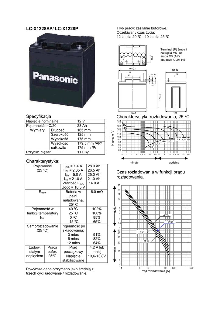 Tryb pracy: zasilanie buforowe. Oczekiwany czas Ŝycia: 12 lat dla 20 ºC, 10 lat dla 25 ºC LC-X1228AP/ LC-X1228P Terminal (P) śruba i nakrętka M5 lub śruba M5 (AP) obudowa UL94 HB Specyfikacja Charakterystyka rozładowania, 25 ºC 12 V 28 Ah 165 mm 125 mm 175 mm 179.5 mm /AP/ 175 mm /P/ 11.0 kg Napięcie [V] Napięcie nominalne Pojemność I=C/20 Wymiary Długość Szerokość Wysokość Wysokość całkowita PrzybliŜ. cięŜar Charakterystyka: minuty 28.0 Ah 26.5 Ah 25.0 Ah 21.0 Ah 14.0 A godziny Czas rozładowania w funkcji prądu rozładowania. 6.0 mΩ 102% 100% 85% 65% 91% 82% 64% 4.2 A lub mniej 13,6-13,8V PowyŜsze dane otrzymano jako średnią z trzech cykli ładowanie / rozładowanie. godz I20h = 1.4 A I10h = 2.65 A I5h = 5.0 A I1h = 21.0 A Wartość I1.5h, Uodc = 10.5 V Rwew Bateria w pełni naładowana, 25º C Pojemność w 40 ºC funkcji temperatury 25 ºC I20h 0 ºC -15 ºC Samorozładowanie Pojemność po (25 ºC) składowaniu: 3 mies 6 mies 12 mies Ładow. Praca Prąd stałym bufor. początkowy napięciem 25ºC Napięcie stabilizowane min Pojemność (25 ºC) Prąd rozładowania [A]