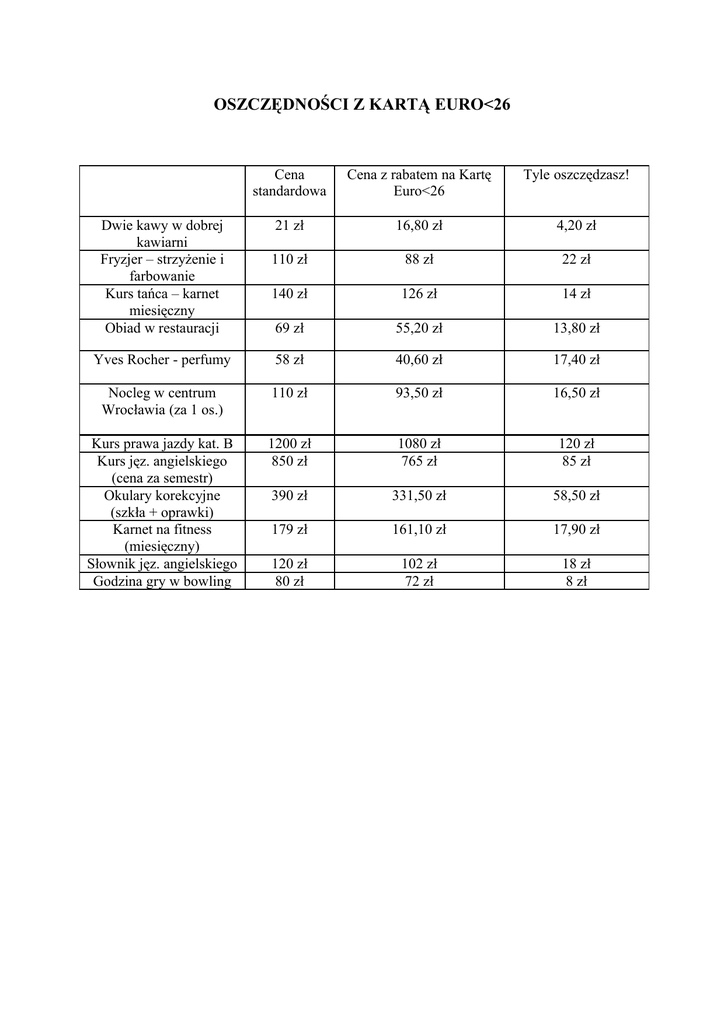 OSZCZĘDNOŚCI Z KARTĄ EURO<26 Cena standardowa Cena z rabatem na Kartę Euro<26 Tyle oszczędzasz! 21 zł 16,80 zł 4,20 zł 110 zł 88 zł 22 zł 140 zł 126 zł 14 zł 69 zł 55,20 zł 13,80 zł Yves Rocher - perfumy 58 zł 40,60 zł 17,40 zł Nocleg w centrum Wrocławia (za 1 os.) 110 zł 93,50 zł 16,50 zł Kurs prawa jazdy kat. B Kurs jęz. angielskiego (cena za semestr) Okulary korekcyjne (szkła + oprawki) Karnet na fitness (miesięczny) Słownik jęz. angielskiego Godzina gry w bowling 1200 zł 850 zł 1080 zł 765 zł 120 zł 85 zł 390 zł 331,50 zł 58,50 zł 179 zł 161,10 zł 17,90 zł 120 zł 80 zł 102 zł 72 zł 18 zł 8 zł Dwie kawy w dobrej kawiarni Fryzjer – strzyżenie i farbowanie Kurs tańca – karnet miesięczny Obiad w restauracji