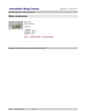 Pannelllier Sklep Online Ceramika ogrodowa > Żaba ceramiczna Żaba ceramiczna Model : 803 Żaba ceramiczna Producent : �Wymiary : *wysokość - 12,5 cm *szerokość - 23 cm *grubość - 14 cm � Cena : 23,99 zł Brutto ( 19,50 zł Netto) Dostępność: Produkt dostępny w naszym sklepie od 20 luty 2015 kontakt : - [email protected] Strona 1 Utworzono : 07 marzec 2017
