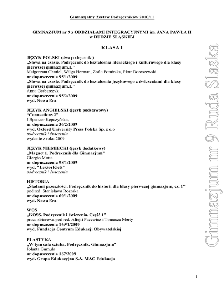 Gimnazjalny Zestaw Podręczników 2010/11 Gimnazjum nr 9 Ruda Slaska GIMNAZJUM nr 9 z ODDZIAŁAMI INTEGRACYJNYMI im. JANA PAWŁA II w RUDZIE ŚLĄSKIEJ KLASA I JĘZYK POLSKI (dwa podręczniki) „Słowa na czasie. Podręcznik do kształcenia literackiego i kulturowego dla klasy pierwszej gimnazjum.1.” Małgorzata Chmiel, Wilga Herman, Zofia Pomirska, Piotr Doroszewski nr dopuszczenia 95/1/2009 „Słowa na czasie. Podręcznik do kształcenia językowego z ćwiczeniami dla klasy pierwszej gimnazjum.1.” Anna Grabarczyk nr dopuszczenia 95/2/2009 wyd. Nowa Era JĘZYK ANGIELSKI (język podstawowy) “Connections 2” J.Spencer-Kępczyńska, nr dopuszczenia 36/2/2009 wyd. Oxford University Press Polska Sp. z o.o podręcznik i ćwiczenia wydanie z roku 2009 JĘZYK NIEMIECKI (język dodatkowy) „Magnet 1. Podręcznik dla Gimnazjum” Giorgio Motta nr dopuszczenia 98/1/2009 wyd. "LektorKlett" podręcznik i ćwiczenia HISTORIA „Śladami przeszłości. Podręcznik do historii dla klasy pierwszej gimnazjum, cz. 1” pod red. Stanisława Roszaka nr dopuszczenia 60/1/2009 wyd. Nowa Era WOS „KOSS. Podręcznik i ćwiczenia. Część 1” praca zbiorowa pod red. Alicjii Pacewicz i Tomasza Merty nr dopuszczenia 169/1/2009 wyd. Fundacja Centrum Edukacji Obywatelskiej PLASTYKA „W tym cała sztuka. Podręcznik. Gimnazjum” Jolanta Gumuła nr dopuszczenia 167/2009 wyd. Grupa Edukacyjna S.A. MAC Edukacja 1 Gimnazjum nr 9 Ruda Slaska MATEMATYKA „Matematyka z Plusem” Matematyka 1. Podręcznik dla klasy 1 gimnazjum praca zbiorowa nr dopuszczenia 168/1/2009 wyd. Gdańskie Wydawnictwo Oświatowe GEOGRAFIA „Planeta Nowa. Podręcznik do geografii dla klasy pierwszej gimnazjum, cz. 1” Roman Malarz nr dopuszczenia 7/1/2009 wyd. Nowa Era BIOLOGIA Semestr I „Puls życia 1. Podręcznik do biologii dla Gimnazjum” Małgorzata Jefimow, Marian Sęktas nr dopuszczenia 58/1/2009 wyd. Nowa Era Zeszyt ćwiczeń „Puls Życia 1” wyd. Nowa Era Semestr II „Puls życia 2. Podręcznik do biologii dla Gimnazjum” Małgorzata Jefimow nr dopuszczenia 58/2/2009 wyd. Nowa Era Zeszyt ćwiczeń „Puls Życia 2” wyd. Nowa Era Podręcznik „Puls Życia 2” będzie obowiązywał także w kl. II CHEMIA „Chemia Nowej Ery. Część 1. Podręcznik dla Gimnazjum” Jan Kulawik, Teresa Kulawik, Maria Litwin nr dopuszczenia 49/1/2009 wyd. Nowa Era FIZYKA „Spotkania z fizyką. Podręcznik dla gimnazjum. Część 1” Grażyna Francuz-Ornat, Teresa Kulawik, Maria Nowotny-Różańska nr dopuszczenia 93/1/2009 wyd. Nowa Era INFORMATYKA „Informatyka dla Ciebie. Podręcznik dla klas 1-3 gimnazjum” Piotr J. Durka nr dopuszczenia 181/2009 wyd. Nowa Era RELIGIA „Słowo Boga jest blisko Ciebie” Danuta Jackowiak, ks. Jan Szpat nr dopuszczenia Poznań 2000-AZ-31-02/2-0 wyd. Św. Wojciecha Zeszyty ćwiczeń tylko przy wskazanych przedmiotach. 2