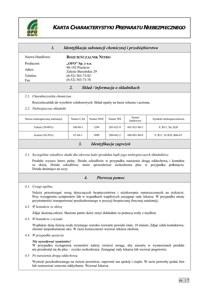 KARTA CHARAKTERYSTYKI PREPARATU NIEBEZPIECZNEGO 1. Identyfikacja substancji chemicznej i przedsiębiorstwa Nazwa Handlowa: ROZCIEŃCZALNIK NITRO Producent: „OFO” Sp. z o.o. 88-192 Piechcin Zalesie Barcińskie 29 (0-52) 383-73-82 (0-52) 383-73-78 Adres: Telefon: Fax. 2. Skład / informacja o składnikach 2.1. Charakterystyka chemiczna Rozcieńczalnik do wyrobów celulozowych. Skład oparty na bazie toluenu i acetonu. 2.2. Niebezpieczne składniki Nazwa niebezpiecznej substancji Numer CAS Numer ONZ Numer WE Numer Indeksowy Symbole niebezpieczeństwa Toluen (70-80%) 108-88-3 1294 203-625-9 601-021-00-3 F; R11; Xn; R20 Aceton (10-20%) 67-64-1 1090 200-662-2 606-001-00-8 F; R11, Xi R36, R66-67 3. Identyfikacja zagrożeń 3.1. Szczególnie szkodliwe skutki dla zdrowia ludzi (produktu bądź jego niebezpiecznych składników) Produkt wysoce łatwo palny. Działa szkodliwie w przypadku narażenia drogą oddechową i kontaktu ze skórą. Działa szkodliwie, może spowodować uszkodzenia płuc w przypadku połknięcia. Działa drażniąco na oczy. 4. Pierwsza pomoc 4.1. Uwagi ogólna Należy przestrzegać uwag dotyczących bezpieczeństwa i użytkowania zamieszczonych na etykiecie. Przy wystąpieniu symptomów lub w wypadkach wątpliwych zasięgnąć rady lekarza. W przypadku utraty przytomnoiści transportować poszkodowanego w pozycji bezpiecznej (bocznej ustalonej). 4.2. W kontakcie ze skórą Zdjąć skażoną odzież. Skażone partie skóry zmyć dokładnie za pomocą wody z mydłem. 4.3. W kontakcie z oczami Wypłukać dużą ilością wody trzymając szeroko rozwarte powieki (min. 10 minut). Zdjąć szkła kontaktowe, chronić niepodrażnione oko. W razie konieczności wezwać lekarza okulistę. 4.4. W przypadku spożycia Nie wywoływać wymiotów! W przypadku wystąpienia wymiotów należy zwrócić uwagę, aby zawarty w wymiocinach produkt nie przedostał się do płuc – ryzyko uszkodzenia. Zasięgnąć rady lekarza lub wezwać pogotowie. 4.5 Po narażeniu drogą oddechową Wynieść poszkodowanego na świeże powietrze, zapewnić mu spokój i ciepło. W razie potrzeby podać tlen lub zastosować sztuczne oddychanie. Wezwać lekarza. str. 1/7 KARTA CHARAKTERYSTYKI PREPARATU NIEBEZPIECZNEGO Nazwa Handlowa: ROZCIEŃCZALNIK NITRO Producent: „OFO” Sp. z o.o. 88-192 Piechcin, Zalesie Barcińskie 29 (0-52) 383-73-82 / (0-52) 383-73-78 Adres: Telefon/Fax. 5. Postępowanie w przypadku pożaru 5.1. Odpowiednie środki gaśnicze Piana, CO2, proszek gaśniczy, rozpylony strumień wody. 5.2. Środki gaśnicze nieodpowiednie ze względów bezpieczeństwa Silny strumień wody – ryzyko rozprzestrzenienia pożaru. 5.3. Szczególne wyposażenie podczas walki z ogniem Ochrona dróg oddechowych z niezależnym obiegiem powietrza W walce z ogniem: niezbędna ochrona dróg oddechowych z niezależnym obiegiem powietrza. 5.4. Uwagi dodatkowe Produkt palny, lżejszy od wody. Pary produktu są cięższe od powietrza i gromadzą się w dolnych partiach pomieszczeń. Istnieje duże prawdopodobieństwo powstania mieszaniny wybuchowej z powietrzem – w razie takiego niebezpieczeństwa zarządzić natychmiastową ewakuację. Zagrożone ogniem pojemniki polewać rozpyloną wodą z bezpiecznej odległości. Podczas pożaru może powstawać tlenek węgla (II) [CO] jako produkt częściowego spalania. Nie dopuścić do przedostania się wody gaśniczej do wód powierzchniowych lub gruntowych. 6. Postępowanie w przypadku uwolnienia do środowiska 6.1. Indywidualne środki ostrożności Pracować w należycie wentylowanych pomieszczeniach, stosować indywidualne środki ochrony. Unikać kontaktu ze skórą i oczami oraz wdychania oparów produktu. 6.2. Niezbędne środki w zakresie ochrony środowiska Nie dopuścić do przedostania się do kanalizacji - ryzyko wybuchu. 6.3. Metody oczyszczania/wchłaniania Potraktować materiałem wchłaniającym ciecze - mineralnym lub roślinnym (np. piasek, ziemia, krzemionka, trociny itp.). Zebrany materiał potraktować jak odpady i dalej postępować wg p. 13. 7. Obchodzenie się z produktem i magazynowanie 7.1. Środki ostrożności podczas obchodzenia się z substancją Przestrzegać przepisów prawnych w zakresie ochrony i bezpieczeństwa. Unikać kontaktu ze skórą i oczami. 7.2. Wymagania w zakresie przechowywania i opakowań Przechowywać tylko w oryginalnych, szczelnych opakowaniach. Przechowywać w pomieszczeniach dobrze wentylowanych posiadających przeciwwybuchową, nieiskrzącą instalację elektryczną. Przechowywać z dala od źródeł ognia, nie palić tytoniu. Zalecana temperatura przechowywania ok. 20 °C. Niebezpieczeństwo pożaru, materiał łatwo zapalny. 7.3. Wspólne magazynowanie Nie przechowywać razem z substancjami mogącymi reagować z produktem lub jego parami (patrz także p.10.2.). Nie przechowywać razem z artykułami żywnościowymi lub karmą dla zwierząt 7.2. Uwagi o ochronie przed zapłonem i eksplozją Przechowywać z dala od źródła ognia, nie palić tytoniu. Zastosować środki ostrożności dla uniknięcia wyładowań elektrostatycznych. str. 2/7 KARTA CHARAKTERYSTYKI PREPARATU NIEBEZPIECZNEGO Nazwa Handlowa: ROZCIEŃCZALNIK NITRO Producent: „OFO” Sp. z o.o. 88-192 Piechcin, Zalesie Barcińskie 29 (0-52) 383-73-82 / (0-52) 383-73-78 Adres: Telefon/Fax. 8. Kontrola narażania / środki ochrony indywidualnej 8.1. Parametry kontroli niebezpiecznych składników w miejscu pracy Specyfikacja – maksymalne stężenia składnika w miejscu pracy: Specyfikacja NDS NDSCh Toluen [CAS 108-88-3] 100 [mg/m3] 350 [mg/m3] 3 3 Aceton [CAS 67-64-1] 600 [mg/m ] NDSP 1 800 [mg/m ] 8.2. Wyposażenie osobiste Przestrzegać ogólnych zasad bezpieczeństwa i higieny. Przed przerwą i po zakończeniu pracy umyć ręce. Unikać dłuższego kontaktu ze skórą. Unikać wdychania pas produktu. Zdjąć natychmiast zabrudzone ubranie. Zalecane używanie kremu ochronnego do rąk. 8.3. Ochrona rąk Używać odpowiednich rękawic ochronnych. 8.4. Ochrona oc