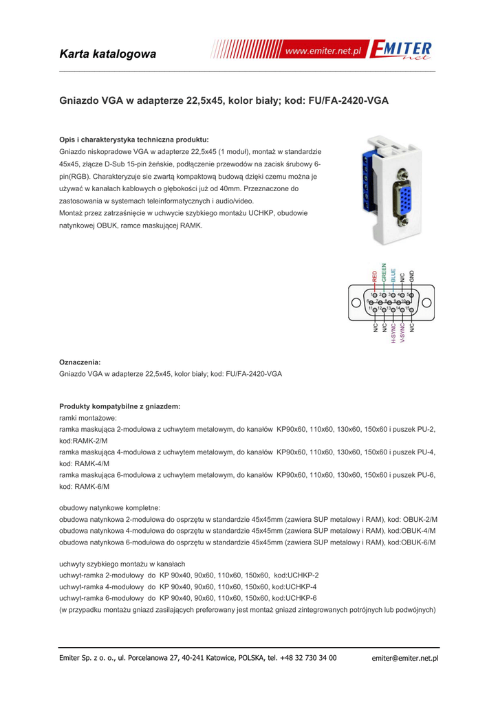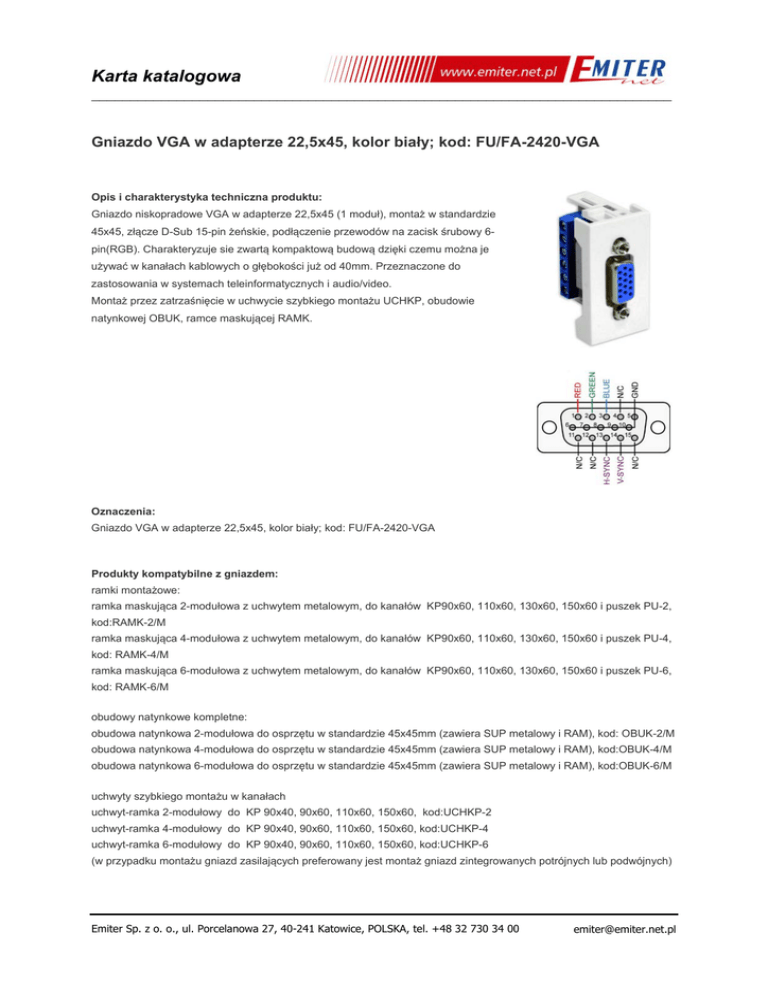 Karta katalogowa ___________________________________________________________________________ Gniazdo VGA w adapterze 22,5x45, kolor biały; kod: FU/FA-2420-VGA Opis i charakterystyka techniczna produktu: Gniazdo niskopradowe VGA w adapterze 22,5x45 (1 moduł), montaż w standardzie 45x45, złącze D-Sub 15-pin żeńskie, podłączenie przewodów na zacisk śrubowy 6pin(RGB). Charakteryzuje sie zwartą kompaktową budową dzięki czemu można je używać w kanałach kablowych o głębokości już od 40mm. Przeznaczone do zastosowania w systemach teleinformatycznych i audio/video. Montaż przez zatrzaśnięcie w uchwycie szybkiego montażu UCHKP, obudowie natynkowej OBUK, ramce maskującej RAMK. Oznaczenia: Gniazdo VGA w adapterze 22,5x45, kolor biały; kod: FU/FA-2420-VGA Produkty kompatybilne z gniazdem: ramki montażowe: ramka maskująca 2-modułowa z uchwytem metalowym, do kanałów KP90x60, 110x60, 130x60, 150x60 i puszek PU-2, kod:RAMK-2/M ramka maskująca 4-modułowa z uchwytem metalowym, do kanałów KP90x60, 110x60, 130x60, 150x60 i puszek PU-4, kod: RAMK-4/M ramka maskująca 6-modułowa z uchwytem metalowym, do kanałów KP90x60, 110x60, 130x60, 150x60 i puszek PU-6, kod: RAMK-6/M obudowy natynkowe kompletne: obudowa natynkowa 2-modułowa do osprzętu w standardzie 45x45mm (zawiera SUP metalowy i RAM), kod: OBUK-2/M obudowa natynkowa 4-modułowa do osprzętu w standardzie 45x45mm (zawiera SUP metalowy i RAM), kod:OBUK-4/M obudowa natynkowa 6-modułowa do osprzętu w standardzie 45x45mm (zawiera SUP metalowy i RAM), kod:OBUK-6/M uchwyty szybkiego montażu w kanałach uchwyt-ramka 2-modułowy do KP 90x40, 90x60, 110x60, 150x60, kod:UCHKP-2 uchwyt-ramka 4-modułowy do KP 90x40, 90x60, 110x60, 150x60, kod:UCHKP-4 uchwyt-ramka 6-modułowy do KP 90x40, 90x60, 110x60, 150x60, kod:UCHKP-6 (w przypadku montażu gniazd zasilających preferowany jest montaż gniazd zintegrowanych potrójnych lub podwójnych) Emiter Sp. z o. o., ul. Porcelanowa 27, 40-241 Katowice, POLSKA, tel. +48 32 730 34 00 [email protected] Karta katalogowa Parametry techniczne: Mechaniczne: kolor: biały wymiary (szer x wys x gł): 22,5x45x38mm waga: 18g Gniazdo: Złącze typ: D-SUB 15-pin/6x zacisk śrubowy Temperatura pracy: -10°C do +68°C Wilgotność: 10 do 90% Dołożyliśmy wszelkich starań, aby przedstawione informacje były rzetelne i kompletne. Jednak nie ponosimy odpowiedzialności za dokładność i kompletność danych oraz w szczególności nie możemy zagwarantować, że niniejsza specyfikacja nie zawiera błędów lub pomyłek. Informacje zawarte w niniejszej specyfikacji mogą zostać zmienione w każdej chwili bez powiadomienia. Emiter Sp. z o. o., ul. Porcelanowa 27, 40-241 Katowice, POLSKA, tel. +48 32 730 34 00 [email protected]
