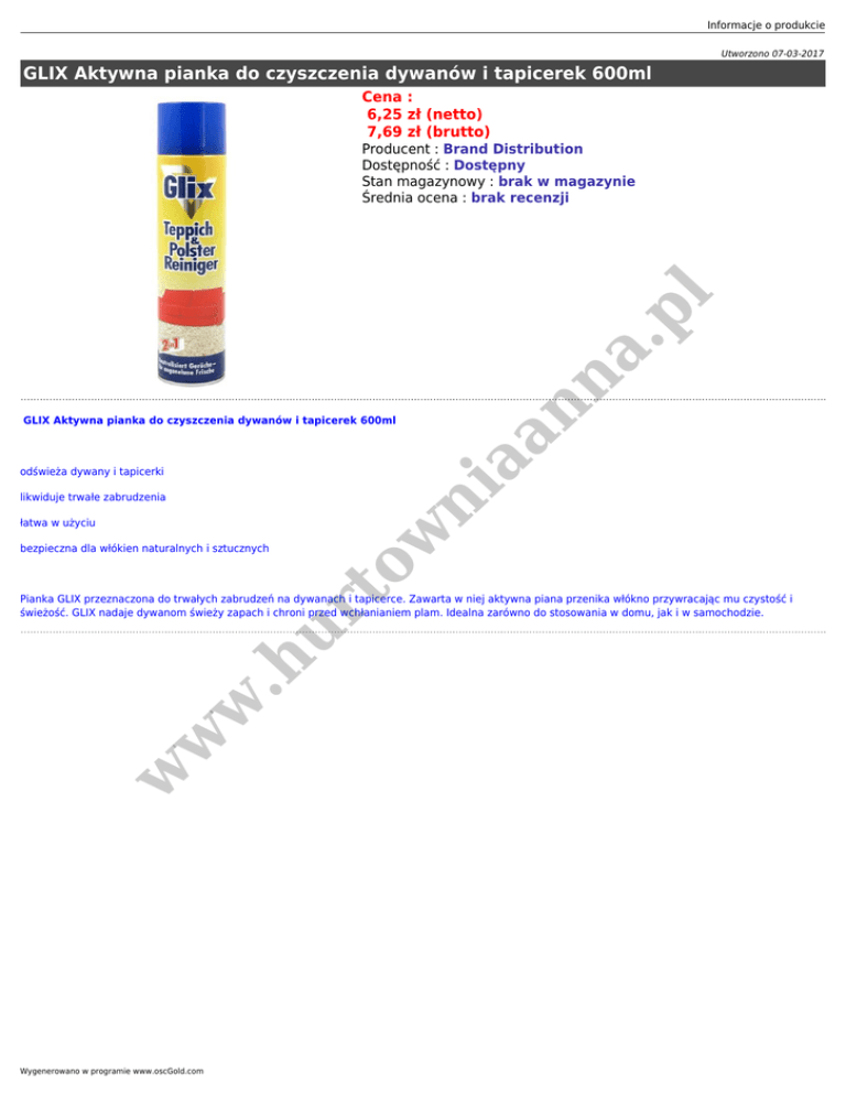 Informacje o produkcie Utworzono 07-03-2017 GLIX Aktywna pianka do czyszczenia dywanów i tapicerek 600ml Cena : 6,25 zł (netto) 7,69 zł (brutto) aa GLIX Aktywna pianka do czyszczenia dywanów i tapicerek 600ml nn a .p l Producent : Brand Distribution Dostępność : Dostępny Stan magazynowy : brak w magazynie Średnia ocena : brak recenzji likwiduje trwałe zabrudzenia łatwa w użyciu ur to bezpieczna dla włókien naturalnych i sztucznych w ni odświeża dywany i tapicerki w w w .h Pianka GLIX przeznaczona do trwałych zabrudzeń na dywanach i tapicerce. Zawarta w niej aktywna piana przenika włókno przywracając mu czystość i świeżość. GLIX nadaje dywanom świeży zapach i chroni przed wchłanianiem plam. Idealna zarówno do stosowania w domu, jak i w samochodzie. Wygenerowano w programie www.oscGold.com