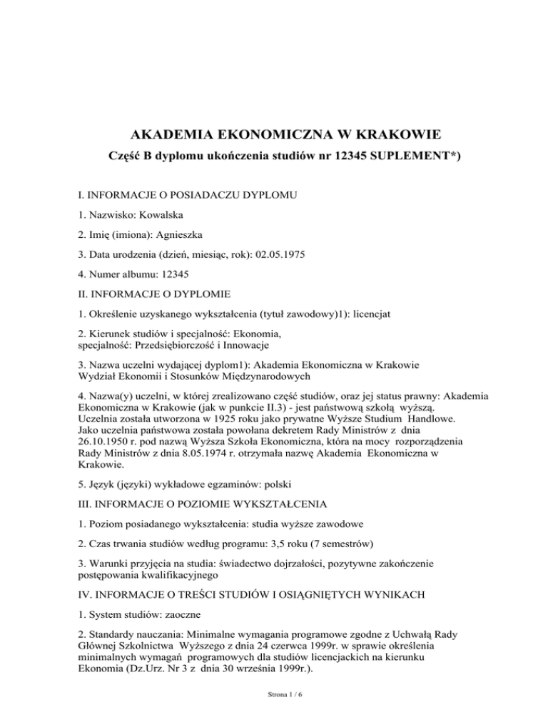 AKADEMIA EKONOMICZNA W KRAKOWIE Część B dyplomu ukończenia studiów nr 12345 SUPLEMENT*) I. INFORMACJE O POSIADACZU DYPLOMU 1. Nazwisko: Kowalska 2. Imię (imiona): Agnieszka 3. Data urodzenia (dzień, miesiąc, rok): 02.05.1975 4. Numer albumu: 12345 II. INFORMACJE O DYPLOMIE 1. Określenie uzyskanego wykształcenia (tytuł zawodowy)1): licencjat 2. Kierunek studiów i specjalność: Ekonomia, specjalność: Przedsiębiorczość i Innowacje 3. Nazwa uczelni wydającej dyplom1): Akademia Ekonomiczna w Krakowie Wydział Ekonomii i Stosunków Międzynarodowych 4. Nazwa(y) uczelni, w której zrealizowano część studiów, oraz jej status prawny: Akademia Ekonomiczna w Krakowie (jak w punkcie II.3) - jest państwową szkołą wyższą. Uczelnia została utworzona w 1925 roku jako prywatne Wyższe Studium Handlowe. Jako uczelnia państwowa została powołana dekretem Rady Ministrów z dnia 26.10.1950 r. pod nazwą Wyższa Szkoła Ekonomiczna, która na mocy rozporządzenia Rady Ministrów z dnia 8.05.1974 r. otrzymała nazwę Akademia Ekonomiczna w Krakowie. 5. Język (języki) wykładowe egzaminów: polski III. INFORMACJE O POZIOMIE WYKSZTAŁCENIA 1. Poziom posiadanego wykształcenia: studia wyższe zawodowe 2. Czas trwania studiów według programu: 3,5 roku (7 semestrów) 3. Warunki przyjęcia na studia: świadectwo dojrzałości, pozytywne zakończenie postępowania kwalifikacyjnego IV. INFORMACJE O TREŚCI STUDIÓW I OSIĄGNIĘTYCH WYNIKACH 1. System studiów: zaoczne 2. Standardy nauczania: Minimalne wymagania programowe zgodne z Uchwałą Rady Głównej Szkolnictwa Wyższego z dnia 24 czerwca 1999r. w sprawie określenia minimalnych wymagań programowych dla studiów licencjackich na kierunku Ekonomia (Dz.Urz. Nr 3 z dnia 30 września 1999r.). Strona 1 / 6 3. Szczegóły dotyczące programu oraz indywidualne osiągnięcia, uzyskane oceny/punkty kredytowe (ECTS): Liczba godzin Rok I semestr 1 Oceny ćw. wykł. zaliczenie 1. Encyklopedia prawa 0 14 2. Język niemiecki 18 0 zal. 3. Matematyka stosowana 18 8 3,0 4. Mikroekonomia 16 8 5,0 5. Podstawy informatyki 12 4 4,5 6. Podstawy organizacji i zarządzania 12 8 3,0 3,0 Liczba godzin Rok I semestr 2 egzamin 3,5 4,0 Oceny ćw. wykł. zaliczenie 1. Język niemiecki 18 0 zal. 2. Matematyka finansowa 8 4 3,0 3,5 3. Mikroekonomia 16 8 4,0 3,5 4. Podstawy informatyki 12 4 3,0 3,0 5. Podstawy marketingu 10 10 4,5 3,5 6. Podstawy rachunkowości 20 10 5,0 4,5 Liczba godzin Rok II semestr 3 Oceny ćw. wykł. 1. Ekonomika sektora publicznego 6 6 2. Finanse 10 10 4,5 3. Język niemiecki 18 0 3,0 4. Ochrona środowiska 0 12 5. Podstawy planowania przestrzennego 6 6 3,0 6. Statystyka 10 6 3,0 7. Wstęp do makroekonomii 10 6 4,0 zaliczenie egzamin 4,5 3,0 3,5 Liczba godzin Rok II semestr 4 egzamin 3,0 Oceny ćw. wykł. zaliczenie egzamin 1. Ekonomika nieruchomości 6 6 3,0 3,0 2. Język niemiecki 18 0 3,0 3. Podstawy przedsiębiorczości 6 6 4,5 4. Prawo gospodarcze 0 12 3,0 5. Socjologia pracy 0 8 4,0 6. Statystyka 16 8 3,5 3,0 7. Wstęp do makroekonomii 10 6 3,5 3,0 Liczba godzin Rok III semestr 5 4,5 Oceny ćw. wykł. zaliczenie 1. Język niemiecki 18 0 3,5 2. Logistyka 5 5 4,0 4,0 3. Rozwój i zmiana organizacji 5 5 4,5 4,5 4. Seminarium dyplomowe 12 0 zal. Strona 2 / 6 egzamin 5. Zarządzanie strategiczne 5 5 4,0 Liczba godzin Rok III semestr 6 4,0 Oceny ćw. wykł. zaliczenie egzamin 1. Język niemiecki 18 0 3,5 3,5 2. Kreatywność i innowacje 0 10 3. Seminarium dyplomowe 24 0 4. Strategie marketingowe 0 10 4,0 5. Systemy informacyjne kierownictwa 0 10 3,0 4,0 zal. Liczba godzin Rok IV semestr 7 Oceny ćw. wykł. zaliczenie egzamin 1. Finanse przedsiębiorstw 0 10 3,0 2. Metody i techniki zarządzania 0 10 4,0 3. Przedsiębiorstwa międzynarodowe 0 10 4,0 4. Seminarium dyplomowe 24 0 zal. Średnia ocen z całego okresu studiów wynosi: 3,46 Temat pracy dyplomowej: Rola samorządu terytorialnego w rozwoju miasta i gminy Średnia ocen z pracy dyplomowej wynosi: 4,25 Wynik egzaminu dyplomowego - średnia ocen z egzaminu dyplomowego wynosi: 4,50 4. System ocen i -o ile to możliwe- sposób ich przyznawania: Skala ocen z zaliczenia i egzaminu Ocena celujący bardzo dobry dobry plus dobry dostateczny plus dostateczny niedostateczny Oznaczenie liczbowe 5,5 5,0 4,5 4,0 3,5 3,0 2,0 Średnią ocen stanowi średnia arytmetyczna wszystkich ocen z egzaminów i zaliczeń, z uwzględnieniem ocen niedostatecznych, uzyskanych w ciągu całego okresu studiów. Seminaria dyplomowe i magisterskie oraz praktyki mogą być zaliczane bez oceny. Ostateczny wynik studiów stanowi sumę: 60% - średnia arytmetyczna wszystkich ocen z egzaminów i zaliczeń przedmiotów nie kończących się egzaminem, z uwzględnieniem ocen niedostatecznych, uzyskanych w ciągu całego okresu studiów. 20% - średnia ocen z pracy dyplomowej 20% - średnia ocen z egzaminu dyplomowego Strona 3 / 6 Na dyplomie ukończenia studiów wpisuje się ostateczną ocenę studiów wyrównaną do pełnej oceny w następujący sposób: do 3,79 - dostateczny od 3,80 do 4,49 - dobry od 4,50 i więcej - bardzo dobry 5. Wynik ukończenia studiów1): dostateczny V. INFORMACJE O UPRAWNIENIACH POSIADACZA DYPLOMU 1. Dostęp do dalszych studiów: możliwość ubiegania się o przyjęcie na uzupełniające studia magisterskie, możliwość kontynuowania nauki na studiach podyplomowych 2. Posiadane kwalifikacje oraz uprawnienia zawodowe (o ile to możliwe): Studia na tej specjalności przeznaczone są dla osób, które chcą dobrze poznać zasady, metody i techniki przedsiębiorczego działania w różnych organizacjach i w różnych dziedzinach oraz nabyć umiejętności umożliwiające samodzielne prowadzenie firmy tworzonej przez siebie lub innego przedsiębiorcę. VI. DODATKOWE INFORMACJE 1. Dodatkowe informacje, w tym: o odbytych praktykach, udziale w kołach naukowych, otrzymanych nagrodach: 2. Dalsze źródła informacji o uzyskanym wykształceniu: Statut Akademii Ekonomicznej w Krakowie, Regulamin Stud