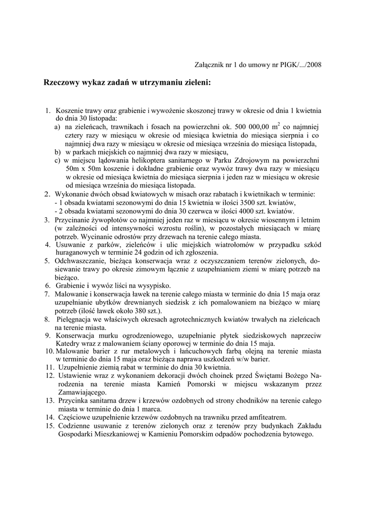 Załącznik nr 1 do umowy nr PIGK/.../2008 Rzeczowy wykaz zadań w utrzymaniu zieleni: 1. Koszenie trawy oraz grabienie i wywożenie skoszonej trawy w okresie od dnia 1 kwietnia do dnia 30 listopada: a) na zieleńcach, trawnikach i fosach na powierzchni ok. 500 000,00 m2 co najmniej cztery razy w miesiącu w okresie od miesiąca kwietnia do miesiąca sierpnia i co najmniej dwa razy w miesiącu w okresie od miesiąca września do miesiąca listopada, b) w parkach miejskich co najmniej dwa razy w miesiącu, c) w miejscu lądowania helikoptera sanitarnego w Parku Zdrojowym na powierzchni 50m x 50m koszenie i dokładne grabienie oraz wywóz trawy dwa razy w miesiącu w okresie od miesiąca kwietnia do miesiąca sierpnia i jeden raz w miesiącu w okresie od miesiąca września do miesiąca listopada. 2. Wykonanie dwóch obsad kwiatowych w misach oraz rabatach i kwietnikach w terminie: - 1 obsada kwiatami sezonowymi do dnia 15 kwietnia w ilości 3500 szt. kwiatów, - 2 obsada kwiatami sezonowymi do dnia 30 czerwca w ilości 4000 szt. kwiatów. 3. Przycinanie żywopłotów co najmniej jeden raz w miesiącu w okresie wiosennym i letnim (w zależności od intensywności wzrostu roślin), w pozostałych miesiącach w miarę potrzeb. Wycinanie odrostów przy drzewach na terenie całego miasta. 4. Usuwanie z parków, zieleńców i ulic miejskich wiatrołomów w przypadku szkód huraganowych w terminie 24 godzin od ich zgłoszenia. 5. Odchwaszczanie, bieżąca konserwacja wraz z oczyszczaniem terenów zielonych, dosiewanie trawy po okresie zimowym łącznie z uzupełnianiem ziemi w miarę potrzeb na bieżąco. 6. Grabienie i wywóz liści na wysypisko. 7. Malowanie i konserwacja ławek na terenie całego miasta w terminie do dnia 15 maja oraz uzupełnianie ubytków drewnianych siedzisk z ich pomalowaniem na bieżąco w miarę potrzeb (ilość ławek około 380 szt.). 8. Pielęgnacja we właściwych okresach agrotechnicznych kwiatów trwałych na zieleńcach na terenie miasta. 9. Konserwacja murku ogrodzeniowego, uzupełnianie płytek siedziskowych naprzeciw Katedry wraz z malowaniem ściany oporowej w terminie do dnia 15 maja. 10. Malowanie barier z rur metalowych i łańcuchowych farbą olejną na terenie miasta w terminie do dnia 15 maja oraz bieżąca naprawa uszkodzeń w/w barier. 11. Uzupełnienie ziemią rabat w terminie do dnia 30 kwietnia. 12. Ustawienie wraz z wykonaniem dekoracji dwóch choinek przed Świętami Bożego Narodzenia na terenie miasta Kamień Pomorski w miejscu wskazanym przez Zamawiającego. 13. Przycinka sanitarna drzew i krzewów ozdobnych od strony chodników na terenie całego miasta w terminie do dnia 1 marca. 14. Częściowe uzupełnienie krzewów ozdobnych na trawniku przed amfiteatrem. 15. Codzienne usuwanie z terenów zielonych oraz z terenów przy budynkach Zakładu Gospodarki Mieszkaniowej w Kamieniu Pomorskim odpadów pochodzenia bytowego. Załącznik nr 2 do umowy nr PIGK/.../2008 Wykaz barier i łańcuchów metalowych na terenie miasta: 1. ul. Mickiewicza (przed targowiskiem), 2. ul. Mickiewicza i Kościuszki (skrzyżowanie), 3. ul. Dworcowa, 4. ul. Kopernika, 5. ul. Szczecińska (przejście dla pieszych), 6. ul. Mieszka I, 7. ul. Mickiewicza i Chrobrego, 8. ul. Długosza i Konopnickiej (skrzyżowanie), 9. ul. Kopernika (schody do parku), 10. ul. Strzelecka (schody), 11. ul. Staromiejska (zejścia do fosy), 12. Plac Katedralny, 13. Stary Rynek, 14. ul. Pocztowa, 15. ul. Wolińska. Załącznik nr 3 do umowy nr PIGK/.../2008 Wykaz krzewów, żywopłotów i skupin iglastych: lp. 1 2 3 4 5 6 7 8 9 10 11 12 13 14 15 16 17 18 19 razem: ulica Park Solskiego ul. Strzelecka ul. Bałtycka ul. Mickiewicza ul. Szczecińska ul. Jagiełły (fosy) Stary Rynek Park Zdrojowy ul. Wilków Morskich ul. Chrobrego ul. Mieszka I ul. Żwirki i Wigury ul. M.C. Skłodowskiej ul. Szpitalna ul. Długosza ul. Dziwnowska ul. Jedności Narodowej ul. Konopnickiej ul. Wolińska ilość [m2] 250 106 175 871 683 169 250 470 432 61 7 40 20 310 149 13 10 65 60 4141 Załącznik 4 do umowy nr PIGK/.../2008 Wykaz terenów zielonych Lp. tereny zielone m2 1 ul. Wolińska - zieleńce pomiędzy chodnikiem a jezdnią, tereny wokół hali sportowej 4850 2 3 4 5 6 7 8 9 10 11 12 13 14 15 16 17 18 19 20 21 22 23 24 ul. Wolińska róg Topolowej do przejazdu kolejowego ul. Wolińska pomiędzy ogrodzeniem szkoły a jezdnią od przystanku do szkoły specjalnej, tereny za hotelem „Nafta” ul. Mieszka I ul. Mariańska - plac zabaw przy Kościele, zejścia na ul. Lipową Wilków Morskich - od torów do garaży ul. Kopernika, ul. Kopernika róg Wysockiego - przy ogrodzeniu szkoły specjalnej ul. Orzeszkowej róg Słonecznej ul. Orzeszkowej od torów do mostu ul. Zdrojowa - przy trafostacji ul. Obrońców Warszawy - skarpa od parkingu do ul. Lipowej ul. Wilków Morskich – w tym zieleńce przy plaży miejskiej i skarpa ul. Bolesława Chrobrego róg Jedności Narodowej – zieleniec ul. Szczecińska - droga do ul. Wolińskiej ul. Szczecińska - trawniki przy chodnikach ul. Wysockiego róg Kopernika ul. Dziwnowska - przy sklepach oraz teren obok szpitala przy płocie ul. Strzelecka - trawniki przed sklepem „Multi” ul Wysockiego od strony elewacji bocznej sklepu – skarpa ul. Kilińskiego trawnik przy chodniku do WĘGLOBUDU ul. Szczecińska przed Cmentarzem Wojennym ul. Szczecińska - Wolińska /Park Polonia przejście/ ul. Szczecińska przed cmentarzem ul. Szczecińska przed sklepem meblowym 4200 1500 250 1500 1600 300 500 2500 400 720 9500 600 780 500 300 500 50 150 300 855 2000 855 1137 25 26 27 28 29 30 31 32 33 34 35 36 37 38 39 40 41 42 43 44 45 46 47 48 49 50 51 52 53 54 55 ul. Chrobrego ul. Chrobrego – Rejtana ul. Mickiewicza – tereny parkowe + zieleńce przy chodnikach ul. Mickiewicza – Pl. Katedralny Pl. Katedralny Pl. Katedralny – Gryfitów fosy obronne Plac Wolności ul. Strzelecka – Gryfitów ul. Chrobrego – Mieszka I ul. Bałtycka – Gryfitów ul. Lipowa nad zatoką do ul Żwirki i Wigu