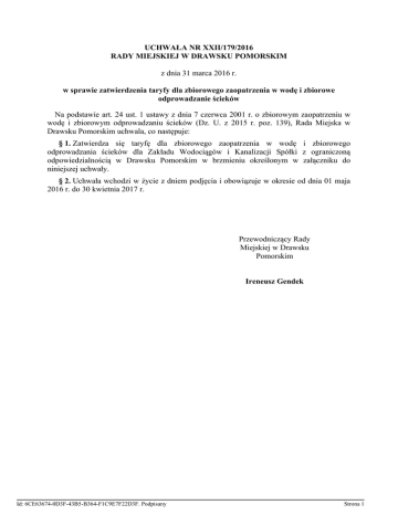 UCHWAŁA NR XXII/179/2016 RADY MIEJSKIEJ W DRAWSKU POMORSKIM z dnia 31 marca 2016 r. w sprawie zatwierdzenia taryfy dla zbiorowego zaopatrzenia w wodę i zbiorowe odprowadzanie ścieków Na podstawie art. 24 ust. 1 ustawy z dnia 7 czerwca 2001 r. o zbiorowym zaopatrzeniu w wodę i zbiorowym odprowadzaniu ścieków (Dz. U. z 2015 r. poz. 139), Rada Miejska w Drawsku Pomorskim uchwala, co następuje: § 1. Zatwierdza się taryfę dla zbiorowego zaopatrzenia w wodę i zbiorowego odprowadzania ścieków dla Zakładu Wodociągów i Kanalizacji Spółki z ograniczoną odpowiedzialnością w Drawsku Pomorskim w brzmieniu określonym w załączniku do niniejszej uchwały. § 2. Uchwała wchodzi w życie z dniem podjęcia i obowiązuje w okresie od dnia 01 maja 2016 r. do 30 kwietnia 2017 r. Przewodniczący Rady Miejskiej w Drawsku Pomorskim Ireneusz Gendek Id: 6CE63674-0D3F-43B5-B364-F1C9E7F22D3F. Podpisany Strona 1 Taryfa dla zbiorowe zaopatrzenie w wodę i zbiorowe odprowadzanie ścieków stosowana przez Zakład Wodociągów i Kanalizacji Spółka z o.o. w Drawsku Pomorskim na obszarze gminy Drawsko Pomorskie w okresie od 1.05.2016 r. do 30.04.2017 r. 1 Id: 6CE63674-0D3F-43B5-B364-F1C9E7F22D3F. Podpisany Strona 2 I. Rodzaje prowadzonej działalności. Zakład Wodociągów i Kanalizacji Spółka z o.o. w Drawsku Pomorskim prowadzi działalność w zakresie zbiorowego zaopatrzenia w wodę i zbiorowego odprowadzania ścieków. Spółka nie prowadzi działalności w zakresie odprowadzania wód opadowych i roztopowych kanalizacją deszczową. Zgodnie z aktem założycielskim Spółka może świadczyć inne usługi budowlane oraz odbiór ścieków dowożonych ze zbiorników bezodpływowych. II. Rodzaj i struktura taryfy. Zakład stosuje taryfę niejednolitą, wieloczłonową – dla poszczególnych taryfowych grup odbiorców stosuje jednakowe ceny dostawy wody i odprowadzania ścieków, a różne stawki opłat abonamentowych. Cena 1 m3 wody, jak i cena 1 m3 ścieków są jednakowe dla wszyskich taryfowych grup odbiorców. Różne są stawki opłaty abonamentowej. Opłata abonamentowa składa się z czterech rodzajów kosztów: A/ Koszt utrzymania w gotowości (2,54 zł/Odbiorcę/ m-c) urządzeń wodociągowych. W kalkulacji przyjęto 5 % kosztów eksploatacji i utrzymania urządzeń wodociągowych. Koszt ten jest naliczany odbiorcy podłączonemu do sieci wodociągowej (jeżeli przyłączy jest kilka lub Odbiorca posiada kilka nieruchomości zabudowanych, każde przyłącze jest osobno liczone). Koszt stanowi składnik opłaty naliczany odbiorcy za każdy miesiąc bez względu na to czy woda była pobierana czy też nie. Koszty te nie są kalkulowane w opłacie abonamentowej dla osób korzystających z lokali w budynku wielolokalowym, które rozliczane są zgodnie z umową zawartą z przedsiębiorstwem na indywidualne rozliczenie lokalu. B/ Koszt utrzymania w gotowości (2,02 zł/Odbiorcę/ m-c) urządzeń kanalizacyjnych. W kalkulacji przyjęto do kosztów utrzymania w gotowości urządzeń kanalizacyjnych 1,6 % kosztów eksploatacji i utrzymania urządzeń kanalizacyjnych. Koszt ten jest naliczany odbiorcy przyłączonemu do sieci kanalizacyjnej (jeżeli przyłączy jest kilka, każde jest osobno liczone). Koszt stanowi składnik opłaty naliczany odbiorcy za każdy miesiąc bez względu na to czy ścieki były odprowadzane czy też nie. Koszty te nie są kalkulowane w opłacie abonamentowej dla osób korzystających z lokali w budynku wielolokalowym, które 2 Id: 6CE63674-0D3F-43B5-B364-F1C9E7F22D3F. Podpisany Strona 3 rozliczane są zgodnie z umową zawartą z przedsiębiorstwem na indywidualne rozliczenie lokalu. C/ Koszt odczytu wodomierza (3,45 zł/jedn. odczytu), ustalono na podstawie ewidencji księgowej kosztów poniesionych w roku poprzednim. Opłata jest pobierana za jednostkę odczytu wodomierza. Koszty nie są kalkulowane w opłacie abonamentowej dla odbiorców usług rozliczanych na podstawie przepisów dotyczących przeciętnych norm zużycia wody. D/ Koszt i wodomierza, rozliczenia zł/jedn. (3,58 rozliczenia) jednostki odbiorcy ustalono na podstawie ewidencji księgowej kosztów poniesionych w roku poprzednim. Zróżnicowanie grup taryfowych w zakresie opłat abonamentowych wynika z określenia jakiego rodzaju koszty zostały przyporządkowane Odbiorcy. III. Taryfowe grupy odbiorców usług. Tabela 1. Podział Odbiorców na grupy. Podgrupa Sposób rozliczenia Okres rozliczenia Grupa woda + ścieki woda ścieki A B C 1 m-c 1 1A 1B 1C 2 m-ce 2 2A 2B 2C 6 m-cy 3 3A 3B 3C Wodomierz lokalowy lub inny podlicznik 1 m-c 4 4A 4B 4C 2 m-ce 5 5A 5B 5C Ryczałt w/g norm zużycia wody 1 m-c 6 6A 6B 6C 2 m-ce 7 7A 7B 7C Hydranty 3 m-ce 8 Wodomierz główny 8B Duża litera przy numerze grupy taryfowej określa zakres świadczonych usług: - A – dostawa wody i odbiór ścieków, - B - tylko dostawa wody, - C – tylko odbiór ścieków, np. 1A: 1 - wodomierz główny rozliczany co miesiąc, A - dostawa wody i odbiór ścieków. 3 Id: 6CE63674-0D3F-43B5-B364-F1C9E7F22D3F. Podpisany Strona 4 Grupa taryfowa 1A – są to odbiorcy, dla których podstawę rozliczenia stanowi wodomierz główny, posiadający przyłącze wodociągowe i przyłącze kanalizacyjne, korzystający z usług dostawy wody i odprowadzania ścieków. Rozliczani 1 raz w miesiącu (12 razy w roku); Grupa taryfowa 1B – są to odbiorcy, dla których podstawę rozliczenia stanowi wodomierz główny, posiadający przyłącze wodociągowe, korzystający z usług dostawy wody. Rozliczani 1 raz w miesiącu (12 razy w roku); Grupa taryfowa 1C – są to odbiorcy, dla których podstawę rozliczenia stanowi wodomierz główny, posiadający przyłącze kanalizacyjne, korzystający z usług odprowadzania ścieków (woda własna). Rozliczani 1 raz w miesiącu (12 razy w roku); Grupa taryfowa 2A – są to odbiorcy, jak grupa 1A lecz rozliczani co 2 miesiące (6 razy w roku); Grupa taryfowa 2B – są to odbiorcy, jak grupa 1B lecz rozliczani