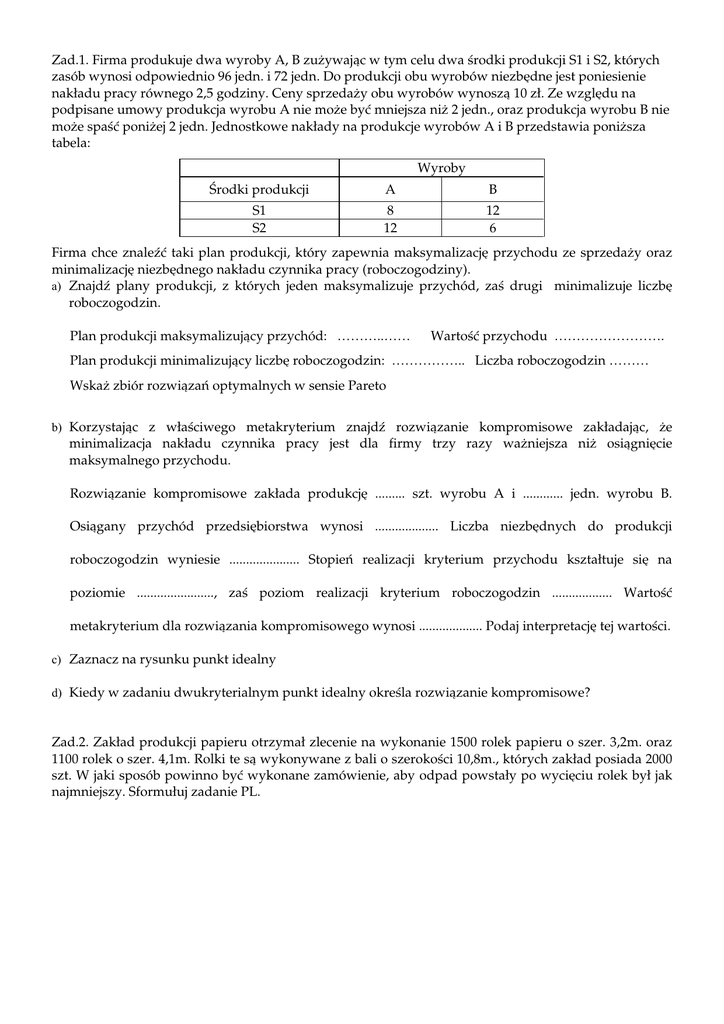 Zad.1. Firma produkuje dwa wyroby A, B zużywając w tym celu dwa środki produkcji S1 i S2, których zasób wynosi odpowiednio 96 jedn. i 72 jedn. Do produkcji obu wyrobów niezbędne jest poniesienie nakładu pracy równego 2,5 godziny. Ceny sprzedaży obu wyrobów wynoszą 10 zł. Ze względu na podpisane umowy produkcja wyrobu A nie może być mniejsza niż 2 jedn., oraz produkcja wyrobu B nie może spaść poniżej 2 jedn. Jednostkowe nakłady na produkcje wyrobów A i B przedstawia poniższa tabela: Wyroby Środki produkcji A B S1 S2 8 12 12 6 Firma chce znaleźć taki plan produkcji, który zapewnia maksymalizację przychodu ze sprzedaży oraz minimalizację niezbędnego nakładu czynnika pracy (roboczogodziny). a) Znajdź plany produkcji, z których jeden maksymalizuje przychód, zaś drugi minimalizuje liczbę roboczogodzin. Plan produkcji maksymalizujący przychód: ………..…… Wartość przychodu ……………………. Plan produkcji minimalizujący liczbę roboczogodzin: …………….. Liczba roboczogodzin ……… Wskaż zbiór rozwiązań optymalnych w sensie Pareto b) Korzystając z właściwego metakryterium znajdź rozwiązanie kompromisowe zakładając, że minimalizacja nakładu czynnika pracy jest dla firmy trzy razy ważniejsza niż osiągnięcie maksymalnego przychodu. Rozwiązanie kompromisowe zakłada produkcję ......... szt. wyrobu A i ............ jedn. wyrobu B. Osiągany przychód przedsiębiorstwa wynosi ................... Liczba niezbędnych do produkcji roboczogodzin wyniesie ..................... Stopień realizacji kryterium przychodu kształtuje się na poziomie ......................., zaś poziom realizacji kryterium roboczogodzin .................. Wartość metakryterium dla rozwiązania kompromisowego wynosi ................... Podaj interpretację tej wartości. c) Zaznacz na rysunku punkt idealny d) Kiedy w zadaniu dwukryterialnym punkt idealny określa rozwiązanie kompromisowe? Zad.2. Zakład produkcji papieru otrzymał zlecenie na wykonanie 1500 rolek papieru o szer. 3,2m. oraz 1100 rolek o szer. 4,1m. Rolki te są wykonywane z bali o szerokości 10,8m., których zakład posiada 2000 szt. W jaki sposób powinno być wykonane zamówienie, aby odpad powstały po wycięciu rolek był jak najmniejszy. Sformułuj zadanie PL. Zad.3. Firma może produkować dwa wyroby A i B, zużywając dwa istotne środki: S1 i S2. Zasób środka S2 musi być w pełni wykorzystany. Wyrobu A należy produkować nie mniej niż wyrobu B. Nakłady jednostkowe środków, wielkość ich zasobów i ceny sprzedaży wyrobów (w tys. zł) zawiera tabela. surowiec A B Zasób 2 4 16 S1 6 4 24 S2 cena 8 8 a) Sformułuj ten problem jako zadanie programowania liniowego wiedząc, że zakład jest zainteresowany maksymalizacją swojego przychodu; b) Rozwiąż zadanie metodą geometryczną. c) Jak może się zmieniać cena wyrobu A, aby rozwiązanie optymalne nie uległo zmianie? d) Czy i jak zmieni się rozwiązanie optymalne gdy zasób surowca S2 wyniesie 36 ? Zad.4. Inwestor zamierza kupić akcje dwóch firm A i B. W tabeli podano stopy zwrotu (w %) w trzech ostatnich miesiącach. Miesiące 1 2 3 A 8 10 0 B 12 -6 6 A) Ustal średnią stopę zwrotu, wariancję i kowariancję dla obydwu akcji. B) Sformułuj zadanie maksymalizujące stopę zwrotu portfela przy ryzyku v* = 20 (maksymalny akceptowany poziom). C) Sprawdź, czy portfel: xA= 1 xB = 0 jest portfelem optymalnym? Zad.5. Wyjaśnij pojęcie izokwanty i gradientu oraz określ relacje między nimi.
