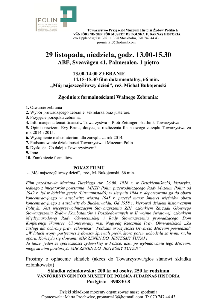Towarzystwo Przyjaciół Muzeum Historii Żydów Polskich VÄNFÖRENINGEN FÖR MUSEET DE POLSKA JUDARNAS HISTORIA c/o Upplandsg.53/1302, 113 28 Stockholm, 070 747 44 43 [email protected] 29 listopada, niedziela, godz. 13.00-15.30 ABF, Sveavägen 41, Palmesalen, 1 piętro 13.00-14.00 ZEBRANIE 14.15-15.30 film dokumentalny, 66 min. „Mój najszczęśliwszy dzień”, reż. Michał Bukojemski Zgodnie z formalnościami Walnego Zebrania: 1. Otwarcie zebrania 2. Wybór prowadzącego zebranie, sekretarza oraz justerare. 3. Przyjęcie porządku zebrania. 4. Informacje na temat finansów Towarzystwa - Piotr Zettinger, skarbnik Towarzystwa 5. Opinia rewizora Evy Bruns, dotycząca rozliczenia finansowego zarządu Towarzystwa za rok 2014 i 2015. 6. Wystąpienie o absolutorium dla zarządu za rok 2014. 7. Podsumowanie działalności Towarzystwa i Muzeum Polin 8. Dyskusja: Co dalej z Towarzystwem? 9. Inne 10. Zamknięcie formaliów. POKAZ FILMU - „Mój najszczęśliwszy dzień”, reż., M. Bukojemski, 66 min. Film przedstawia Mariana Turskiego (ur. 26.06. 1926 r. w Druskiennikach), historyka, jednego z inicjatorów powstania MHŻP Polin, przewodniczącego Rady Muzeum Polin; od 1942 r. żył w łódzkim getcie (Litzmannstadt); w sierpniu 1944 r. deportowano go do obozu koncentracyjnego w Auschwitz; wiosną 1945 r. przeżył marsz śmierci więźniów obozu koncentracyjnego z Auschwitz do Buchenwaldu. Od 1958 r. kierował działem historycznym Polityki. Jest wiceprzewodniczącym Stowarzyszenia ŻIH, członkiem Zarządu Głównego Stowarzyszenia Żydów Kombatantów i Poszkodowanych w II wojnie światowej, członkiem Międzynarodowej Rady Oświęcimskiej i Rady Stowarzyszenia prowadzącego Dom Konferencji Wannsee. Uhonorowany m.in Nagrodą Rzecznika Praw Obywatelskich „Za zasługi dla ochrony praw człowieka”. Podczas uroczystości Otwarcia Muzeum powiedział: „W latach wojny partyzanci żydowscy śpiewali pieśń, która potem uchodziła za hymn ruchu oporu. Kończyła się słowami: MIR ZENEN DO. JESTEŚMY TUTAJ ! Ja także, jeden ze społeczności żydowskiej w Polsce, dziś, po wybudowaniu tego Muzeum, mogę za nimi powtórzyć: MIR ZENEN DO. JESTEŚMY TUTAJ!” Prosimy o opłacenie składek (akces do Towarzystwa/głos stanowi składka członkowska) Składka członkowska: 200 kr od osoby, 250 kr rodzinna VÄNFÖRENINGEN FÖR MUSEET DE POLSKA JUDARNAS HISTORIA Postgiro: 390830-8 Dzięki składkom możemy organizować nasze spotkania Opracowała: Marta Prochwicz, [email protected], T: 070 747 44 43