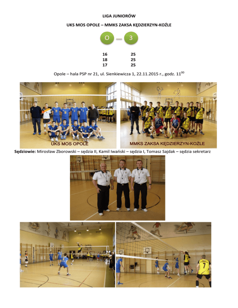 LIGA JUNIORÓW UKS MOS OPOLE – MMKS ZAKSA KĘDZIERZYN-KOŹLE O 16 18 17 3 25 25 25 Opole – hala PSP nr 21, ul. Sienkiewicza 1, 22.11.2015 r., godz. 1100 Sędziowie: Mirosław Zborowski – sędzia II, Kamil Iwański – sędzia I, Tomasz Sajdak – sędzia sekretarz PEWNA MOCNA ZAGRYWKA I SZCZELNY BLOK DROGĄ DO ZWYCIĘSTWA! 22 listopada o godzinie 1100 w sali sportowej Publicznej Szkoły Podstawowej nr 21 w Opolu rozegrano mecz 6 kolejki Ligi Juniorów województwa Opolskiego. Miejscowy UKS MOS Opole podejmował na własnym parkiecie zespół z Kędzierzyna, MMKS ZAKSA Kędzierzyn-Koźle. Przebieg wszystkich trzech setów wyglądał bardzo podobnie. Wyrównany początek z obu stron. Walka przy siatce i efektowne akcje obronne. Zawsze to jednak zespół z Kędzierzyna w połowie setów zdobywał kilku punktową przewagę dzięki zdecydowanej i mocnej zagrywce oraz szczelnemu blokowi. Trener z Opola próbował ratować sytuację wprowadzając zmiany, ale na nie wiele to pomogło. Natomiast szkoleniowiec z Kędzierzyna, kiedy to już jego zespół miał kilku punktową przewagę wprowadzał nowych zawodników, którzy bardzo dobrze spełniali swoją rolę. Mocne ataki oraz zagrywki z jednej jak i drugiej strony niejednokrotnie po obronie trafiały w sufit lub ścianę. Gdyby ten mecz rozgrywany był na większej hali, być może miałby inny przebieg obfitujący w jeszcze bardziej spektakularne akcje w obronie. Mecz trwał nieco ponad godzinę, wszystkie wolne miejsca zostały zajęte przez żywo dopingującą publiczność. Tomasz Sajdak