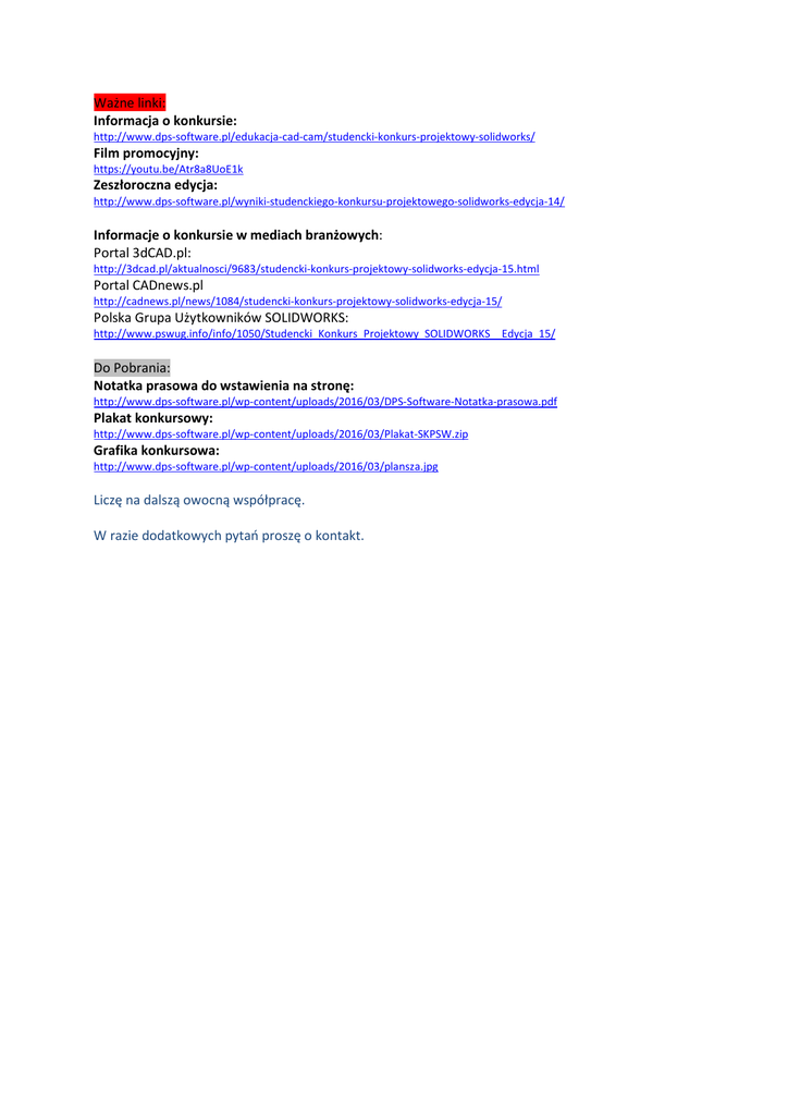 Ważne linki: Informacja o konkursie: http://www.dps-software.pl/edukacja-cad-cam/studencki-konkurs-projektowy-solidworks/ Film promocyjny: https://youtu.be/Atr8a8UoE1k Zeszłoroczna edycja: http://www.dps-software.pl/wyniki-studenckiego-konkursu-projektowego-solidworks-edycja-14/ Informacje o konkursie w mediach branżowych: Portal 3dCAD.pl: http://3dcad.pl/aktualnosci/9683/studencki-konkurs-projektowy-solidworks-edycja-15.html Portal CADnews.pl http://cadnews.pl/news/1084/studencki-konkurs-projektowy-solidworks-edycja-15/ Polska Grupa Użytkowników SOLIDWORKS: http://www.pswug.info/info/1050/Studencki_Konkurs_Projektowy_SOLIDWORKS__Edycja_15/ Do Pobrania: Notatka prasowa do wstawienia na stronę: http://www.dps-software.pl/wp-content/uploads/2016/03/DPS-Software-Notatka-prasowa.pdf Plakat konkursowy: http://www.dps-software.pl/wp-content/uploads/2016/03/Plakat-SKPSW.zip Grafika konkursowa: http://www.dps-software.pl/wp-content/uploads/2016/03/plansza.jpg Liczę na dalszą owocną współpracę. W razie dodatkowych pytań proszę o kontakt.