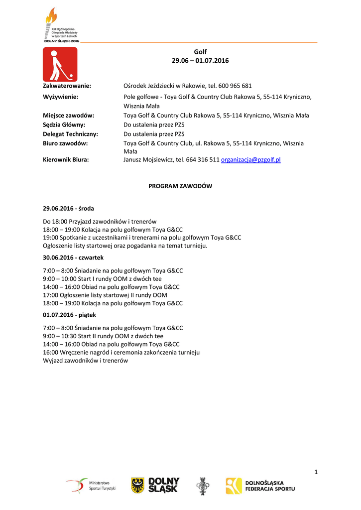 Golf 29.06 – 01.07.2016 Zakwaterowanie: Ośrodek Jeździecki w Rakowie, tel. 600 965 681 Wyżywienie: Pole golfowe - Toya Golf & Country Club Rakowa 5, 55-114 Kryniczno, Wisznia Mała Toya Golf & Country Club Rakowa 5, 55-114 Kryniczno, Wisznia Mała Do ustalenia przez PZS Do ustalenia przez PZS Toya Golf & Country Club, ul. Rakowa 5, 55-114 Kryniczno, Wisznia Mała Janusz Mojsiewicz, tel. 664 316 511 [email protected] Miejsce zawodów: Sędzia Główny: Delegat Techniczny: Biuro zawodów: Kierownik Biura: PROGRAM ZAWODÓW 29.06.2016 - środa Do 18:00 Przyjazd zawodników i trenerów 18:00 – 19:00 Kolacja na polu golfowym Toya G&CC 19:00 Spotkanie z uczestnikami i trenerami na polu golfowym Toya G&CC Ogłoszenie listy startowej oraz pogadanka na temat turnieju. 30.06.2016 - czwartek 7:00 – 8:00 Śniadanie na polu golfowym Toya G&CC 9:00 – 10:00 Start I rundy OOM z dwóch tee 14:00 – 16:00 Obiad na polu golfowym Toya G&CC 17:00 Ogłoszenie listy startowej II rundy OOM 18:00 – 19:00 Kolacja na polu golfowym Toya G&CC 01.07.2016 - piątek 7:00 – 8:00 Śniadanie na polu golfowym Toya G&CC 9:00 – 10:30 Start II rundy OOM z dwóch tee 14:00 – 16:00 Obiad na polu golfowym Toya G&CC 16:00 Wręczenie nagród i ceremonia zakończenia turnieju Wyjazd zawodników i trenerów 1