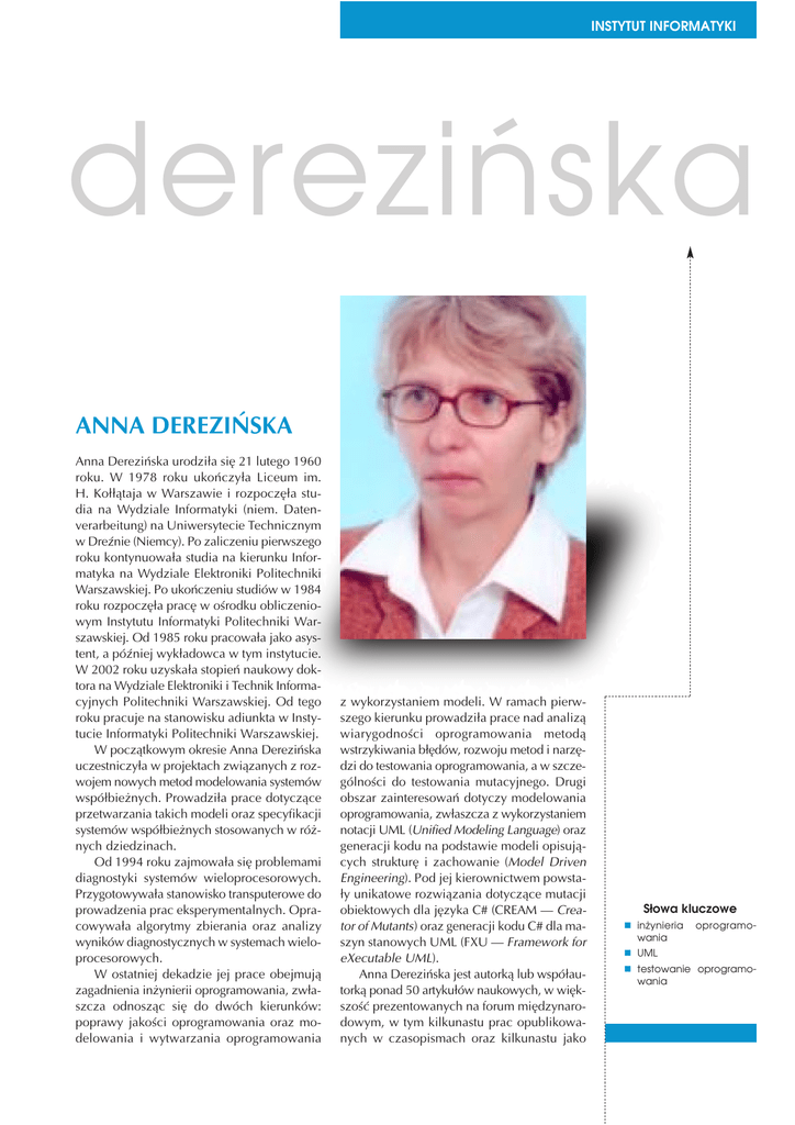 INSTYTUT INFORMATYKI derezińska ANNA DEREZIÑSKA Anna Dereziñska urodzi³a siê 21 lutego 1960 roku. W 1978 roku ukoñczy³a Liceum im. H. Ko³³¹taja w Warszawie i rozpoczê³a studia na Wydziale Informatyki (niem. Datenverarbeitung) na Uniwersytecie Technicznym w DreŸnie (Niemcy). Po zaliczeniu pierwszego roku kontynuowa³a studia na kierunku Informatyka na Wydziale Elektroniki Politechniki Warszawskiej. Po ukoñczeniu studiów w 1984 roku rozpoczê³a pracê w oœrodku obliczeniowym Instytutu Informatyki Politechniki Warszawskiej. Od 1985 roku pracowa³a jako asystent, a póŸniej wyk³adowca w tym instytucie. W 2002 roku uzyska³a stopieñ naukowy doktora na Wydziale Elektroniki i Technik Informacyjnych Politechniki Warszawskiej. Od tego roku pracuje na stanowisku adiunkta w Instytucie Informatyki Politechniki Warszawskiej. W pocz¹tkowym okresie Anna Dereziñska uczestniczy³a w projektach zwi¹zanych z rozwojem nowych metod modelowania systemów wspó³bie¿nych. Prowadzi³a prace dotycz¹ce przetwarzania takich modeli oraz specyfikacji systemów wspó³bie¿nych stosowanych w ró¿nych dziedzinach. Od 1994 roku zajmowa³a siê problemami diagnostyki systemów wieloprocesorowych. Przygotowywa³a stanowisko transputerowe do prowadzenia prac eksperymentalnych. Opracowywa³a algorytmy zbierania oraz analizy wyników diagnostycznych w systemach wieloprocesorowych. W ostatniej dekadzie jej prace obejmuj¹ zagadnienia in¿ynierii oprogramowania, zw³aszcza odnosz¹c siê do dwóch kierunków: poprawy jakoœci oprogramowania oraz modelowania i wytwarzania oprogramowania z wykorzystaniem modeli. W ramach pierwszego kierunku prowadzi³a prace nad analiz¹ wiarygodnoœci oprogramowania metod¹ wstrzykiwania b³êdów, rozwoju metod i narzêdzi do testowania oprogramowania, a w szczególnoœci do testowania mutacyjnego. Drugi obszar zainteresowañ dotyczy modelowania oprogramowania, zw³aszcza z wykorzystaniem notacji UML (Unified Modeling Language) oraz generacji kodu na podstawie modeli opisuj¹cych strukturê i zachowanie (Model Driven Engineering). Pod jej kierownictwem powsta³y unikatowe rozwi¹zania dotycz¹ce mutacji obiektowych dla jêzyka C# (CREAM — Creator of Mutants) oraz generacji kodu C# dla maszyn stanowych UML (FXU — Framework for eXecutable UML). Anna Dereziñska jest autork¹ lub wspó³autork¹ ponad 50 artyku³ów naukowych, w wiêkszoœæ prezentowanych na forum miêdzynarodowym, w tym kilkunastu prac opublikowanych w czasopismach oraz kilkunastu jako Słowa kluczowe n inżynieria wania oprogramo- n UML n testowanie oprogramowania INSTYTUT INFORMATYKI D rozdzia³y w ksi¹żkach renomowanych wydawnictw (m.in. Springer, IOS Press). W latach 2007–2009 przewodniczy³a konferencji „International Conference on Principles of Information Technology and Applications” (PITA) organizowanej w ramach multikonferencji IMCSIT. Uczestniczy w komitetach programowym czasopisma i konferencji miêdzynarodowych (m.in. „Datics-Imecs”, „Datics- Ispa”). Recenzowa³a prace dla czasopisma „Informatica” i kilku konferencji miêdzynarodowych. Anna Dereziñska bra³a udzia³ w przygotowaniu dwóch nowych wyk³adów i zajêæ laboratoryjnych z zakresu in¿ynierii oprogramowania. Jest wspó³autork¹ czterech publikacji prezentuj¹cych metodykê i doœwiadczenia w kszta³ceniu zaawansowanych metod in¿ynierii oprogramowania. Oprócz prowadzonych zajêæ z tej dziedziny, prowadzi³a wyk³ad z systemów operacyjnych, a tak¿e projekty i laboratoria dla ró¿nych przedmiotów z programowania oraz wiarygodnoœci systemów komputerowych (równie¿ na studiach anglojêzycznych). W³ada jêzykiem angielskim, niemieckim i rosyjskim. Lubi œpiew i turystykê.