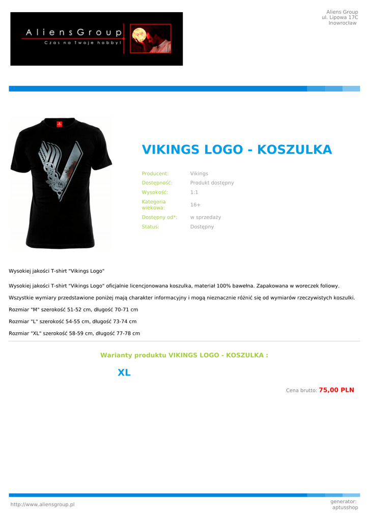 Aliens Group ul. Lipowa 17C Inowrocław VIKINGS LOGO - KOSZULKA Producent: Vikings Dostępność: Produkt dostępny Wysokość: 1:1 Kategoria wiekowa: 16+ Dostępny od*: w sprzedaży Status: Dostępny Wysokiej jakości T-shirt "Vikings Logo" Wysokiej jakości T-shirt "Vikings Logo" oficjalnie licencjonowana koszulka, materiał 100% bawełna. Zapakowana w woreczek foliowy. Wszystkie wymiary przedstawione poniżej mają charakter informacyjny i mogą nieznacznie różnić się od wymiarów rzeczywistych koszulki. Rozmiar "M" szerokość 51-52 cm, długość 70-71 cm Rozmiar "L" szerokość 54-55 cm, długość 73-74 cm Rozmiar "XL" szerokość 58-59 cm, długość 77-78 cm Warianty produktu VIKINGS LOGO - KOSZULKA : XL Cena brutto: http://www.aliensgroup.pl 75,00 PLN generator: aptusshop