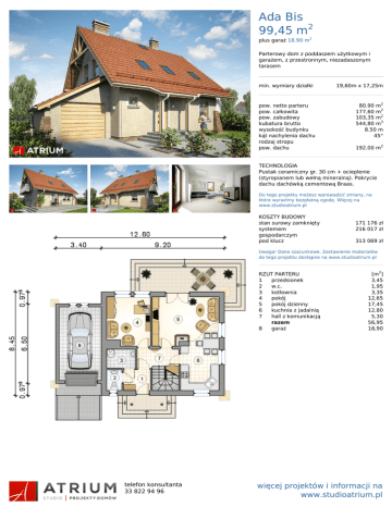 Ada Bis 99,45 m2 plus garaż 18.90 m2 Parterowy dom z poddaszem użytkowym i garażem, z przestronnym, niezadaszonym tarasem min. wymiary działki pow. netto parteru pow. całkowita pow. zabudowy kubatura brutto wysokość budynku kąt nachylenia dachu rodzaj stropu pow. dachu 19,60m x 17,25m 80.90 m2 177,60 m2 103,35 m2 544,80 m3 8.50 m 45° 192.00 m2 TECHNOLOGIA Pustak ceramiczny gr. 30 cm + ocieplenie (styropianem lub wełną mineralną). Pokrycie dachu dachówką cementową Braas. Do tego projektu możesz wprowadzić zmiany, na które wyrazimy bezpłatną zgodę. Więcej na www.studioatrium.pl KOSZTY BUDOWY stan surowy zamknięty systemem gospodarczym pod klucz 171 176 zł 216 017 zł 313 069 zł Uwaga! Dane szacunkowe. Zestawienie materiałów do tego projektu dostępne na www.studioatrium.pl RZUT PARTERU 1 przedsionek 2 w.c. 3 kotłownia 4 pokój 5 pokój dzienny 6 kuchnia z jadalnią 7 hall z komunikacją razem 8 garaż telefon konsultanta 33 822 94 96 [m2] 3,45 1,95 3,35 12,65 17,45 12,80 5,30 56,95 18,90 więcej projektów i informacji na www.studioatrium.pl RZUT PODDASZA 1 hall z komunikacją 2 łazienka 3 pokój 4 pokój 5 pokój razem telefon konsultanta 33 822 94 96 Powered by TCPDF (www.tcpdf.org) [m2] 2,75 8,80 12,10 11,05 7,80 42,50 więcej projektów i informacji na www.studioatrium.pl