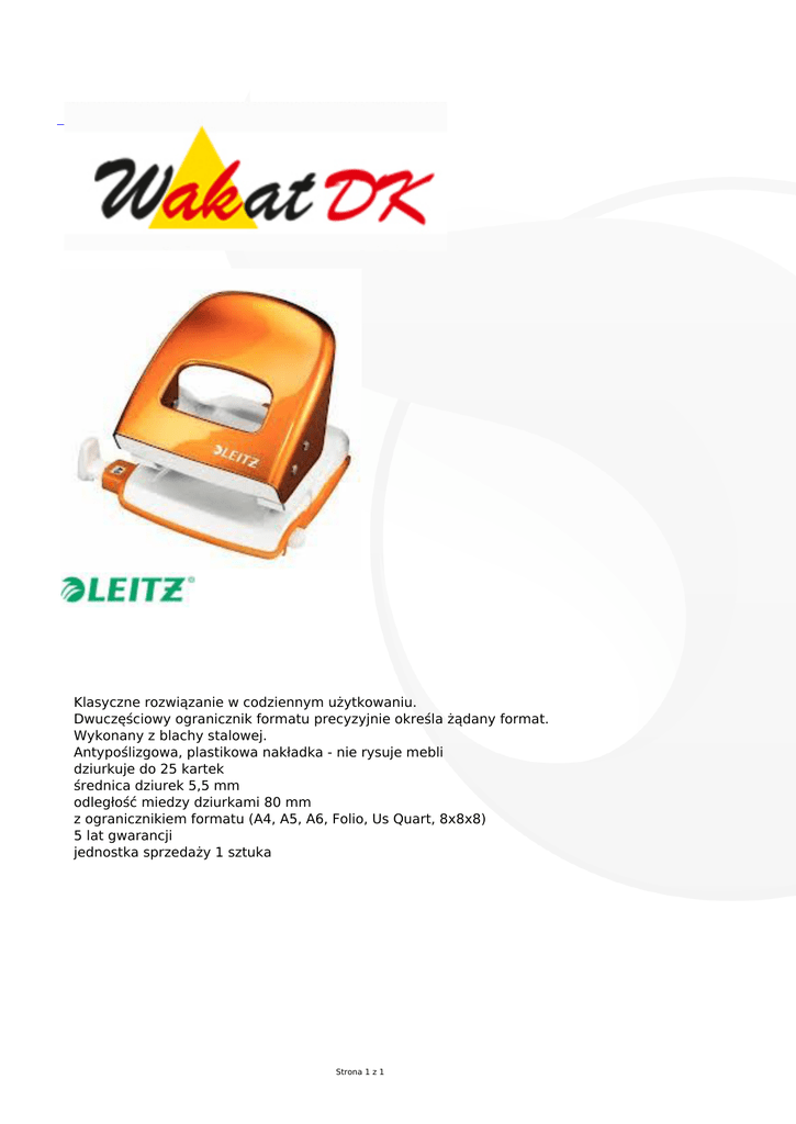 Klasyczne rozwiązanie w codziennym użytkowaniu. Dwuczęściowy ogranicznik formatu precyzyjnie określa żądany format. Wykonany z blachy stalowej. Antypoślizgowa, plastikowa nakładka - nie rysuje mebli dziurkuje do 25 kartek średnica dziurek 5,5 mm odległość miedzy dziurkami 80 mm z ogranicznikiem formatu (A4, A5, A6, Folio, Us Quart, 8x8x8) 5 lat gwarancji jednostka sprzedaży 1 sztuka Strona 1 z 1