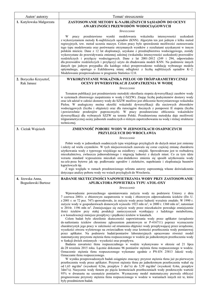 Autor/ autorzy 1. Kutyłowska Małgorzata Temat/ streszczenie ZASTOSOWANIE METODY K-NAJBLIŻSZYCH SĄSIADÓW DO OCENY AWARYJNOŚCI PRZEWODÓW WODOCIĄGOWYCH Streszczenie W pracy przedstawiono wyniki modelowania wskaźnika intensywności uszkodzeń z wykorzystaniem metody K-najbliższych sąsiadów (KNN). Algorytm ten jest jednym z kilku metod regresyjnych, tzw. metod uczenia maszyn. Celem pracy było sprawdzenie możliwości zastosowania tego typu modelowania oraz porównanie otrzymanych wyników z rezultatami uzyskanymi w innym polskim mieście. Dane z 12 lat eksploatacji, uzyskane z przedsiębiorstwa wodociągowego, zostały wykorzystane do przewidywania zmiennej zależnej (wskaźnika intensywności uszkodzeń) przewodów rozdzielczych i przyłączy wodociągowych. Dane z lat 2001-2012 (249 i 294, odpowiednio dla przewodów rozdzielczych i przyłączy) użyto do zbudowania modeli KNN. Na podstawie innych danych (po jednym przypadku dla każdego roku) przeprowadzono walidację wybranego modelu optymalnego, opartego o Euklidesową miarę odległości z liczbą najbliższych sąsiadów K=2. Modelowanie przeprowadzono w programie Statistica 12.0. 2. Boryczko Krzysztof, Rak Janusz WYKORZYSTANIE WSKAŹNIKA PIELOU OD TRÓJPARAMETRYCZNEJ OCENY DYWERSYFIKACJI ZAOPATRZENIA W WODĘ Streszczenie Tematem publikacji jest przedstawienie metodyki określania stopnia dywersyfikacji zasobów wody w systemach zbiorowego zaopatrzenia w wodę (=SZZW). Znając liczbę podsystemów dostawy wody oraz ich udział w całości dostawy wody do SZZW możliwe jest obliczenie bezwymiarowego wskaźnika Pielou. W analogiczny można określić wskaźniki dywersyfikacji dla sieciowych zbiorników wodociągowych (liczba i objętości) oraz dla rurociągów tłocznych z pompowni II stopnia (liczba i powierzchnie przekrojów poprzecznych). W pracy przedstawiono obliczenia wskaźników dywersyfikacji dla wybranych SZZW na terenie Polski. Przedstawiona metodyka daje możliwość trójparametrycznej oceny jednostek osadniczych o różnym zapotrzebowaniu na wodę i różnej strukturze technicznej. 3. Cieżak Wojciech ZMIENNOŚĆ POBORU WODY W JEDNOSTKACH OSADNICZYCH PRZYLEGŁYCH DO WROCŁAWIA Streszczenie Pobór wody w jednostkach osadniczych typu wiejskiego przyległych do dużych miast jest zmienny i zależy od wielu czynników. W tych miejscowościach zauważa się coraz częściej zmianę charakteru użytkowania wody z typowego wiejskiego na osiedlowy - miejski. Spowodowane jest to rozbudową mieszkalnictwa, zwłaszcza jednorodzinnego i migracją ludności z dużych miast. Co za tym idzie wzrasta standard wyposażenia mieszkań oraz dodatkowo zmienia się sposób użytkowania wody na cele poza bytowe jak np. podlewanie ogrodów i zieleńców, napełnianie i eksploatacja basenów kąpielowych itp. Z tego względu w ramach przedstawionego referatu autorzy zaprezentują własne doświadczenia dotyczące analizy poboru wody we wsiach przyległych do Wrocławia. 4. Iżewska Anna, Bogusławski Bartosz BADANIE SKUTECZNOŚCI NAPOWIETRZANIA WODY PRZY ZASTOSOWANIU APLIKATORA POWIETRZA TYPU ATOL-OXY Streszczenie Wprowadzenie powszechnego opomiarowania zużycia wody na podstawie Ustawy z dnia 7 czerwca 2001r. o zbiorowym zaopatrzeniu w wodę i zbiorowym odprowadzeniu ścieków (Dz. U. z 2001 r. nr 72 poz. 747) spowodowało, że zużycie wody przez ludność wyraźnie zmalało. W 1990 r. zużycie wody w gospodarstwach domowych wynosiło 1923 mln m3, w 2000 r. 1360 mln m3, natomiast w 2014r. 1196 mln m3. Zmniejszające się zużycie wody przez mieszkańców powoduje zmniejszenie ilości ścieków przy stałej produkcji zanieczyszczeń wynikający z ludzkiego metabolizmu, a w konsekwencji mniejsze przepływy i prędkości ścieków w kanałach. Celem badań było określenie skuteczności napowietrzania wody przez aplikator (urządzenie do natleniania ścieków chronione zgłoszeniem patentowym nr P-416711) poprzez wyznaczenie charakterystyk jego pracy w zależności od strumienia objętości wody przepływającej przez urządzenie, wysokości otworu wylotowego na zwierciadłem wody oraz krotności przetłoczenia wody pomiarowej przez aplikator. Na podstawie badań/pomiarów laboratoryjnych opracowano również model matematyczny przyrostu stężenia tlenu rozpuszczonego w wodzie po jednokrotnym przetłoczeniu wody w funkcji dwóch zmiennych - wysokości oraz przepływu. Badania zawartości tlenu rozpuszczalnego w wodzie wykonywano w okresie od 21 lipca do 28 września 2015 roku. Łącznie dokonano 96 pomiarów stężenia tlenu rozpuszczonego w wodzie. Oznaczenie stężenia tlenu rozpuszczonego wykonano zgodnie z PN-EN 25813 Jakość wody. Oznaczanie tlenu rozpuszczonego. W wyniku przeprowadzonych badań osiągnięto znaczący przyrost stężenia tlenu już po pierwszym przetłoczeniu wody przez aplikator. Przyrost stężenia tlenu po jednokrotnym przetłoczeniu wahał się od 1,63 mg/dm3 (wysokość 0,5m, przepływ 3 dm3/s) do 5,59 mg/dm3 (wysokość 0,4m, przepływ 3dm3/s). Nasycenie wody tlenem po pięciu krotnościach przetłoczeniach wody przekroczyło wartość 95% w dwunastu na szesnaście pomiarów. Wyznaczony model matematyczny pozwala obliczyć prognozowane przyrosty stężenia tlenu rozpuszczonego w wodzie w wariantach innych niż te, które były przedmiotem badań. 5. Siwiec Tadeusz, Reczek Lidia, Michel Magdalena PROBLEMY EKSPLOATACYJNE STACJI JEDNOSTOPNIOWEJ FILTRACJI I JEDNOSTOPNIOWEGO POMPOWANIA Z HYDROFOREM NA WYBRANYM PRZYKŁADZIE Streszczenie Układy jednostopniowego pompowania są rzadko stosowane, jednak w gminach rozległych, w których występują dwa, trzy lub więcej systemów wodociągowych zdarza się, że ze względów finansowych buduje się jeden z nich, jako system jednostopniowego pompowania z hydroforem. Takie systemy pracują mniej stabilnie, a główną przyczyną jest zmienne ciśnienie w hydroforach. Zastosowanie w tym przypadku filtracji jednostopniowej ze złożem dwu- lub trójwarstwowym potęguje