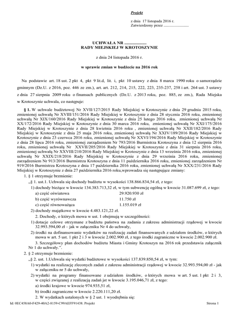 Projekt z dnia 17 listopada 2016 r. Zatwierdzony przez ......................... UCHWAŁA NR .................... RADY MIEJSKIEJ W KROTOSZYNIE z dnia 24 listopada 2016 r. w sprawie zmian w budżecie na 2016 rok Na podstawie art. 18 ust. 2 pkt 4, pkt 9 lit.d, lit. i, pkt 10 ustawy z dnia 8 marca 1990 roku o samorządzie gminnym (Dz.U. z 2016, poz. 446 ze zm.), art. art. 212, 214, 215, 222, 223, 235-237, 258 i art. 264 ust. 3 ustawy z dnia 27 sierpnia 2009 roku o finansach publicznych (Dz.U. z 2013 roku, poz. 885, ze zm.), Rada Miejska w Krotoszynie uchwala, co następuje: § 1. W uchwale budżetowej Nr XVII/127/2015 Rady Miejskiej w Krotoszynie z dnia 29 grudnia 2015 roku, zmienionej uchwałą Nr XVIII/151/2016 Rady Miejskiej w Krotoszynie z dnia 28 stycznia 2016 roku, zmienionej uchwałą Nr XIX/160/2016 Rady Miejskiej w Krotoszynie z dnia 25 lutego 2016 roku, zmienionej uchwałą Nr XX/172/2016 Rady Miejskiej w Krotoszynie z dnia 30 marca 2016 roku, zmienionej uchwałą Nr XXI/175/2016 Rady Miejskiej w Krotoszynie z dnia 28 kwietnia 2016 roku , zmienionej uchwałą Nr XXII/182/2016 Rady Miejskiej w Krotoszynie z dnia 25 maja 2016 roku, zmienionej uchwałą Nr XXIV/189/2016 Rady Miejskiej w Krotoszynie z dnia 23 czerwca 2016 roku, zmienionej uchwałą Nr XXVI/194/2016 Rady Miejskiej w Krotoszynie z dnia 28 lipca 2016 roku, zmienionej zarządzeniem Nr 793/2016 Burmistrza Krotoszyna z dnia 12 sierpnia 2016 roku, zmienionej uchwałą Nr XXVII/205/2016 Rady Miejskiej w Krotoszynie z dnia 31 sierpnia 2016 roku, zmienionej uchwałą Nr XXVIII/210/2016 Rady Miejskiej w Krotoszynie z dnia 13 września 2016 roku, zmienionej uchwałą Nr XXIX/218/2016 Rady Miejskiej w Krotoszynie z dnia 29 września 2016 roku, zmienionej zarządzeniem Nr 913/2016 Burmistrza Krotoszyna z dnia 11 października 2016 roku, zmienionej zarządzeniem Nr 919/2016 Burmistrza Krotoszyna z dnia 17 października 2016 roku, zmienionej uchwałą Nr XXX/231/2016 Rady Miejskiej w Krotoszynie z dnia 27 października 2016 roku,wprowadza się następujące zmiany: 1. § 1 otrzymuje brzmienie: „§ 1. ust.1. Uchwala się dochody budżetu w wysokości 138.866.834,54 zł, z tego: 1) dochody bieżące w kwocie 134.383.713,32 zł, w tym subwencję ogólną w kwocie 31.087.699 zł, z tego: a) część oświatowa 29.920.930 zł b) część wyrównawcza 11.750 zł c) część równoważąca 1.155.019 zł 2) dochody majątkowe w kwocie 4.483.121,22 zł. 2. Dochody, o których mowa w ust. 1 obejmują w szczególności: 1) dotacje celowe otrzymane z budżetu państwa na zadania z zakresu administracji rządowej w kwocie 32.993.594,00 zł – jak w załączniku Nr 4 do uchwały, 2) środki na dofinansowanie wydatków na realizację zadań finansowanych z udziałem środków, o których mowa w art. 5 ust. 1 pkt 2 i 3 w kwocie 2.002.900 zł, z tego środki zagraniczne w kwocie 2.002.900 zł. 3. Szczegółowy plan dochodów budżetu Miasta i Gminy Krotoszyn na 2016 rok przedstawia załącznik Nr 1 do uchwały.”. 2. § 2 otrzymuje brzmienie: „§ 2. ust. 1.Uchwala się wydatki budżetowe w wysokości 137.839.850,54 zł, w tym: 1) wydatki na realizację zleconych zadań z zakresu administracji rządowej w kwocie 32.993.594,00 zł - jak w załączniku nr 5 do uchwały, 2) wydatki na programy finansowane z udziałem środków, o których mowa w art. 5 ust. 1 pkt 2 i 3, w części związanej z realizacją zadań jst w kwocie 3.195.046,71 zł, z tego: a) środki krajowe w kwocie 974.935,51 zł, b) środki zagraniczne w kwocie 2.220.111,20 zł. 2. W wydatkach ustalonych w § 2 ust. 1 wyodrębnia się: Id: 0EC458A0-F429-40A2-8159-C99AEFF91438. Projekt Strona 1 1) wydatki bieżące w kwocie 125.310.238,88 zł, w tym: a) wynagrodzenia i pochodne od wynagrodzeń w kwocie 49.821.272,31 zł, b) obsługę długu w kwocie 1.987.000 zł. 2) wydatki majątkowe w kwocie 12.529.611,66 zł 3. Szczegółowy plan wydatków budżetu Miasta i Gminy Krotoszyn na 2016 rok przedstawia załącznik Nr 2 do uchwały.”. 3. § 3 otrzymuje brzmienie: „§ 3. W budżecie tworzy się rezerwy: 1) ogólną w wysokości 943.434,80 zł, 2) celową na realizację zadań własnych z zakresu zarządzania kryzysowego w wysokości 383.750 zł.”. 4. § 5 otrzymuje brzmienie: „§ 5. Określa się wykaz wydatków majątkowych, w tym inwestycji realizowanych przez gminę w roku budżetowym oraz wysokość nakładów zgodnie z załącznikiem Nr 3 do uchwały.”. § 2. Wykonanie uchwały powierza się Burmistrzowi Krotoszyna. § 3. Uchwała wchodzi w życie z dniem podjęcia i podlega ogłoszeniu w Dzienniku Urzędowym Województwa Wielkopolskiego. Id: 0EC458A0-F429-40A2-8159-C99AEFF91438. Projekt Strona 2 UZASADNIENIE Dochody budżetowe zwiększają się o kwotę 369.738 zł do kwoty 138.866.834,54 zł, z tego: 1) Wojewoda Wielkopolski pismem nr FB-I.3111.322.2016.2 z dnia 2 listopada 2016 roku zwiększył plan dotacji na wypłatę dodatku pracownikom socjalnym o kwotę 32.674 zł, 2) Wojewoda Wielkopolski pismem nr FB-I.3111.360.2016.4 z dnia 9 listopada 2016 roku zwiększył plan dotacji na pomoc państwa w wychowaniu dzieci o kwotę 300.000 zł, 3) Wojewoda Wielkopolski pismem nr FB-I.3111.309.2016.5 z dnia 3 listopada zwiększył plan dotacji na dofinansowanie zadań wynikających z ustawy - Prawo o aktach stanu cywilnego, ustawy o ewidencji ludności oraz ustawy o dowodach osobistych o kwotę 187.596 zł, 4) Krajowe Biuro Wyborcze pismem nr DKL-772-1/19/16 z dnia 10 listopada 2016 roku zwiększyło plan dotacji na przeprowadzenie wyborów uzupełniających o kwotę 160 zł, 4) inne zmiany (+/-) -150.692 zł. Wydatki budżetowe zwiększają się o kwotę 369.738 zł do kwoty 137.839.850,54 zł, z tego: a) wydatki bieżące zwiększają się o kwotę 169.588 zł, z tego: - zwiększenie wydatków na przeprowadzenie uzupełniających wyborów +160 zł, - zmniejszenie wydatków na oświatę o kwotę -1.602 zł, - zwiększenie wydatków na pomoc społeczną o kwotę +195.184 zł, - zw