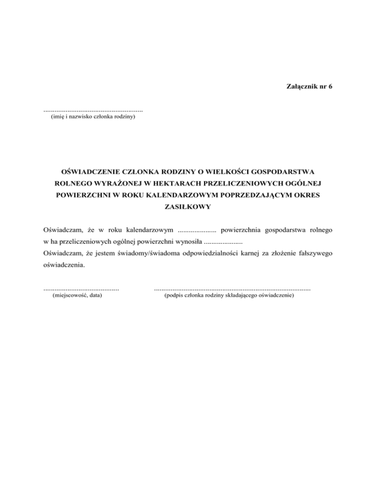 Załącznik nr 6 ...................................................... (imię i nazwisko członka rodziny) OŚWIADCZENIE CZŁONKA RODZINY O WIELKOŚCI GOSPODARSTWA ROLNEGO WYRAŻONEJ W HEKTARACH PRZELICZENIOWYCH OGÓLNEJ POWIERZCHNI W ROKU KALENDARZOWYM POPRZEDZAJĄCYM OKRES ZASIŁKOWY Oświadczam, że w roku kalendarzowym ..................... powierzchnia gospodarstwa rolnego w ha przeliczeniowych ogólnej powierzchni wynosiła ..................... Oświadczam, że jestem świadomy/świadoma odpowiedzialności karnej za złożenie fałszywego oświadczenia. ......................................... (miejscowość, data) ..................................................................................... (podpis członka rodziny składającego oświadczenie)