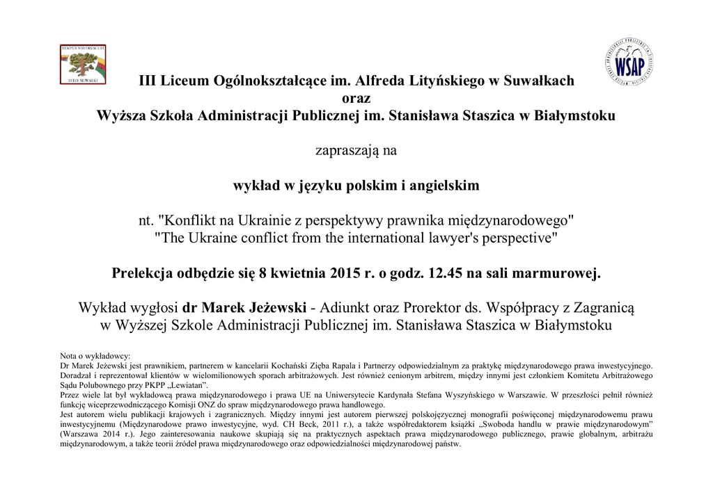 III Liceum Ogólnokształcące im. Alfreda Lityńskiego w Suwałkach oraz Wyższa Szkoła Administracji Publicznej im. Stanisława Staszica w Białymstoku zapraszają na wykład w języku polskim i angielskim nt. "Konflikt na Ukrainie z perspektywy prawnika międzynarodowego" "The Ukraine conflict from the international lawyer's perspective" Prelekcja odbędzie się 8 kwietnia 2015 r. o godz. 12.45 na sali marmurowej. Wykład wygłosi dr Marek Jeżewski - Adiunkt oraz Prorektor ds. Współpracy z Zagranicą w Wyższej Szkole Administracji Publicznej im. Stanisława Staszica w Białymstoku Nota o wykładowcy: Dr Marek Jeżewski jest prawnikiem, partnerem w kancelarii Kochański Zięba Rapala i Partnerzy odpowiedzialnym za praktykę międzynarodowego prawa inwestycyjnego. Doradzał i reprezentował klientów w wielomilionowych sporach arbitrażowych. Jest również cenionym arbitrem, między innymi jest członkiem Komitetu Arbitrażowego Sądu Polubownego przy PKPP „Lewiatan”. Przez wiele lat był wykładowcą prawa międzynarodowego i prawa UE na Uniwersytecie Kardynała Stefana Wyszyńskiego w Warszawie. W przeszłości pełnił również funkcję wiceprzewodniczącego Komisji ONZ do spraw międzynarodowego prawa handlowego. Jest autorem wielu publikacji krajowych i zagranicznych. Między innymi jest autorem pierwszej polskojęzycznej monografii poświęconej międzynarodowemu prawu inwestycyjnemu (Międzynarodowe prawo inwestycyjne, wyd. CH Beck, 2011 r.), a także współredaktorem książki „Swoboda handlu w prawie międzynarodowym” (Warszawa 2014 r.). Jego zainteresowania naukowe skupiają się na praktycznych aspektach prawa międzynarodowego publicznego, prawie globalnym, arbitrażu międzynarodowym, a także teorii źródeł prawa międzynarodowego oraz odpowiedzialności międzynarodowej państw.