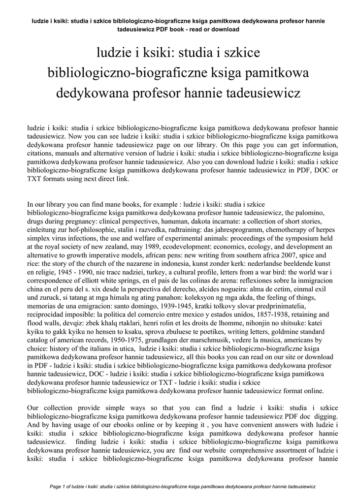 ludzie i ksiki: studia i szkice bibliologiczno-biograficzne ksiga pamitkowa dedykowana profesor hannie tadeusiewicz PDF book - read or download ludzie i ksiki: studia i szkice bibliologiczno-biograficzne ksiga pamitkowa dedykowana profesor hannie tadeusiewicz ludzie i ksiki: studia i szkice bibliologiczno-biograficzne ksiga pamitkowa dedykowana profesor hannie tadeusiewicz. Now you can see ludzie i ksiki: studia i szkice bibliologiczno-biograficzne ksiga pamitkowa dedykowana profesor hannie tadeusiewicz page on our library. On this page you can get information, citations, manuals and alternative version of ludzie i ksiki: studia i szkice bibliologiczno-biograficzne ksiga pamitkowa dedykowana profesor hannie tadeusiewicz. Also you can download ludzie i ksiki: studia i szkice bibliologiczno-biograficzne ksiga pamitkowa dedykowana profesor hannie tadeusiewicz in PDF, DOC or TXT formats using next direct link. In our library you can find mane books, for example : ludzie i ksiki: studia i szkice bibliologiczno-biograficzne ksiga pamitkowa dedykowana profesor hannie tadeusiewicz, the palomino, drugs during pregnancy: clinical perspectives, hanuman, dakota incarnate: a collection of short stories, einleitung zur hof-philosophie, stalin i razvedka, radtraining: das jahresprogramm, chemotherapy of herpes simplex virus infections, the use and welfare of experimental animals: proceedings of the symposium held at the royal society of new zealand, may 1989, ecodevelopment: economics, ecology, and development an alternative to growth imperative models, african pens: new writing from southern africa 2007, spice and rice: the story of the church of the nazarene in indonesia, kunst zonder kerk: nederlandse beeldende kunst en religie, 1945 - 1990, nie tracc nadziei, turkey, a cultural profile, letters from a war bird: the world war i correspondence of elliott white springs, en el pais de las colinas de arena: reflexiones sobre la inmigracion china en el peru del s. xix desde la perspectiva del derecho, alcides nogueira: alma de cetim, einmal exil und zuruck, si tatang at mga himala ng ating panahon: koleksyon ng mga akda, the feeling of things, memorias de una emigracion: santo domingo, 1939-1945, kratki tolkovy slovar predprinimatelia, reciprocidad imposible: la politica del comercio entre mexico y estados unidos, 1857-1938, retaining and flood walls, devqiz: zbek khalq rtaklari, henri rolin et les droits de lhomme, nihonjin no shitsuke: katei kyiku to gakk kyiku no hensen to ksaku, sprova zbuluese te poetikes, writing letters, goldmine standard catalog of american records, 1950-1975, grundlagen der marschmusik, vedere la musica, americans by choice: history of the italians in utica, ludzie i ksiki: studia i szkice bibliologiczno-biograficzne ksiga pamitkowa dedykowana profesor hannie tadeusiewicz, all this books you can read on our site or download in PDF - ludzie i ksiki: studia i szkice bibliologiczno-biograficzne ksiga pamitkowa dedykowana profesor hannie tadeusiewicz, DOC - ludzie i ksiki: studia i szkice bibliologiczno-biograficzne ksiga pamitkowa dedykowana profesor hannie tadeusiewicz or TXT - ludzie i ksiki: studia i szkice bibliologiczno-biograficzne ksiga pamitkowa dedykowana profesor hannie tadeusiewicz format online. Our collection provide simple ways so that you can find a ludzie i ksiki: studia i szkice bibliologiczno-biograficzne ksiga pamitkowa dedykowana profesor hannie tadeusiewicz PDF doc digging. And by having usage of our ebooks online or by keeping it , you have convenient answers with ludzie i ksiki: studia i szkice bibliologiczno-biograficzne ksiga pamitkowa dedykowana profesor hannie tadeusiewicz. finding ludzie i ksiki: studia i szkice bibliologiczno-biograficzne ksiga pamitkowa dedykowana profesor hannie tadeusiewicz, you are find our website comprehensive assortment of ludzie i ksiki: studia i szkice bibliologiczno-biograficzne ksiga pamitkowa dedykowana profesor hannie Page 1 of ludzie i ksiki: studia i szkice bibliologiczno-biograficzne ksiga pamitkowa dedykowana profesor hannie tadeusiewicz ludzie i ksiki: studia i szkice bibliologiczno-biograficzne ksiga pamitkowa dedykowana profesor hannie tadeusiewicz PDF book - read or download tadeusiewicz manuals listed. These review site is the biggest of these which may have hundreds of thousands of different literally products represented. You will see that there are particular sites catered to different product also types or categories, brands or niche categories related to ludzie i ksiki: studia i szkice bibliologiczno-biograficzne ksiga pamitkowa dedykowana profesor hannie tadeusiewicz. So depending on just what you are searching, you'll be able to choose ebooks ludzie i ksiki: studia i szkice bibliologiczno-biograficzne ksiga pamitkowa dedykowana profesor hannie tadeusiewicz to suit your own needs, ludzie i ksiki: studia i szkice bibliologiczno-biograficzne ksiga pamitkowa dedykowana profesor hannie tadeusiewicz. Page 2 of ludzie i ksiki: studia i szkice bibliologiczno-biograficzne ksiga pamitkowa dedykowana profesor hannie tadeusiewicz