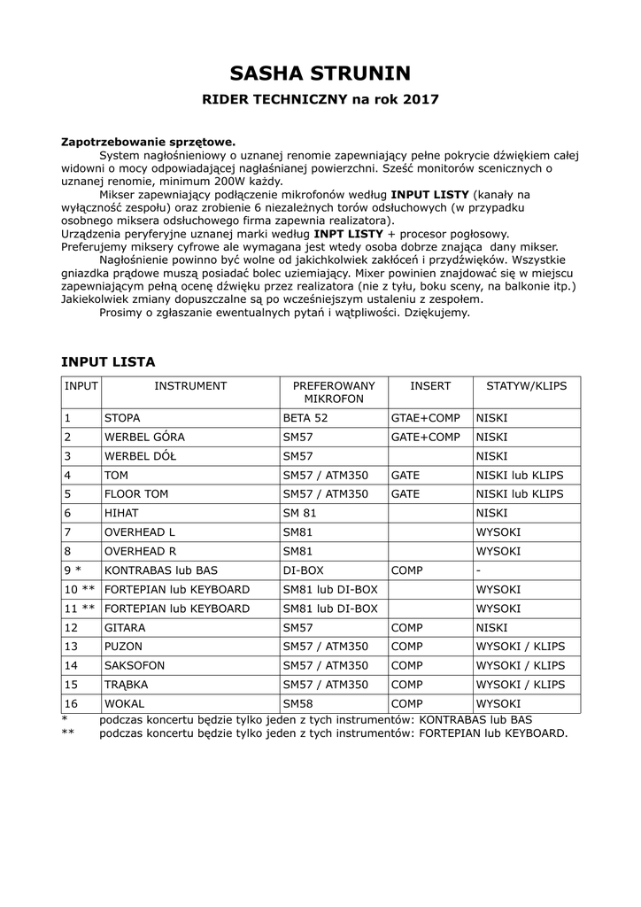 SASHA STRUNIN RIDER TECHNICZNY na rok 2017 Zapotrzebowanie sprzętowe. System nagłośnieniowy o uznanej renomie zapewniający pełne pokrycie dźwiękiem całej widowni o mocy odpowiadającej nagłaśnianej powierzchni. Sześć monitorów scenicznych o uznanej renomie, minimum 200W każdy. Mikser zapewniający podłączenie mikrofonów według INPUT LISTY (kanały na wyłączność zespołu) oraz zrobienie 6 niezależnych torów odsłuchowych (w przypadku osobnego miksera odsłuchowego firma zapewnia realizatora). Urządzenia peryferyjne uznanej marki według INPT LISTY + procesor pogłosowy. Preferujemy miksery cyfrowe ale wymagana jest wtedy osoba dobrze znająca dany mikser. Nagłośnienie powinno być wolne od jakichkolwiek zakłóceń i przydźwięków. Wszystkie gniazdka prądowe muszą posiadać bolec uziemiający. Mixer powinien znajdować się w miejscu zapewniającym pełną ocenę dźwięku przez realizatora (nie z tyłu, boku sceny, na balkonie itp.) Jakiekolwiek zmiany dopuszczalne są po wcześniejszym ustaleniu z zespołem. Prosimy o zgłaszanie ewentualnych pytań i wątpliwości. Dziękujemy. INPUT LISTA INPUT INSTRUMENT PREFEROWANY MIKROFON INSERT STATYW/KLIPS 1 STOPA BETA 52 GTAE+COMP NISKI 2 WERBEL GÓRA SM57 GATE+COMP NISKI 3 WERBEL DÓŁ SM57 4 TOM SM57 / ATM350 GATE NISKI lub KLIPS 5 FLOOR TOM SM57 / ATM350 GATE NISKI lub KLIPS 6 HIHAT SM 81 NISKI 7 OVERHEAD L SM81 WYSOKI 8 OVERHEAD R SM81 WYSOKI 9* KONTRABAS lub BAS DI-BOX NISKI COMP - 10 ** FORTEPIAN lub KEYBOARD SM81 lub DI-BOX WYSOKI 11 ** FORTEPIAN lub KEYBOARD SM81 lub DI-BOX WYSOKI 12 GITARA SM57 COMP NISKI 13 PUZON SM57 / ATM350 COMP WYSOKI / KLIPS 14 SAKSOFON SM57 / ATM350 COMP WYSOKI / KLIPS 15 TRĄBKA SM57 / ATM350 COMP WYSOKI / KLIPS 16 * ** WOKAL SM58 COMP WYSOKI podczas koncertu będzie tylko jeden z tych instrumentów: KONTRABAS lub BAS podczas koncertu będzie tylko jeden z tych instrumentów: FORTEPIAN lub KEYBOARD. PLAN SCENY Kontakt z prasą i impesario: Hanna Białoń KOSTRZEWA PR +48 609 104 895 [email protected] Sprawy organizacyjne i techniczne: Małgorzata Zalewska +48 604 230 999