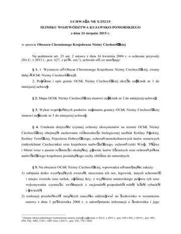 UCHWAŁA NR X/252/15 SEJMIKU WOJEWÓDZTWA KUJAWSKO-POMORSKIEGO z dnia 24 sierpnia 2015 r. w sprawie Obszaru Chronionego Krajobrazu Niziny Ciechocińskiej Na podstawie art. 23 ust. 2 ustawy z dnia 16 kwietnia 2004 r. o ochronie przyrody (Dz.U. z 2013 r., poz. 627, z późn. zm.1), uchwala się, co następuje: § 1. 1. Wyznacza się Obszar Chronionego Krajobrazu Niziny Ciechocińskiej, zwany dalej „OChK Niziny Ciechocińskiej”. 2. Położenie i opis granic OChK Niziny Ciechocińskiej określa załącznik nr 1 do niniejszej uchwały. § 2. Mapa OChK Niziny Ciechocińskiej stanowi załącznik nr 2 do niniejszej uchwały. § 3. Wykaz współrzędnych punktów załamania granicy OChK Niziny Ciechocińskiej stanowi załącznik nr 3 do niniejszej uchwały. § 4. Ustalenia dotyczące czynnej ochrony ekosystemów na terenie OChK Niziny Ciechocińskiej obejmują: zachowanie różnorodności biologicznej siedlisk Kotliny Płockiej, Kotliny Toruńskiej, Pojezierza Dobrzyńskiego, ochronę monokulturowych lasów sosnowych (mikroklimat Ciechocinka) oraz krajobrazu nadwiślańskiego, ochronę rzeki Wisły, Tążyny i Mieni wraz z pasem roślinności okalającej, głównie lasów liściastych oraz ochronę piękna nadwiślańskiego krajobrazu posiadającego cechy zbliżone do naturalnych. § 5. Na obszarze OChK Niziny Ciechocińskiej, wprowadza się następujące zakazy: 1) zabijania dziko występujących zwierząt, niszczenia ich nor, legowisk, innych schronień i miejsc rozrodu oraz tarlisk, złożonej ikry, z wyjątkiem amatorskiego połowu ryb oraz wykonywania czynności związanych z racjonalną gospodarką rolną, leśną, rybacką i łowiecką; 2) realizacji przedsięwzięć mogących znacząco oddziaływać na środowisko w rozumieniu ustawy z dnia 3 października 2008 r. o udostępnianiu informacji o środowisku i jego 1 Zmiany tekstu jednolitego wymienionej ustawy zostały ogłoszone w Dz.U. z 2013 r., poz. 628 i 842, z 2014 r., poz. 805, 850, 926, 1002, 1101 i 1863 oraz z 2015 r., poz. 222, 774 i 1045. ochronie, udziale społeczeństwa w ochronie środowiska oraz o ocenach oddziaływania na środowisko; 3) likwidowania i niszczenia zadrzewień śródpolnych, przydrożnych i nadwodnych, jeżeli nie wynikają one z potrzeby ochrony przeciwpowodziowej i zapewnienia bezpieczeństwa ruchu drogowego lub wodnego lub budowy, odbudowy, utrzymania, remontów lub naprawy urządzeń wodnych; 4) wykonywania prac ziemnych trwale zniekształcających rzeźbę terenu, z wyjątkiem prac związanych z zabezpieczeniem przeciwpowodziowym lub przeciwosuwiskowym lub utrzymaniem, budową, odbudową, naprawą lub remontem urządzeń wodnych; 5) dokonywania zmian stosunków wodnych, jeżeli służą innym celom niż ochrona przyrody lub zrównoważone wykorzystanie użytków rolnych i leśnych oraz racjonalnej gospodarce wodnej lub rybackiej; 6) likwidowania naturalnych zbiorników wodnych, starorzeczy i obszarów wodno-błotnych; 7) lokalizowania obiektów budowlanych w pasie szerokości 100 m od linii brzegów rzek, jezior i innych zbiorników wodnych, z wyjątkiem urządzeń wodnych oraz obiektów służących prowadzeniu racjonalnej gospodarki rolnej, leśnej lub rybackiej. § 6. 1. Zakaz o którym mowa w § 5 pkt 4 nie dotyczy działki ewidencyjnej nr 040108_2.0008.78/8 w miejscowości Przypust Górny, gmina Waganiec. 2. Wykaz współrzędnych punktów załamania granicy obszaru określonego w ust. 1 stanowi załącznik nr 4 do niniejszej uchwały. § 7. Do postępowań, których przedmiotem jest uchwalenie lub zmiana miejscowego planu zagospodarowania przestrzennego lub studium uwarunkowań i kierunków zagospodarowania przestrzennego, w których przed dniem wejścia w życie niniejszej uchwały podjęto uchwałę o przystąpieniu do sporządzenia lub zmiany planu lub studium oraz zawiadomiono o terminie wyłożenia ich projektów do publicznego wglądu, ale postępowanie nie zostało zakończone przed wejściem w życie niniejszej uchwały, stosuje się przepisy uchwały Nr VI/106/11 Sejmiku Województwa Kujawsko-Pomorskiego z dnia 21 marca 2011 r. w sprawie obszarów chronionego krajobrazu (Dz. Urz. Woj. Kujawsko-Pomorskiego Nr 99, poz. 793), w brzmieniu obowiązującym przed wejściem w życie niniejszej uchwały. § 8. Nadzór nad Obszarem Chronionego Krajobrazu Niziny Ciechocińskiej sprawuje Marszałek Województwa Kujawsko-Pomorskiego. § 9. Wykonanie uchwały powierza się Zarządowi Województwa KujawskoPomorskiego. § 10. Traci moc uchwała Nr VI/106/11 Sejmiku Województwa KujawskoPomorskiego z dnia 21 marca 2011 r. w sprawie obszarów chronionego krajobrazu (Dz. Urz. Woj. Kujawsko-Pomorskiego Nr 99, poz. 793), w części dotyczącej Obszaru Chronionego Krajobrazu Niziny Ciechocińskiej wraz z załącznikiem nr 29. § 11. Uchwała wchodzi w życie po upływie 14 dni od dnia ogłoszenia w Dzienniku Urzędowym Województwa Kujawsko-Pomorskiego. UZASADNIENIE 1. Przedmiot regulacji: Zakres regulacji dotyczy przyjęcia uchwały w sprawie Obszaru Chronionego Krajobrazu Niziny Ciechocińskiej. 2. Podstawa prawna: -ustawa z dnia 16 kwietnia 2004 r. o ochronie przyrody (Dz.U. z 2013 r., poz. 627, z późn. zm.): Art. 23. 2. Wyznaczenie obszaru chronionego krajobrazu następuje w drodze uchwały sejmiku województwa, która określa jego nazwę, położenie, obszar, sprawującego nadzór, ustalenia dotyczące czynnej ochrony ekosystemów oraz zakazy właściwe dla danego obszaru chronionego krajobrazu lub jego części, wybrane spośród zakazów wymienionych w art. 24 ust. 1, wynikające z potrzeb jego ochrony. Likwidacja lub zmiana granic obszaru chronionego krajobrazu następuje w drodze uchwały sejmiku województwa, po zaopiniowaniu przez właściwe miejscowo rady gmin, z powodu bezpowrotnej utraty wyróżniającego się krajobrazu o zróżnicowanych ekosystemach i możliwości zaspokajania potrzeb związanych z turystyką i wypoczynkiem. 3. Projekty uchwał sejmiku województwa, o których mowa w ust.