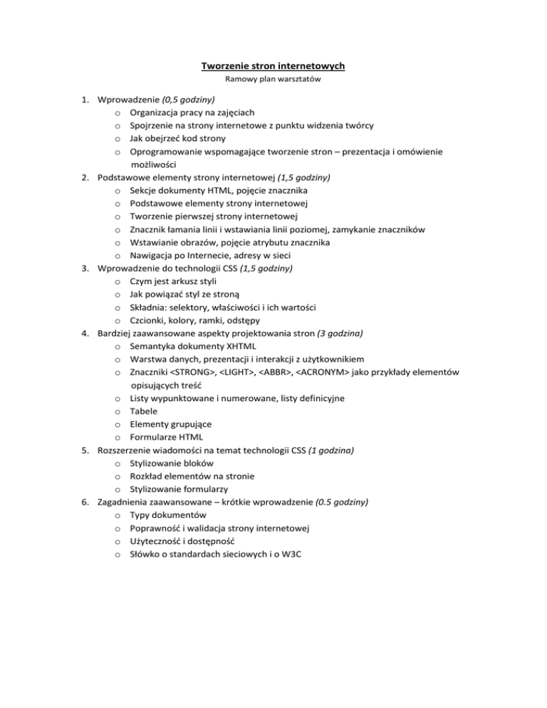 Tworzenie stron internetowych Ramowy plan warsztatów 1. Wprowadzenie (0,5 godziny) o Organizacja pracy na zajęciach o Spojrzenie na strony internetowe z punktu widzenia twórcy o Jak obejrzed kod strony o Oprogramowanie wspomagające tworzenie stron – prezentacja i omówienie możliwości 2. Podstawowe elementy strony internetowej (1,5 godziny) o Sekcje dokumenty HTML, pojęcie znacznika o Podstawowe elementy strony internetowej o Tworzenie pierwszej strony internetowej o Znacznik łamania linii i wstawiania linii poziomej, zamykanie znaczników o Wstawianie obrazów, pojęcie atrybutu znacznika o Nawigacja po Internecie, adresy w sieci 3. Wprowadzenie do technologii CSS (1,5 godziny) o Czym jest arkusz styli o Jak powiązad styl ze stroną o Składnia: selektory, właściwości i ich wartości o Czcionki, kolory, ramki, odstępy 4. Bardziej zaawansowane aspekty projektowania stron (3 godzina) o Semantyka dokumenty XHTML o Warstwa danych, prezentacji i interakcji z użytkownikiem o Znaczniki <STRONG>, <LIGHT>, <ABBR>, <ACRONYM> jako przykłady elementów opisujących treśd o Listy wypunktowane i numerowane, listy definicyjne o Tabele o Elementy grupujące o Formularze HTML 5. Rozszerzenie wiadomości na temat technologii CSS (1 godzina) o Stylizowanie bloków o Rozkład elementów na stronie o Stylizowanie formularzy 6. Zagadnienia zaawansowane – krótkie wprowadzenie (0.5 godziny) o Typy dokumentów o Poprawnośd i walidacja strony internetowej o Użytecznośd i dostępnośd o Słówko o standardach sieciowych i o W3C