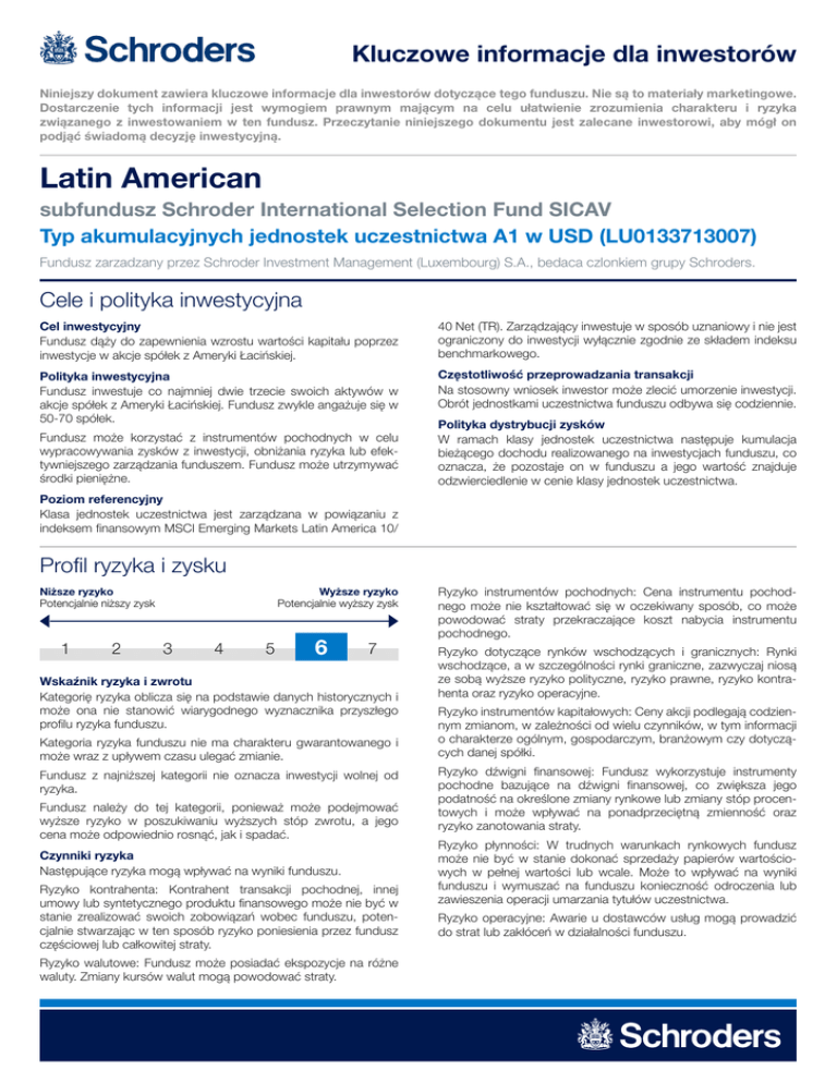 Kluczowe informacje dla inwestorów Niniejszy dokument zawiera kluczowe informacje dla inwestorów dotyczące tego funduszu. Nie są to materiały marketingowe. Dostarczenie tych informacji jest wymogiem prawnym mającym na celu ułatwienie zrozumienia charakteru i ryzyka związanego z inwestowaniem w ten fundusz. Przeczytanie niniejszego dokumentu jest zalecane inwestorowi, aby mógł on podjąć świadomą decyzję inwestycyjną. Latin American subfundusz Schroder International Selection Fund SICAV Typ akumulacyjnych jednostek uczestnictwa A1 w USD (LU0133713007) Fundusz zarzadzany przez Schroder Investment Management (Luxembourg) S.A., bedaca czlonkiem grupy Schroders. Cele i polityka inwestycyjna Cel inwestycyjny Fundusz dąży do zapewnienia wzrostu wartości kapitału poprzez inwestycje w akcje spółek z Ameryki Łacińskiej. 40 Net (TR). Zarządzający inwestuje w sposób uznaniowy i nie jest ograniczony do inwestycji wyłącznie zgodnie ze składem indeksu benchmarkowego. Polityka inwestycyjna Fundusz inwestuje co najmniej dwie trzecie swoich aktywów w akcje spółek z Ameryki Łacińskiej. Fundusz zwykle angażuje się w 50-70 spółek. Częstotliwość przeprowadzania transakcji Na stosowny wniosek inwestor może zlecić umorzenie inwestycji. Obrót jednostkami uczestnictwa funduszu odbywa się codziennie. Fundusz może korzystać z instrumentów pochodnych w celu wypracowywania zysków z inwestycji, obniżania ryzyka lub efektywniejszego zarządzania funduszem. Fundusz może utrzymywać środki pieniężne. Polityka dystrybucji zysków W ramach klasy jednostek uczestnictwa następuje kumulacja bieżącego dochodu realizowanego na inwestycjach funduszu, co oznacza, że pozostaje on w funduszu a jego wartość znajduje odzwierciedlenie w cenie klasy jednostek uczestnictwa. Poziom referencyjny Klasa jednostek uczestnictwa jest zarządzana w powiązaniu z indeksem finansowym MSCI Emerging Markets Latin America 10/ Profil ryzyka i zysku Niższe ryzyko Potencjalnie niższy zysk 1 2 Wyższe ryzyko Potencjalnie wyższy zysk 3 4 5 6 7 Wskaźnik ryzyka i zwrotu Kategorię ryzyka oblicza się na podstawie danych historycznych i może ona nie stanowić wiarygodnego wyznacznika przyszłego profilu ryzyka funduszu. Kategoria ryzyka funduszu nie ma charakteru gwarantowanego i może wraz z upływem czasu ulegać zmianie. Fundusz z najniższej kategorii nie oznacza inwestycji wolnej od ryzyka. Fundusz należy do tej kategorii, ponieważ może podejmować wyższe ryzyko w poszukiwaniu wyższych stóp zwrotu, a jego cena może odpowiednio rosnąć, jak i spadać. Czynniki ryzyka Następujące ryzyka mogą wpływać na wyniki funduszu. Ryzyko kontrahenta: Kontrahent transakcji pochodnej, innej umowy lub syntetycznego produktu finansowego może nie być w stanie zrealizować swoich zobowiązań wobec funduszu, potencjalnie stwarzając w ten sposób ryzyko poniesienia przez fundusz częściowej lub całkowitej straty. Ryzyko walutowe: Fundusz może posiadać ekspozycje na różne waluty. Zmiany kursów walut mogą powodować straty. Ryzyko instrumentów pochodnych: Cena instrumentu pochodnego może nie kształtować się w oczekiwany sposób, co może powodować straty przekraczające koszt nabycia instrumentu pochodnego. Ryzyko dotyczące rynków wschodzących i granicznych: Rynki wschodzące, a w szczególności rynki graniczne, zazwyczaj niosą ze sobą wyższe ryzyko polityczne, ryzyko prawne, ryzyko kontrahenta oraz ryzyko operacyjne. Ryzyko instrumentów kapitałowych: Ceny akcji podlegają codziennym zmianom, w zależności od wielu czynników, w tym informacji o charakterze ogólnym, gospodarczym, branżowym czy dotyczących danej spółki. Ryzyko dźwigni finansowej: Fundusz wykorzystuje instrumenty pochodne bazujące na dźwigni finansowej, co zwiększa jego podatność na określone zmiany rynkowe lub zmiany stóp procentowych i może wpływać na ponadprzeciętną zmienność oraz ryzyko zanotowania straty. Ryzyko płynności: W trudnych warunkach rynkowych fundusz może nie być w stanie dokonać sprzedaży papierów wartościowych w pełnej wartości lub wcale. Może to wpływać na wyniki funduszu i wymuszać na funduszu konieczność odroczenia lub zawieszenia operacji umarzania tytułów uczestnictwa. Ryzyko operacyjne: Awarie u dostawców usług mogą prowadzić do strat lub zakłóceń w działalności funduszu. Schroder International Selection Fund SICAV Latin American Opłaty Opłaty jednorazowe pobierane przed lub po dokonaniu inwestycji Opłata za subskrypcję 4,00% Opłata za umorzenie brak Wyszczególnione opłaty za nabycie i umorzenie są wartościami maksymalnymi, w pewnych przypadkach inwestor może zostać obciążony niższymi kwotami. Inwestor może zapoznać się z aktualnie obowiązującymi opłatami za nabycie i umorzenie u swego doradcy finansowego. Jest to maksymalna kwota, jaka może zostać pobrana z Państwa środków przed ich zainwestowaniem. Opłaty pobierane z funduszu w ciągu roku Opłaty bieżące 2,40% Wysokość opłat bieżących określa się na podstawie kosztów poniesionych za rok zakończony w grudnia 2016 r i mogą one z roku na rok ulegać zmianie. Opłaty pobierane z funduszu w określonych warunkach szczególnych Opłata za wyniki Opłaty ponoszone przez inwestora służą pokryciu kosztów działalności funduszu, w tym kosztów jego marketingu i dystrybucji. Opłaty obniżają stopę potencjalnego wzrostu wartości inwestycji. brak Więcej informacji na temat opłat można znaleźć w części 3 prospektu informacyjnego funduszu. Wyniki osiągnięte w przeszłości % Q Typ akumulacyjnych A1 w USD (LU0133713007) Q MSCI Emerging Markets Latin America 10/40 Net (TR) Wyniki osiągnięte w przeszłości nie stanowią gwarancji wyników przyszłych i mogą nie zostać powtórzone. Wartość inwestycji może zarówno spadać, jak i rosnąć, a inwestor może nie odzyskać pierwotnie zainwestowanej kwoty. 100 Wykres pokazuje stopę zwrotu w dol