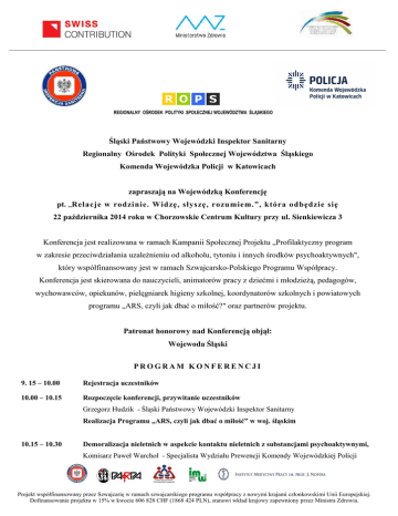 REGIONALNY OŚRODEK POLITYKI SPOŁECZNEJ WOJEWÓDZTWA ŚLĄSKIEGO Śląski Państwowy Wojewódzki Inspektor Sanitarny Regionalny Ośrodek Polityki Społecznej Województwa Śląskiego Komenda Wojewódzka Policji w Katowicach zapraszają na Wojewódzką Konferencję pt. „Relacje w rodzinie. Widzę, słyszę, rozumiem.”, która odbędzie się 22 października 2014 roku w Chorzowskie Centrum Kultury przy ul. Sienkiewicza 3 Konferencja jest realizowana w ramach Kampanii Społecznej Projektu „Profilaktyczny program w zakresie przeciwdziałania uzaleŜnieniu od alkoholu, tytoniu i innych środków psychoaktywnych", który współfinansowany jest w ramach Szwajcarsko-Polskiego Programu Współpracy. Konferencja jest skierowana do nauczycieli, animatorów pracy z dziećmi i młodzieŜą, pedagogów, wychowawców, opiekunów, pielęgniarek higieny szkolnej, koordynatorów szkolnych i powiatowych programu „ARS, czyli jak dbać o miłość?" oraz partnerów projektu. Patronat honorowy nad Konferencją objął: Wojewoda Śląski PROGRAM KONFERENCJI 9. 15 – 10.00 Rejestracja uczestników 10.00 – 10.15 Rozpoczęcie konferencji, przywitanie uczestników Grzegorz Hudzik - Śląski Państwowy Wojewódzki Inspektor Sanitarny Realizacja Programu „ARS, czyli jak dbać o miłość” w woj. śląskim 10.15 – 10.30 Demoralizacja nieletnich w aspekcie kontaktu nieletnich z substancjami psychoaktywnymi, Komisarz Paweł Warchoł - Specjalista Wydziału Prewencji Komendy Wojewódzkiej Policji Projekt współfinansowany przez Szwajcarię w ramach szwajcarskiego programu współpracy z nowymi krajami członkowskimi Unii Europejskiej. Dofinansowanie projektu w 15% w kwocie 606 828 CHF (1868 424 PLN), stanowi wkład krajowy zapewniony przez Ministra Zdrowia. w Katowicach 10.30 – 11.15 Bezpieczna więź jako czynnik chroniący rodzinę, Liliana Krzywicka – Kierownik Ośrodka Interwencji Kryzysowej w Katowicach 11.15 – 12.00 RóŜnorodna struktura relacji i zróŜnicowanie ochrony. Kiedy relacje międzyludzkie mogą szkodzić, a kiedy chronią przed ryzykownymi zachowaniami, dr Krzysztof Wojcieszek – PEDAGOGIUM WyŜsza Szkoła Nauk Społecznych w Warszawie 12.00 – 12.30 Gdy zagraŜa uzaleŜnienie – FreD goes net i Candis, Maria Siwek - Członek Zarządu Głównego Polskiego Towarzystwa Zapobiegania Narkomanii 12.30 – 12.50 Przerwa 12.50 – 13.20 Wolny czy uwięziony – co na to Twoja rodzina?, Mariola Kujańska – Członek Polskiego Towarzystwa Psychologicznego 13.20 – 13.50 Trudna gra wychowawcza - Program Wzmacniania Rodziny, jako sposób pracy z rodziną w celu ograniczenia picia alkoholu i używania narkotyków przez dzieci i młodzież, Gierek Robert – Dyrektor Ośrodka Psychoterapii i Promocji Rodziny w Chorzowie 14.00 Podsumowanie konferencji KaŜdy uczestnik otrzymuje zaświadczenie udziału w konferencji Projekt współfinansowany przez Szwajcarię w ramach szwajcarskiego programu współpracy z nowymi krajami członkowskimi Unii Europejskiej. Dofinansowanie projektu w 15% w kwocie 606 828 CHF (1868 424 PLN), stanowi wkład krajowy zapewniony przez Ministra Zdrowia.