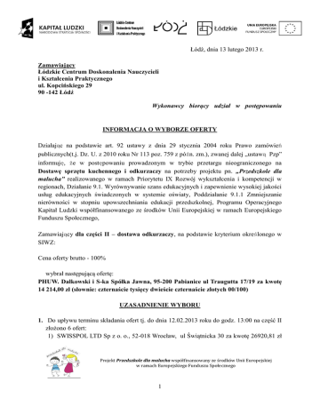 Łódź, dnia 13 lutego 2013 r. Zamawiający Łódzkie Centrum Doskonalenia Nauczycieli i Kształcenia Praktycznego ul. Kopcińskiego 29 90 -142 Łódź Wykonawcy biorący udział w postępowaniu INFORMACJA O WYBORZE OFERTY Działając na podstawie art. 92 ustawy z dnia 29 stycznia 2004 roku Prawo zamówień publicznych(t.j. Dz. U. z 2010 roku Nr 113 poz. 759 z późn. zm.), zwanej dalej „ustawą Pzp” informuję, że w postępowaniu prowadzonym w trybie przetargu nieograniczonego na Dostawę sprzętu kuchennego i odkurzaczy na potrzeby projektu pn. „Przedszkole dla malucha” realizowanego w ramach Priorytetu IX Rozwój wykształcenia i kompetencji w regionach, Działanie 9.1. Wyrównywanie szans edukacyjnych i zapewnienie wysokiej jakości usług edukacyjnych świadczonych w systemie oświaty, Poddziałanie 9.1.1 Zmniejszanie nierówności w stopniu upowszechniania edukacji przedszkolnej, Programu Operacyjnego Kapitał Ludzki współfinansowanego ze środków Unii Europejskiej w ramach Europejskiego Funduszu Społecznego, Zamawiający dla części II – dostawa odkurzaczy, na podstawie kryterium określonego w SIWZ: Cena oferty brutto - 100% wybrał następującą ofertę: PHUW. Dałkowski i S-ka Spółka Jawna, 95-200 Pabianice ul Traugutta 17/19 za kwotę 14 214,00 zł (słownie: czternaście tysięcy dwieście czternaście złotych 00/100) UZASADNIENIE WYBORU 1. Do upływu terminu składania ofert tj. do dnia 12.02.2013 roku do godz. 13:00 na część II złożono 6 ofert: 1) SWISSPOL LTD Sp z o. o., 52-018 Wrocław, ul Świątnicka 30 za kwotę 26920,81 zł Projekt Przedszkole dla malucha współfinansowany ze środków Unii Europejskiej w ramach Europejskiego Funduszu Społecznego 1 (słownie: dwadzieścia sześć tysięcy dziewięćset dwadzieścia złotych 81/100), 2) PHU "BMS" SP. J. Z.Bielecki, T.Białowąs, 82-500 Kwidzyn, ul Stasica 22 za kwotę 14 871,80 zł (słownie: czternaście tysięcy osiemset siedemdziesiąt jeden złotych 80/100) 3) PHUW. Dałkowski i S-ka Spółka Jawna, 95-200 Pabianice ul Traugutta 17/19 za kwotę 14 214,00 zł (słownie: czternaście tysięcy dwieście czternaście złotych 00/100) 4) PW "MATI" Krzysztof Czarnecki, 81-504 Gdynia ul Łowicka 1/2 za kwotę 23 736,00 zł (słownie: dwadzieścia trzy tysiące siedemset trzydzieści sześć złotych 00/100) 5) CASTEL S.C. 91-463 Łódź, ul Łagiewnicka 54/56 za kwotę 16 077,00 zł (słownie: szesnaście tysięcy siedemdziesiąt siedem złotych 00/100) 6) PRO-HAND S.C. Monika Marcin Tomasionek, 41-200 Sosnowiec, ul Wieczorka 2a/107 za kwotę 14 719,29 zł.(słownie: czternaście tysięcy siedemset dziewiętnaście złotych 29/100) 2. W postępowaniu dot. Części II odrzucono następujące oferty: 1) SWISSPOL LTD Sp z o. o., 52-018 Wrocław, ul Świątnicka 30 na podstawie art.89 ust.1 pkt 2 ustawy Pzp, z powodu niezgodności oferty z treścią SIWZ. Zamawiający wymagał złożenia wraz z ofertą dokumentu potwierdzającego, że oferowane dostawy odpowiadają wymaganiom określonym przez zamawiającego w postaci opisu oferowanych urządzeń technicznych ze wskazaniem: typu urządzenia, producenta oraz szczegółowej specyfikacji urządzenia. Wykonawca nie załączył wymaganego dokumentu. Dokument ten z uwagi na jego charakter nie jest dokumentem podlegającym uzupełnieniu, bowiem obejmuje on treść oferty i jego uzupełnienie było by sprzeczne z treścią art. 87 ust.1 ustawy Pzp jako niedopuszczalna negocjacja treści oferty. W związku z powyższym nie można określić, czy oferowany sprzęt spełnia wymogi SIWZ, a więc oferta podlega odrzuceniu jako niezgodna z treścią SIWZ. 2) PHU "BMS" SP. J. Z.Bielecki, T.Białowąs, 82-500 Kwidzyn, ul Stasica 22 na podstawie art.89 ust.1 pkt 2 ustawy Pzp, z powodu niezgodności oferty z treścią SIWZ. Zamawiający wymagał złożenia wraz z ofertą dokumentu potwierdzającego, że oferowane dostawy odpowiadają wymaganiom określonym przez zamawiającego w postaci opisu oferowanych urządzeń technicznych ze wskazaniem: typu urządzenia, producenta oraz szczegółowej specyfikacji urządzenia. Wykonawca nie załączył wymaganego dokumentu. Dokument ten z uwagi na jego charakter nie jest dokumentem podlegającym uzupełnieniu, bowiem obejmuje on treść oferty i jego uzupełnienie było by sprzeczne z treścią art. 87 ust.1 ustawy Pzp jako niedopuszczalna negocjacja treści oferty. W związku z powyższym nie można określić, czy oferowany Projekt Przedszkole dla malucha współfinansowany ze środków Unii Europejskiej w ramach Europejskiego Funduszu Społecznego 2 sprzęt spełnia wymogi SIWZ, a więc oferta podlega odrzuceniu jako niezgodna z treścią SIWZ. 2. Lp. Wybór najkorzystniejszej oferty dla części II: Nazwa wykonawcy (imię i nazwisko Wykonawcy) Cena Kryterium: PHUW. Dałkowski i S-ka Spółka Jawna, 95-200 Pabianice ul Traugutta 17/19 14 214,00 zł 2 PW "MATI" Krzysztof Czarnecki, 81-504 Gdynia ul Łowicka 1/2 23 736,00 zł 3 CASTEL S.C. 91-463 Łódź, ul Łagiewnicka 54/56 16 077,00 zł 88,41 pkt 4 PRO-HAND S.C. Monika Marcin Tomasionek, 41-200 Sosnowiec, ul Wieczorka 2a/107 14 719,29 zł 96,56 pkt 1 Miejsce Cena oferty brutto 100 pkt I 59,88 pkt IV III II Oferta złożona przez PHUW. Dałkowski i S-ka Spółka Jawna, 95-200 Pabianice ul Traugutta 17/19 za kwotę 14 214,00 zł (słownie: czternaście tysięcy dwieście czternaście złotych 00/100) spełnia warunki SIWZ i jest zgodna z ustawą Pzp. W ocenie dokonanej na podstawie kryterium określonego w SIWZ oferta uzyskała 100 punktów. Zaoferowana cena nie przekracza kwoty, którą Zamawiający może przeznaczyć na sfinansowanie zamówienia Zgodnie z art. 94 ust.1 pkt 2 ustawy Pzp umowa w sprawie zamówienia publicznego może być zawarta w terminie nie krótszym niż 5 dni od dnia przesłania zawiadomienia o wyborze najkorzystniejszej oferty, jeżeli zawiadomienie to zostało przesłane w sposób określony w art.27 ust.2 (faksem lub drogą elektroniczną) albo 10 d