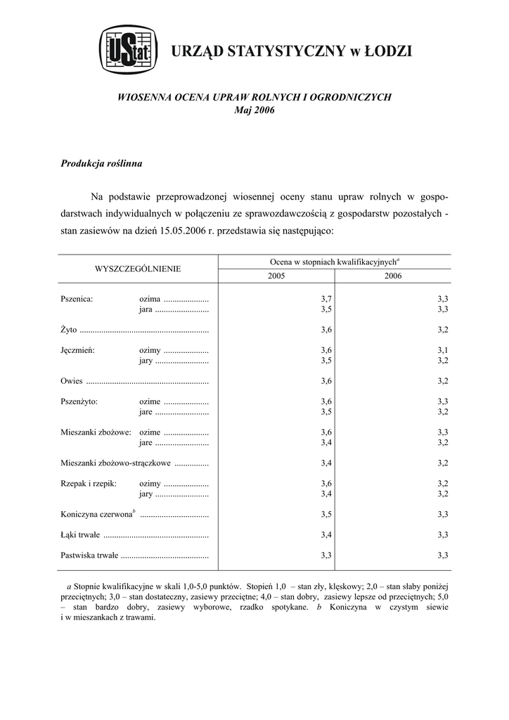 WIOSENNA OCENA UPRAW ROLNYCH I OGRODNICZYCH Maj 2006 Produkcja roślinna Na podstawie przeprowadzonej wiosennej oceny stanu upraw rolnych w gospodarstwach indywidualnych w połączeniu ze sprawozdawczością z gospodarstw pozostałych stan zasiewów na dzień 15.05.2006 r. przedstawia się następująco: WYSZCZEGÓLNIENIE Pszenica: Ocena w stopniach kwalifikacyjnycha 2005 2006 ozima ..................... jara ......................... 3,7 3,5 3,3 3,3 Żyto ............................................................ 3,6 3,2 Jęczmień: ozimy ..................... jary ......................... 3,6 3,5 3,1 3,2 Owies ......................................................... 3,6 3,2 Pszenżyto: ozime ..................... jare ......................... 3,6 3,5 3,3 3,2 Mieszanki zbożowe: ozime ..................... jare ......................... 3,6 3,4 3,3 3,2 Mieszanki zbożowo-strączkowe ................ 3,4 3,2 Rzepak i rzepik: ozimy ..................... jary ......................... 3,6 3,4 3,2 3,2 Koniczyna czerwonab ................................ 3,5 3,3 Łąki trwałe ................................................. 3,4 3,3 Pastwiska trwałe ......................................... 3,3 3,3 a Stopnie kwalifikacyjne w skali 1,0-5,0 punktów. Stopień 1,0 – stan zły, klęskowy; 2,0 – stan słaby poniżej przeciętnych; 3,0 – stan dostateczny, zasiewy przeciętne; 4,0 – stan dobry, zasiewy lepsze od przeciętnych; 5,0 – stan bardzo dobry, zasiewy wyborowe, rzadko spotykane. b Koniczyna w czystym siewie i w mieszankach z trawami. 2 Wiosenna ocena stanu upraw wykazała, że stan zasiewów zbóż i rzepaku w połowie maja był gorszy niż w analogicznym okresie ubiegłego roku. W 2006 r. wystąpiły straty w powierzchni zasianych ozimin głównie z powodu wystąpienia pleśni śniegowej, wyprzenia oraz częściowego wymarznięcia i podtopienia plantacji. Powierzchnia zaorana i kwalifikująca się do zaorania zbóż ozimych wyniosła ok. 4,6 tys. ha (1,3% powierzchni zasianej), w tym w zasiewach żyta - ok. 2 tys. ha (1,1%) oraz pszenżyta - ok. 1,4 tys. ha (1,5%). Straty wynikające z tych samych przyczyn, lecz o mniejszych rozmiarach, nie kwalifikujących plantacji do zaorania wystąpiły także w pozostałych gatunkach zbóż ozimych oraz rzepaku. W związku z późną wiosną słabsze było zaawansowanie wegetacji od analogicznego okresu ubiegłorocznego. Stan zasiewów zbóż podstawowych z mieszankami zbożowymi oceniony został na 3,2 stopnia kwalifikacyjnego, tj. niżej o 0,3 stopnia od oceny ubiegłorocznej. Plantacje rzepaku (ozimego i jarego) ocenione zostały na 3,2 stopnia kwalifikacyjnego, tj. niżej o 0,4 stopnia. Stan roślinności z łąk i pastwisk trwałych oceniony został na 3,3 stopnia kwalifikacyjnego. Ocena stanu łąk była niższa o 0,1 stopnia, natomiast pastwisk zbliżona do ubiegłorocznego. Zimowe warunki pogodowe dla przezimowania drzew i krzewów owocowych były także niesprzyjające. Niskie temperatury w styczniu, z mrozami do –350C, spowodowały największe uszkodzenia pędów i pąków w brzoskwiniach, morelach i malinach. Straty te w znacznym stopniu obniżą poziom plonowania tych gatunków. W pozostałych gatunkach (jabłonie, śliwy, wiśnie, czereśnie) w mniejszym zakresie wystąpiły lokalne przemarznięcia pąków. Tegoroczne siewy warzyw rozpoczęły się z opóźnieniem sięgającym około 3 tygodni w stosunku do optymalnych terminów agrotechnicznych. Opóźniona wegetacja nie będzie jednak miała większego wpływu na plony warzyw i owoców w 2006 r. ze względu na sprzyjający układ warunków agroklimatycznych w miesiącu maju.