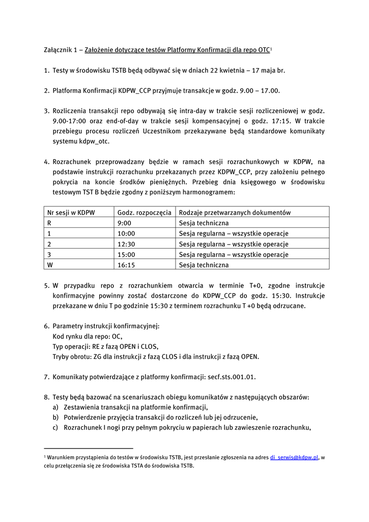 Załącznik 1 – Założenie dotyczące testów Platformy Konfirmacji dla repo OTC1 1. Testy w środowisku TSTB będą odbywać się w dniach 22 kwietnia – 17 maja br. 2. Platforma Konfirmacji KDPW_CCP przyjmuje transakcje w godz. 9.00 – 17.00. 3. Rozliczenia transakcji repo odbywają się intra-day w trakcie sesji rozliczeniowej w godz. 9.00-17:00 oraz end-of-day w trakcie sesji kompensacyjnej o godz. 17:15. W trakcie przebiegu procesu rozliczeń Uczestnikom przekazywane będą standardowe komunikaty systemu kdpw_otc. 4. Rozrachunek przeprowadzany będzie w ramach sesji rozrachunkowych w KDPW, na podstawie instrukcji rozrachunku przekazanych przez KDPW_CCP, przy założeniu pełnego pokrycia na koncie środków pieniężnych. Przebieg dnia księgowego w środowisku testowym TST B będzie zgodny z poniższym harmonogramem: Nr sesji w KDPW Godz. rozpoczęcia Rodzaje przetwarzanych dokumentów R 9:00 Sesja techniczna 1 10:00 Sesja regularna – wszystkie operacje 2 12:30 Sesja regularna – wszystkie operacje 3 15:00 Sesja regularna – wszystkie operacje W 16:15 Sesja techniczna 5. W przypadku repo z rozrachunkiem otwarcia w terminie T+0, zgodne instrukcje konfirmacyjne powinny zostać dostarczone do KDPW_CCP do godz. 15:30. Instrukcje przekazane w dniu T po godzinie 15:30 z terminem rozrachunku T +0 będą odrzucane. 6. Parametry instrukcji konfirmacyjnej: Kod rynku dla repo: OC, Typ operacji: RE z fazą OPEN i CLOS, Tryby obrotu: ZG dla instrukcji z fazą CLOS i dla instrukcji z fazą OPEN. 7. Komunikaty potwierdzające z platformy konfirmacji: secf.sts.001.01. 8. Testy będą bazować na scenariuszach obiegu komunikatów z następujących obszarów: a) Zestawienia transakcji na platformie konfirmacji, b) Potwierdzenie przyjęcia transakcji do rozliczeń lub jej odrzucenie, c) Rozrachunek I nogi przy pełnym pokryciu w papierach lub zawieszenie rozrachunku, Warunkiem przystąpienia do testów w środowisku TSTB, jest przesłanie zgłoszenia na adres [email protected], w celu przełączenia się ze środowiska TSTA do środowiska TSTB. 1 d) Rozrachunek II nogi przy pełnym pokryciu w papierach lub zawieszenie rozrachunku 9. Adres do korespondencji w trakcie testów: [email protected] 10. Lista obligacji dla transakcji objętych gwarancjami rozrachunku (ze wskazaniem terminu zamknięcia transakcji repo): PL0000102646 - kończące się max 18 września 2013 PL0000102836 - kończące się max 21 października 2013 PL0000104543 - kończące się max 22 października 2013 PL0000105441 - kończące się max 22 października 2013 PL0000106126 - kończące się max 23 października 2013 PL0000106670 - kończące się max 23 października 2013 PL0000106712 - kończące się max 23 stycznia 2014 PL0000106795 - kończące się max 23 października 2013 PL0000107264 - kończące się max 23 października 2013