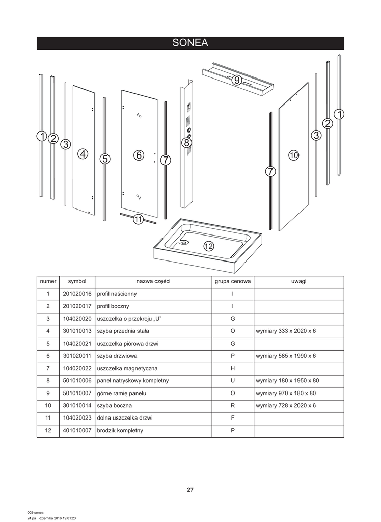 SONEA 9 1 2 1 2 3 8 3 4 5 6 10 7 7 11 12 numer symbol nazwa części grupa cenowa 1 201020016 profil naścienny I 2 201020017 profil boczny I 3 104020020 uszczelka o przekroju „U” G 4 301010013 szyba przednia stała O 5 104020021 uszczelka piórowa drzwi G 6 301020011 P 7 104020022 uszczelka magnetyczna H 8 501010006 panel natryskowy kompletny U wymiary 180 x 1950 x 80 9 501010007 górne ramię panelu O wymiary 970 x 180 x 80 10 301010014 szyba boczna R wymiary 728 x 2020 x 6 11 104020023 dolna uszczelka drzwi F 12 401010007 brodzik kompletny P szyba drzwiowa 27 005-sonea 24 pa uwagi dziernika 2016 19:01:23 wymiary 333 x 2020 x 6 wymiary 585 x 1990 x 6 Sonea 1 2 3 4 5 6 7 8 9 10 11 12 13 14 15 16 17 18 19 20 numer symbol nazwa części grupa cenowa 1 105010017 dysza masażowa końcowa H przyłącze na opaskę zaciskową 2 105010018 dysza masażowa środkowa H przyłącze 1/2" 3 501020006 korpus ramienia panelu L wymaga potwierdzenia dostępności 4 102050008 trójnik - tworzywo B 5 604010005 lampa LED H białe światło 6 604030003 głośnik I głośnik podwójny 7 802010004 osłona głośnika E 8 601010008 panel sterujący O 9 502010004 uchwyt panelu sterującego C 10 502010009 uchwyt dyszy natryskowej C 11 102050006 kolanko węża - tworzywo B 12 702020005 uchwyt drzwi G 13 102050009 przyłącze węża natryskowego E 14 105010019 słuchawka natryskowa G 15 105020004 wąż natryskowy F 1/2" x 1/2" L1500 16 501020005 korpus panelu natryskowego O wymaga potwierdzenia dostępności 17 106010005 bateria kompletna N rozstaw 100 18 103010001 głowica mieszacza - 40 mm G 19 103020010 głowica przełącznika funkcji G 20 101030027 uchwyt mieszacza G 28 005-sonea 24 pa uwagi dziernika 2016 19:01:24 szary front średnica 34, wysokość 71 (73) Sonea 1 2 3 4 5 6 7 8 9 10 11 12 13 14 15 16 17 18 19 20 numer symbol nazwa części grupa cenowa 1 101030028 uchwyt przełącznika funkcji F 2 102020020 rozeta mieszacza E 3 102020021 rozeta przełącznika E 4 102040015 osłona głowicy E 5 102030018 wąż połączeniowy dyszy górnej (deszczownicy) F długość 150 cm 6 102030019 wąż połączeniowy dysz panelu D długość 65 i 50 cm 7 102030020 wąż połączeniowy zestawu natryskowego E długość 55 cm 8 102060001 opaska zaciskowa B 9 502010007 wieszak panelu B 10 502010008 śruba montażowa ramienia panelu B 11 702020008 uchwyt szyby dolny H 12 702020009 uchwyt szyby przedniej I 13 502010010 uchwyt ścienny panelu I 14 702010014 zawias M rozstaw otworów 63 x 30, wymiary 95 x 55 15 105050006 syfon J f 90 16 603010001 zasilacz I 17 701010008 zestaw wkrętów/śrub do montażu kabiny E 18 701020002 nakrętka 1/2" z kołnierzem - tworzywo A 19 902010006 zestaw montażowy kabiny O 20 403010156 zestaw montażowy brodzika I 29 005-sonea 24 pa uwagi dziernika 2016 19:01:24 gniazdo na wieloklin bez zestawu brodzika; rysunek poglądowy rysunek poglądowy Sonea 1 2 3 4 5 6 7 8 9 10 numer 1 symbol nazwa części grupa cenowa 105050035 pokrywa syfonu uwagi G 2 3 4 5 6 7 8 9 10 Sonea - paczki - wymaga potwierdzenia dostępności symbole nazwa częsci grupa cenowa 8006059075481029730101 paczka 1/4 Sonea R brodzik, syfon 8006059075481057760103 paczka 2/4 Sonea R szyba boczna 8006059075481051030203 paczka 3/4 Sonea X panel natryskowy, górne ramię, akcesoria/zestaw montażowy 8006059075481057760303 paczka 4/4 Sonea U szyba przednia, szyba drzwiowa, profile, uszczelki 30 005-sonea 24 pa uwagi dziernika 2016 19:01:24