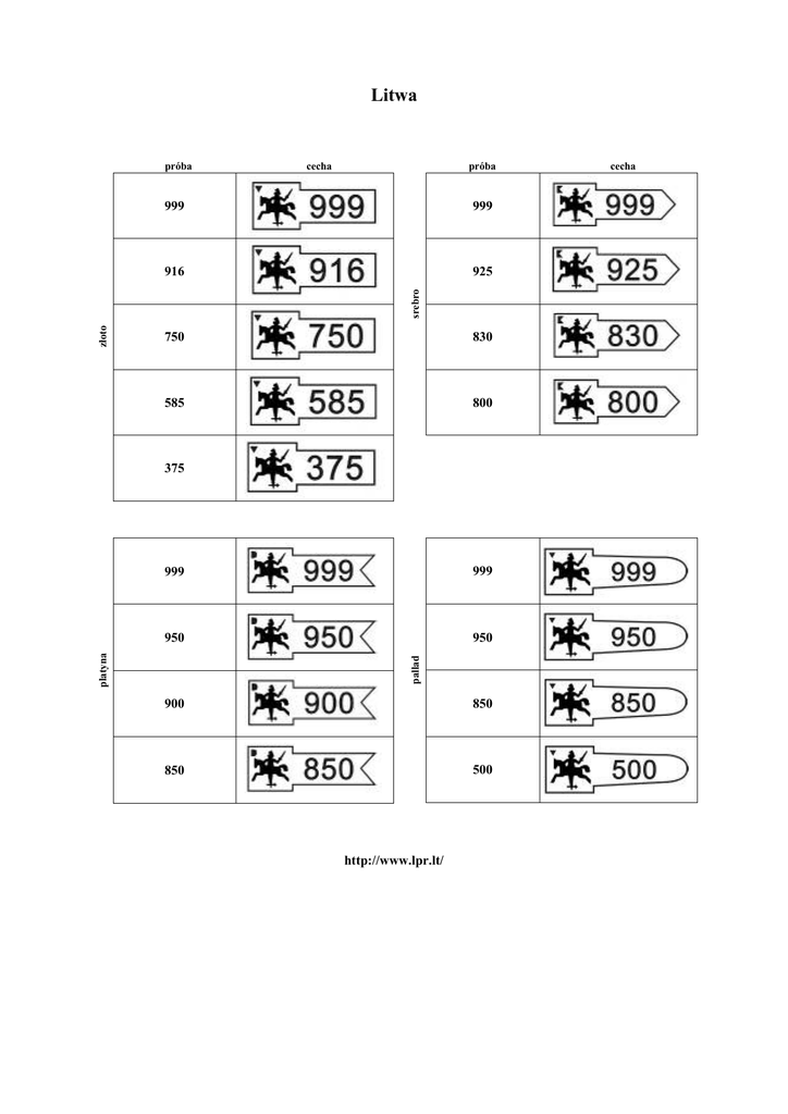 Litwa próba cecha próba 999 916 925 z oto srebro 999 750 830 585 800 375 999 950 950 pallad platyna 999 900 850 850 500 http://www.lpr.lt/ cecha