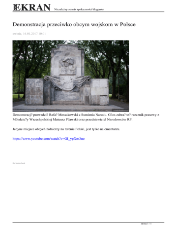 Niezależny serwis społeczności blogerów Demonstracja przeciwko obcym wojskom w Polsce ewinia, 16.01.2017 10:01 Demonstracj? prowadzi? Rafa? Mossakowski z Sumienia Narodu. G?os zabra? te? rzecznik prasowy z M?odzie?y Wszechpolskiej Mateusz P?awski oraz przedstawiciel Narodowców RP. Jedyne miejsce obcych żołnierzy na terenie Polski, jest tylko na cmentarzu. https://www.youtube.com/watch?v=GI_ypXes3uo film: Sumienie Narodu strona 1 / 1 Powered by TCPDF (www.tcpdf.org)