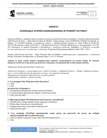PROJEKT WSPÓŁFINANSOWANY ZE ŚRODKÓW UNII EUROPEJSKIEJ W RAMACH EUROPEJSKIEGO FUNDUSZU SPOŁECZNEGO „Człowiek – najlepsza inwestycja” ANKIETA OCENIAJĄCA STOPIEŃ ZAANGAŻOWANIA W POWRÓT DO PRACY Szanowni Państwo, niniejsza ankieta została stworzona na potrzeby procesu rekrutacji w ramach realizacji projektu „Mój Powrót do Pracy – Moje Dziecko Idzie do Żłobka” realizowanego przez EUROSOLUTIONS Jan Dymek, ul. Piekary 12, 64-800 Chodzież, na podstawie umowy o dofinansowanie projektu nr UDA POKL.01.05.00–00267/12–00 zawartej w dniu 19.02.2013 r. z Ministerstwem Pracy i Polityki Społecznej, ul. Nowogrodzka 1/3/5, 00513 Warszawa, w ramach Priorytetu I Zatrudnienie i integracja społeczna, Działania 1.5 Wsparcie rozwiązań na rzecz godzenia życia zawodowego i rodzinnego Programu Operacyjnego Kapitał Ludzki 2007 - 2013. Projekt „Mój Powrót do Pracy – Moje Dziecko Idzie do Żłobka” realizowany jest w partnerstwie z „Owocową Krainą” Karolina Chwiałkowska, ul. Romana Maya 1, 61-371 Poznań. Ankieta ta służy ocenie stopnia zaangażowania rodziców zamieszkałych na terenie Gminy M. Poznań, chcących wrócić na rynek pracy po przerwie związanej z urodzeniem lub wychowaniem dziecka. Ankieta jest skierowana do kobiet i mężczyzn. Ankieta jest dostępna w wersji papierowej w Biurze Projektu, w Oddziale Partnera – Żłobku „Malinowa Kraina” oraz w wersji elektronicznej do pobrania ze strony: www.jagodowa-kraina.pl Wymagane jest udzielenie odpowiedzi na wszystkie pytania. Ankietę należy wypełnić w sposób czytelny. 1. Czy pragnie Pan /Pani powrócić do pracy? [ ] Tak [ ] Nie po przerwie związanej z: [ ] urodzeniem dziecka (po urlopie macierzyńskim) [ ] wychowaniem dziecka (po urlopie wychowawczym) [ ] inny powód, jaki?……………………………………………………………………………………….. 2. Dlaczego pragnie Pan/Pani powrócić do pracy zawodowej? [ ] Dzięki pracy mogę spełnić swoje aspiracje zawodowe [ ] Praca daje mi poczucie niezależności [ ] Pragnę pracować z powodów finansowych [ ] Inny powód, jaki? ……………………………………………………………………………………… 3. Czy oczekuje Pan/Pani ograniczenia czasu pracy po powrocie do pracy po urlopie macierzyńskim lub wychowawczym? [ ] Tak (w jakim wymiarze czasu chce Pan/Pani pracować?)…………………………………………….. [ ] Nie EUROSOLUTIONS Tytuł projektu „Mój Powrót do Pracy – Moje Dziecko Idzie do Żłobka” Priorytet I, Działanie 1.5 Realizator projektu: EUROSOLUTIONS, 64-800 Chodzież, ul. Piekary 12 PROJEKT WSPÓŁFINANSOWANY ZE ŚRODKÓW UNII EUROPEJSKIEJ W RAMACH EUROPEJSKIEGO FUNDUSZU SPOŁECZNEGO „Człowiek – najlepsza inwestycja” 4. Jakie rozwiązania pomogłyby wrócić Panu/Pani do pracy po narodzinach dziecka? [ ] dostęp do niedrogiej i wykwalifikowanej opieki nad dziećmi [ ] elastyczne formy zatrudnienia [ ] elastyczne formy organizacji czasu pracy [ ] pomoc partnera w opiece nad dzieckiem [ ] pomoc rodziny w opiece nad dzieckiem [ ] korzystanie z przysługujących uprawnień pracowniczych zawartych w Kodeksie Pracy [ ] pomoc ze strony pracodawcy, jaka?......................................................................................................... [ ] elastyczniejsze godziny otwarcia placówek opieki na dzieckiem [ ] inne czynniki, jakie? …………………………………………………………………………………… 5. Proszę powiedzieć co Panu/Pani utrudniło powrót do pracy po narodzinach dziecka? [ ] brak możliwości zapewnienia dziecku odpowiedniej opieki [ ] brak miejsca w placówkach opieki [ ] godziny funkcjonowania placówki nie odpowiadają moim potrzebom [ ] zbyty wysokie koszty opieki nad dzieckiem [ ] niechęć do opuszczenia dziecka na tak długi czas [ ] niemożność połączenia pracy z opieką i wychowaniem dziecka [ ] nieprzestrzeganie uprawnień pracowniczych dla młodych matek zawartych w Kodeksie Pracy [ ] brak możliwości korzystania z elastycznych form zatrudnienia [ ] brak możliwości korzystania z elastycznej organizacji czasu pracy [ ] brak zaangażowania partnera lub jest ono za małe [ ] inne, jakie? …………………………………………………………………………………………….. 6. Idealną sytuację opisuje wg Pana/Pani zdanie: [ ] Kobieta nie pracuje zawodowo, zajmuję się rodziną, a rodzinę utrzymuje mąż/partner [ ] Aktywność zawodowa podporządkowana jest rodzinie, gdy zajdzie taka potrzeba rezygnuje Pani całkowicie z pracy zawodowej na jakiś czas [ ] Aktywność zawodowa kobiety podporządkowana jest rodzinie, gdy zajdzie taka potrzeba ogranicza ona czas poświęcony pracy i np. podejmuje Pani pracę na niepełny etat [ ] Oboje rodzice pracują zawodowo, a jednocześnie kobieta obciążona jest pracą w domu [ ] Oboje rodzice pracują zawodowo, i oboje dzielą między siebie obowiązki domowe …..……………………………………… MIEJSCOWOŚĆ I DATA ……...……………………………………………………… CZYTELNY PODPIS KANDDATA/KANDYDATKI* *niepotrzebne skreślić EUROSOLUTIONS Tytuł projektu „Mój Powrót do Pracy – Moje Dziecko Idzie do Żłobka” Priorytet I, Działanie 1.5 Realizator projektu: EUROSOLUTIONS, 64-800 Chodzież, ul. Piekary 12
