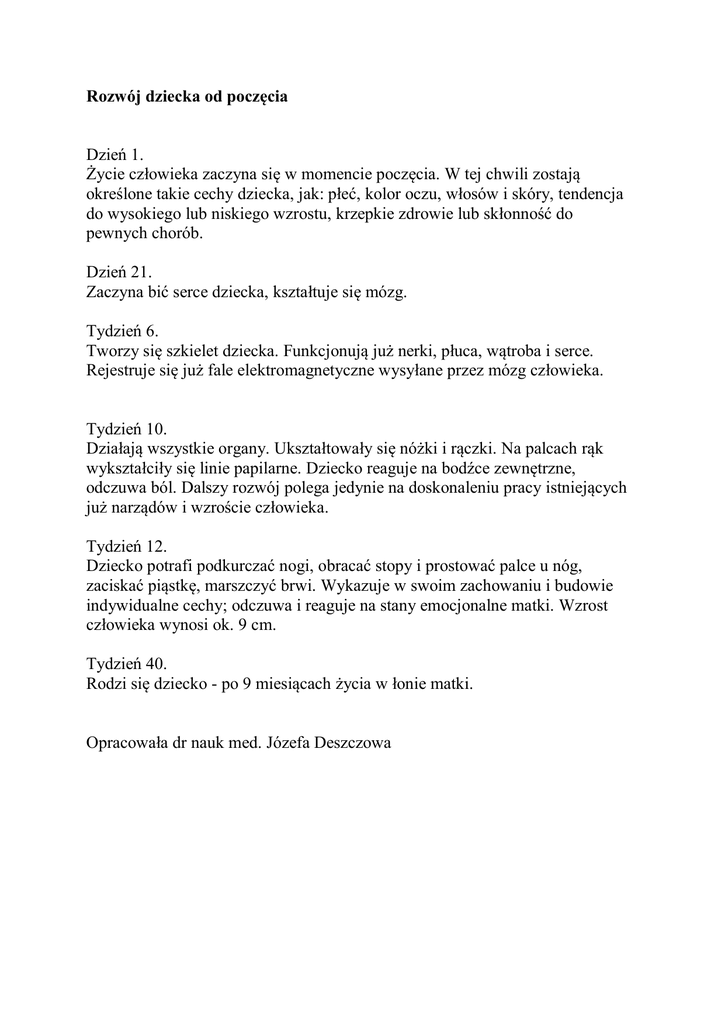 Rozwój dziecka od poczęcia Dzień 1. Życie człowieka zaczyna się w momencie poczęcia. W tej chwili zostają określone takie cechy dziecka, jak: płeć, kolor oczu, włosów i skóry, tendencja do wysokiego lub niskiego wzrostu, krzepkie zdrowie lub skłonność do pewnych chorób. Dzień 21. Zaczyna bić serce dziecka, kształtuje się mózg. Tydzień 6. Tworzy się szkielet dziecka. Funkcjonują już nerki, płuca, wątroba i serce. Rejestruje się już fale elektromagnetyczne wysyłane przez mózg człowieka. Tydzień 10. Działają wszystkie organy. Ukształtowały się nóżki i rączki. Na palcach rąk wykształciły się linie papilarne. Dziecko reaguje na bodźce zewnętrzne, odczuwa ból. Dalszy rozwój polega jedynie na doskonaleniu pracy istniejących już narządów i wzroście człowieka. Tydzień 12. Dziecko potrafi podkurczać nogi, obracać stopy i prostować palce u nóg, zaciskać piąstkę, marszczyć brwi. Wykazuje w swoim zachowaniu i budowie indywidualne cechy; odczuwa i reaguje na stany emocjonalne matki. Wzrost człowieka wynosi ok. 9 cm. Tydzień 40. Rodzi się dziecko - po 9 miesiącach życia w łonie matki. Opracowała dr nauk med. Józefa Deszczowa